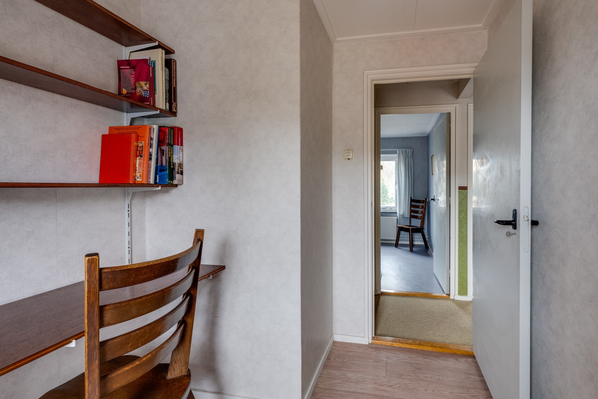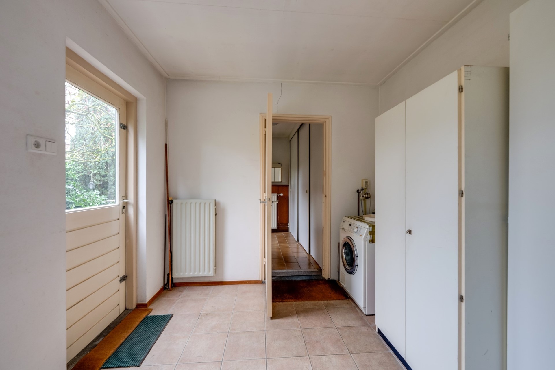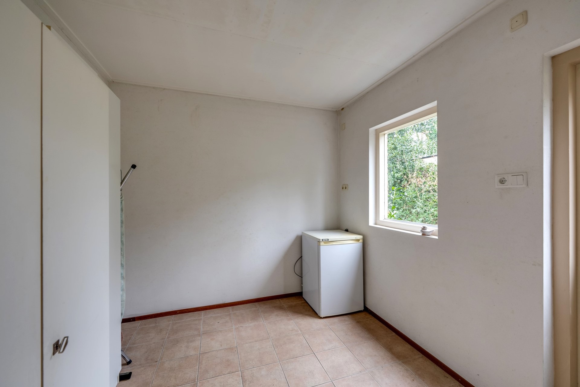 Deze ruimte (3,49 m. x 2,70 m.) is als kantoor, berging of speelruimte in te richten. U vindt hier extra wasaansluitingen. Er ligt een tegelvloer en het hardhouten kozijn is v.v. enkel glas. Via een deur is de achtertuin te bereiken.