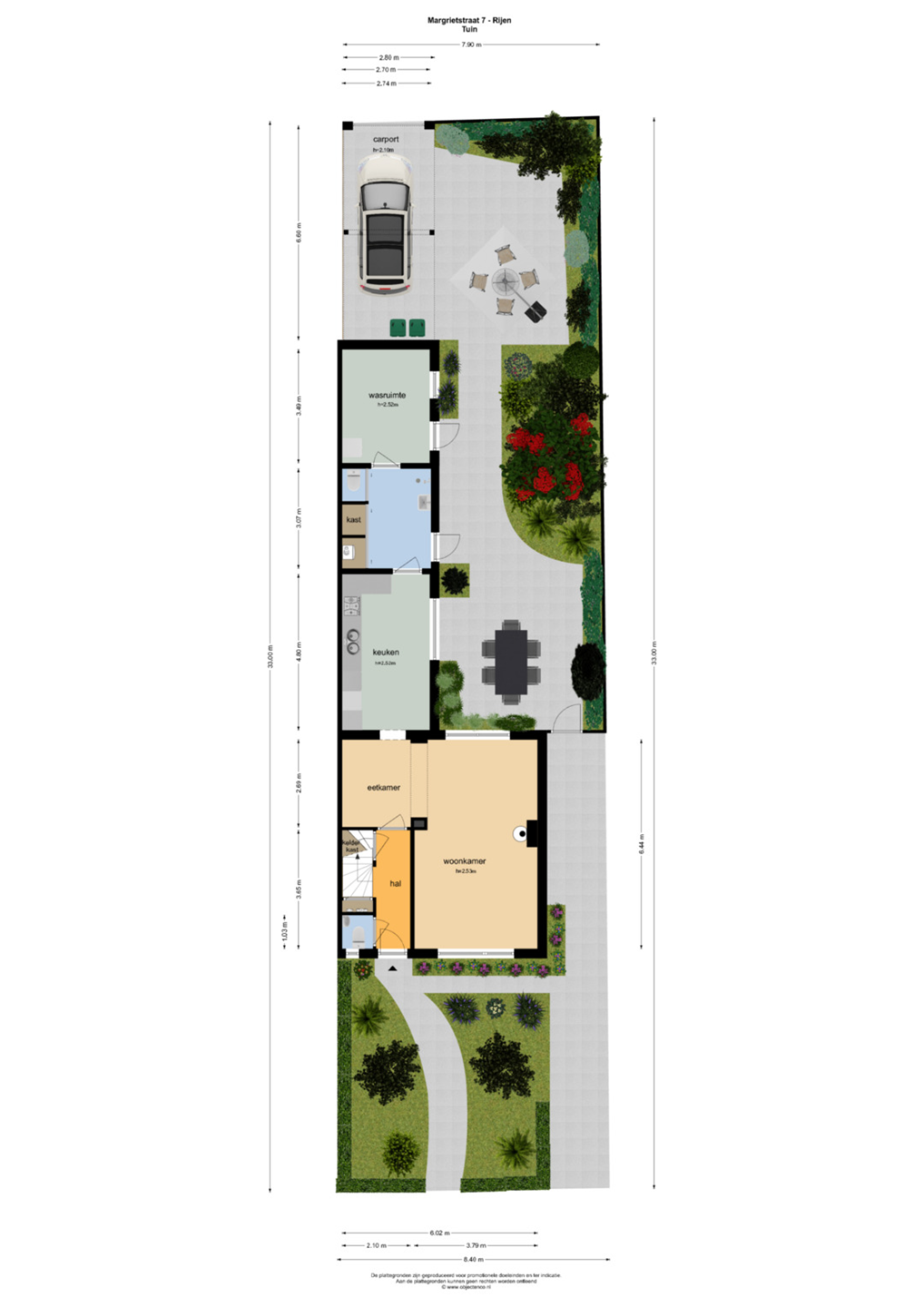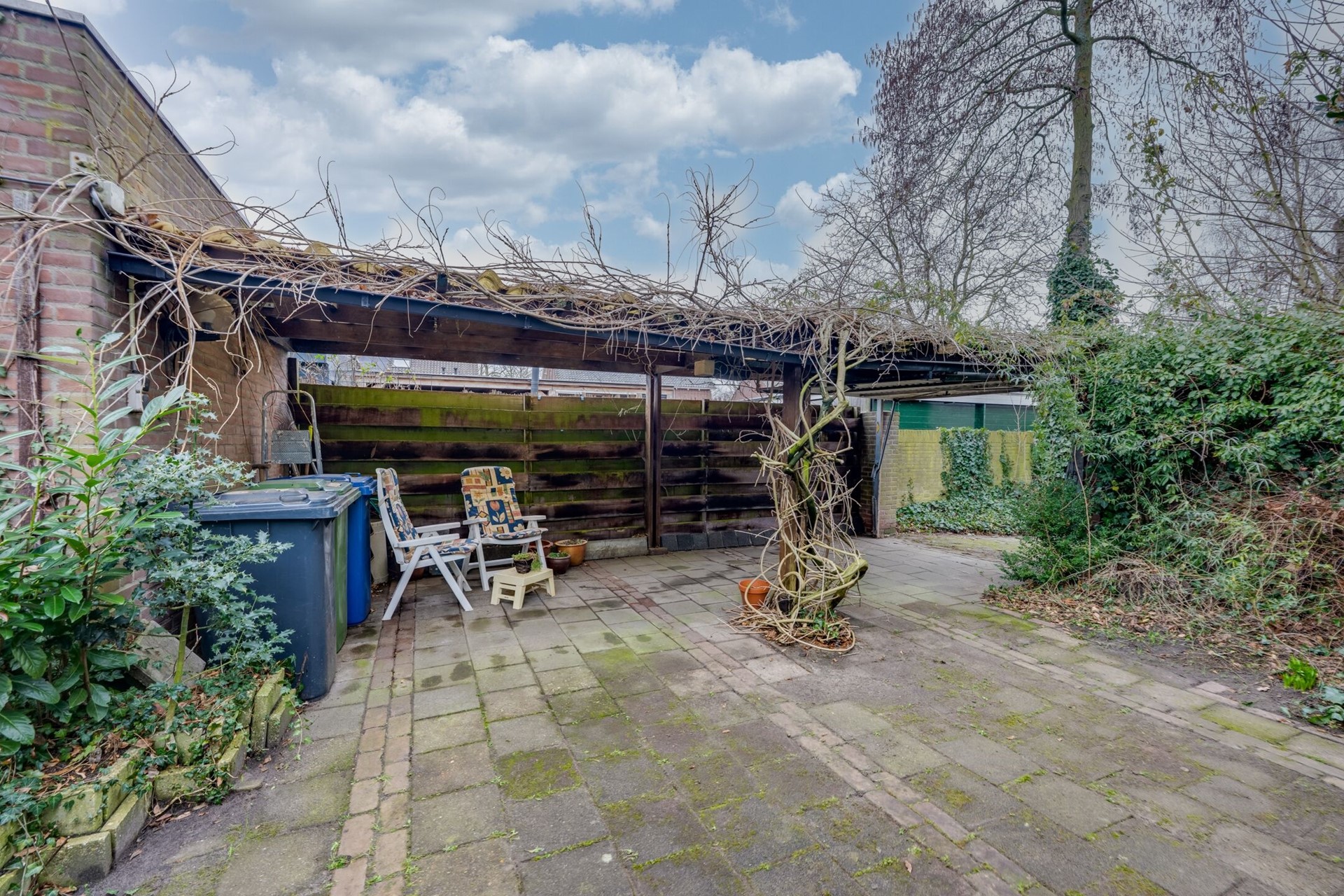 De diepe achtertuin (18,50 m. x 7,90/5,10 m.) is v.v. bestrating ,diverse bomen en vaste beplanting. Aan de straatzijde vindt u een looppoort en aan de achterzijde van de tuin is een carport met een stalen kanteldeur. Voor de kanteldeur heeft u een eigen parkeerplaats.