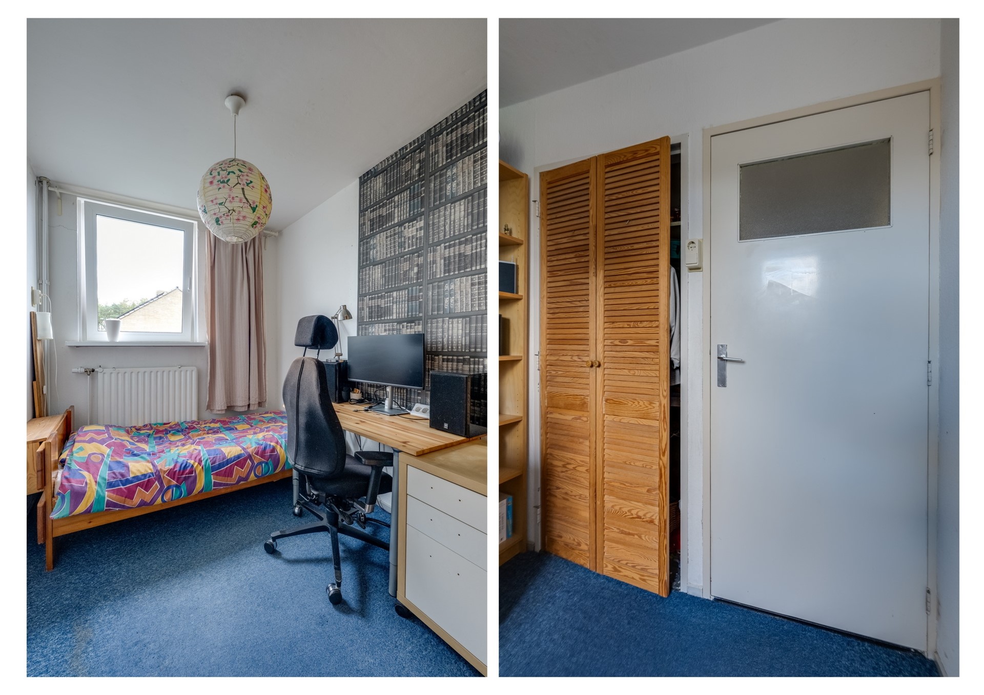Deze slaapkamer (2,80 m. x 2,20 m.) ligt aan de achterzijde van de woning. Er is een inbouwkast. Er ligt vloerbedekking en het kunststof kozijn is v.v. dubbel HR++ glas.
