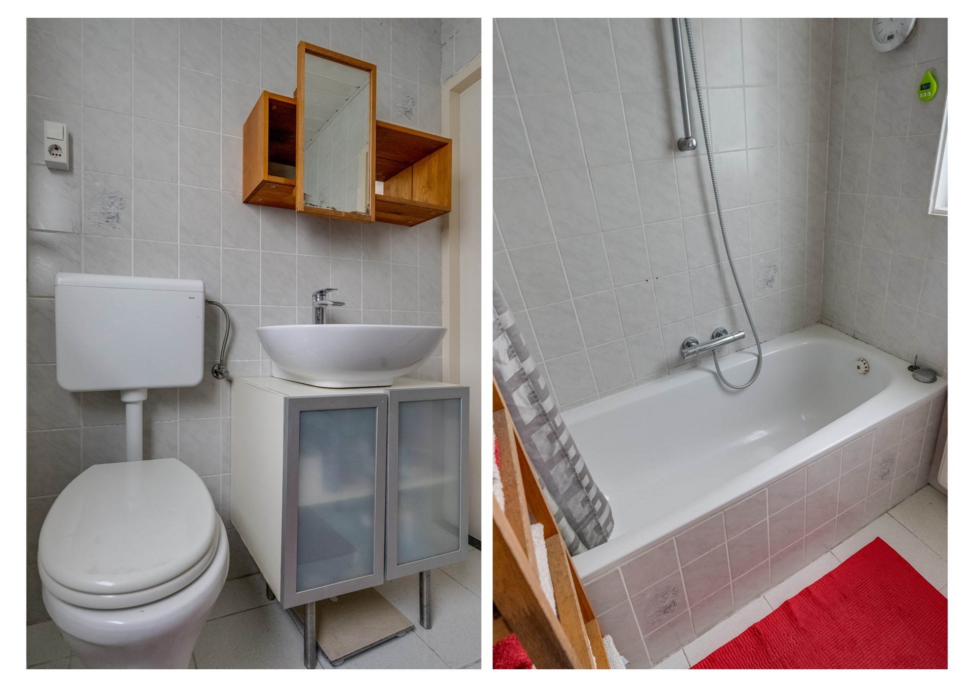 De badkamer (2,15 m. x 1,81 m.) ligt aan de voorzijde van de woning. Er is ligbad, een wastafel en een staand toilet. De badkamer is geheel betegeld. Het kunststof kozijn is v.v. HR++ melkglas.