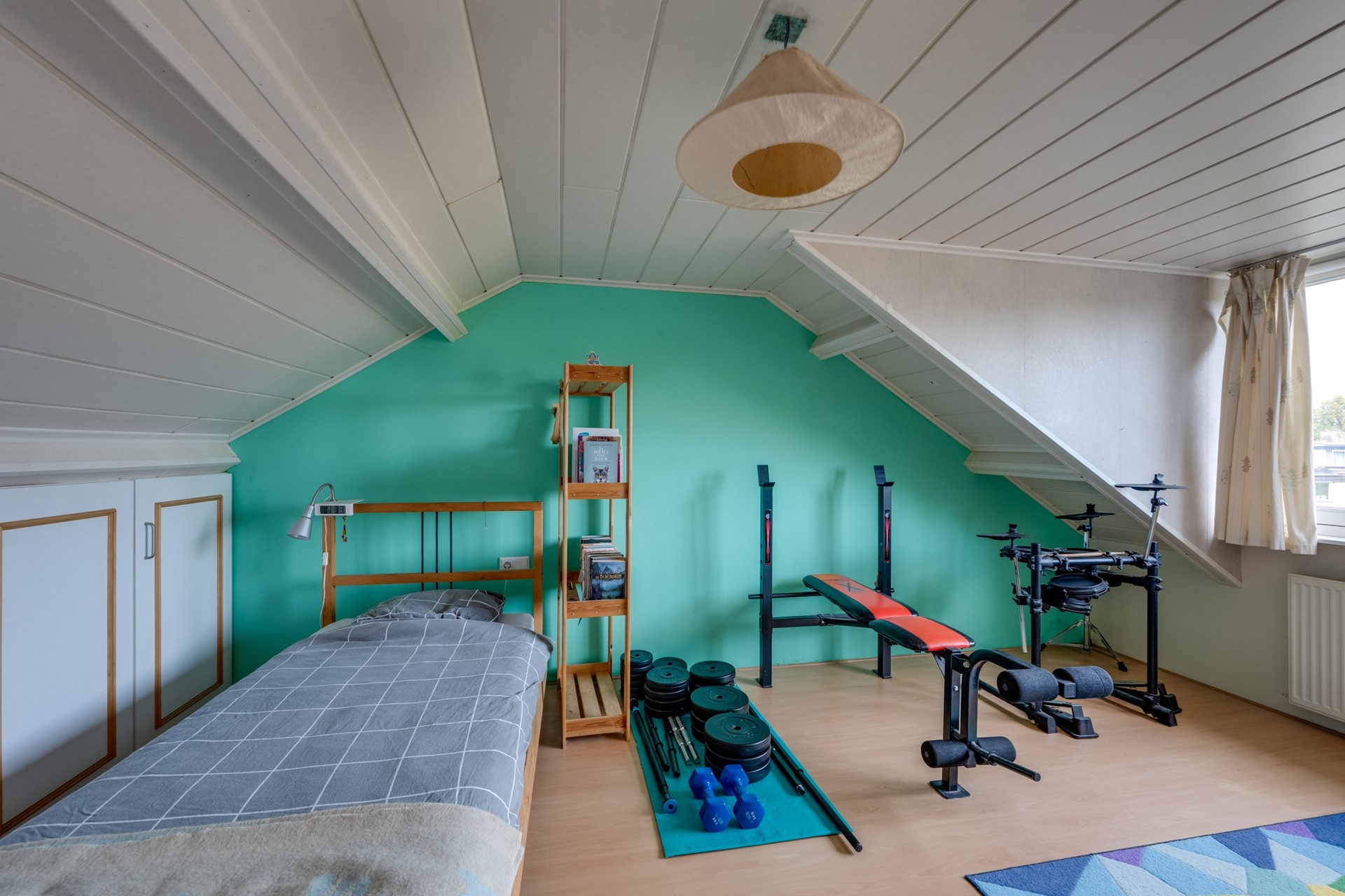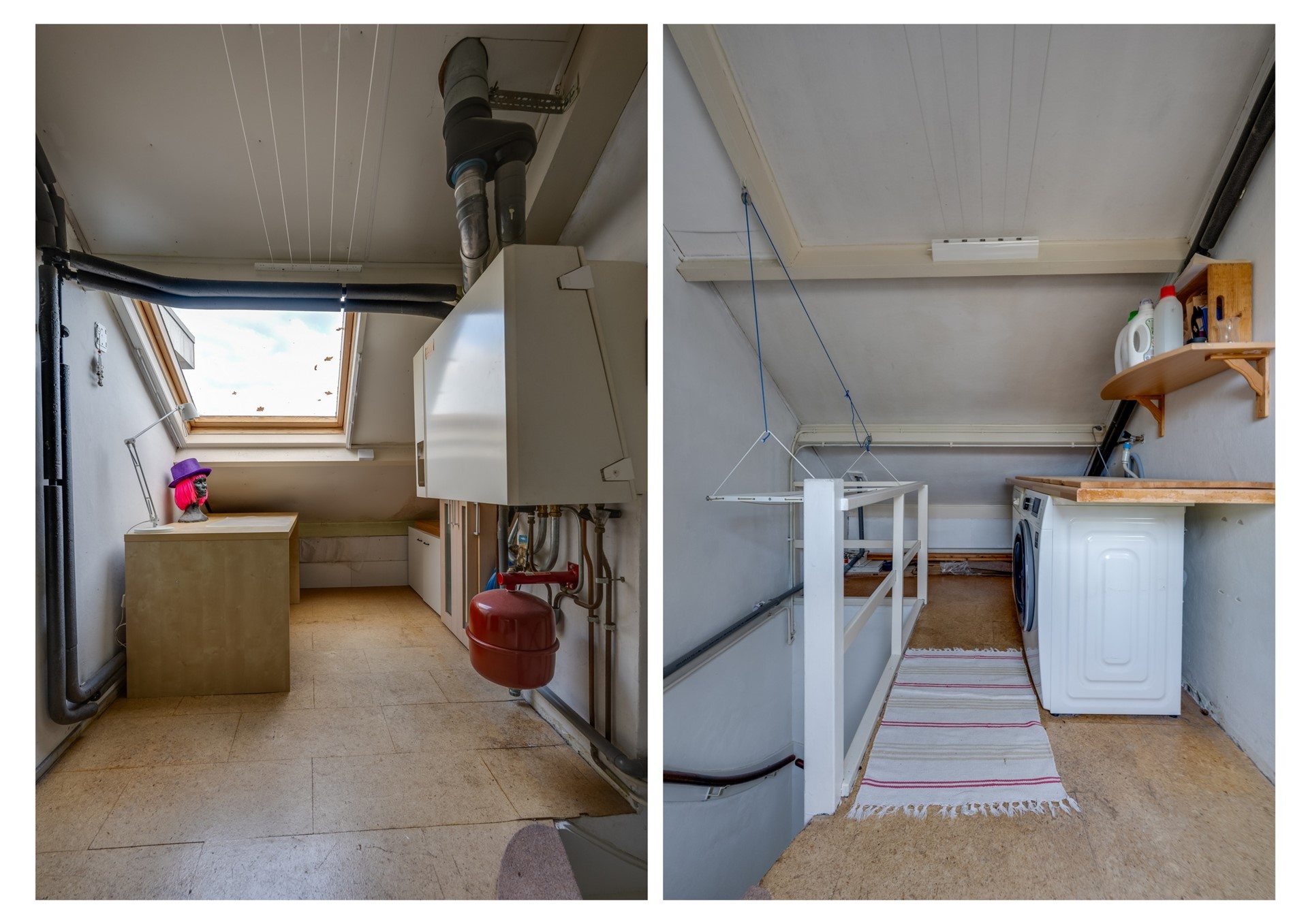 Via een vaste houten trap komt u op de bovenste verdieping. Hier vindt u de voorzolder (6,10 m. x 2,20 m.) met de aansluitingen voor uw wasapparatuur en de cv-ketel (Nefit Ecomline 1999). Er hangt een Velux dakraam v.v. dubbel glas.
