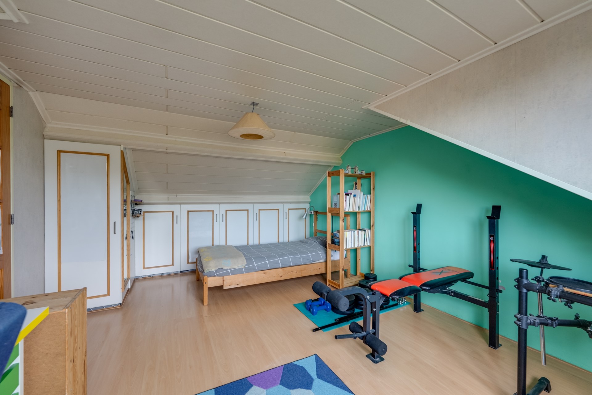 Deze kamer (4,90 m. x 3,66 m.) heeft een dakkapel aan de achterzijde v.v. een houten kozijn met dubbel glas. Achter de knieschotten vindt u extra bergruimte.