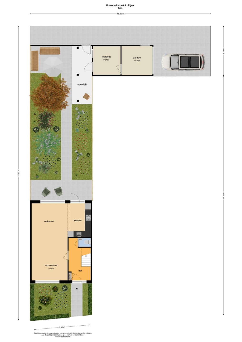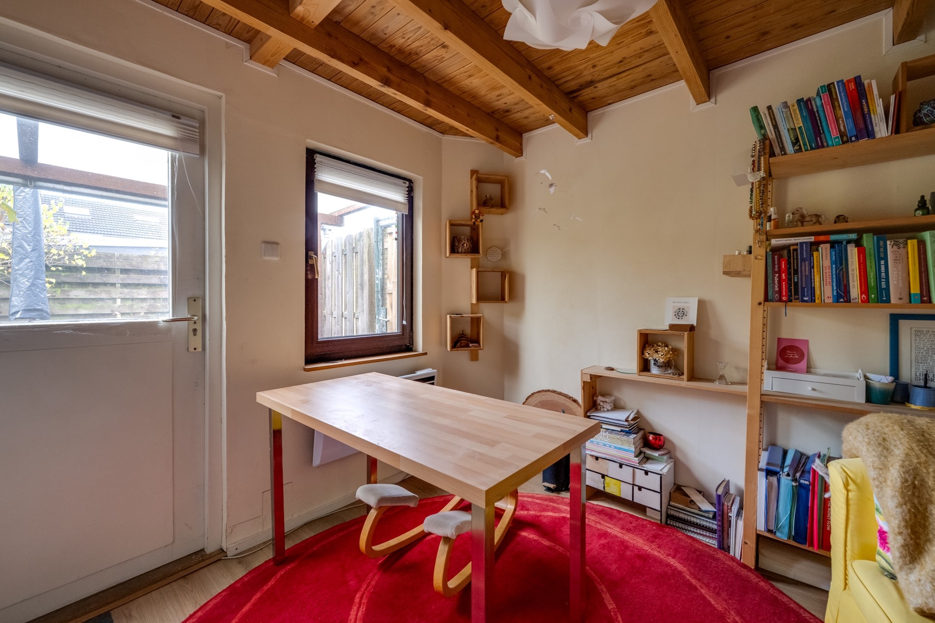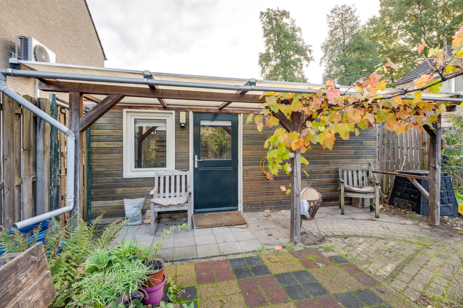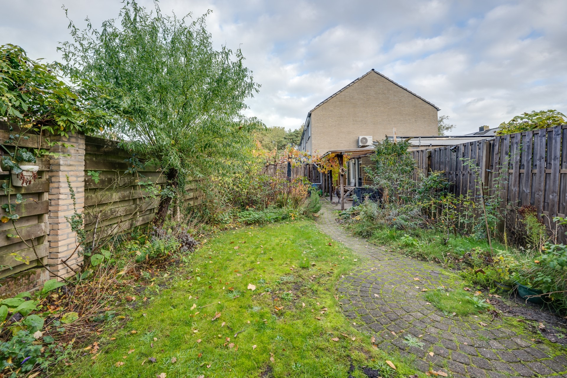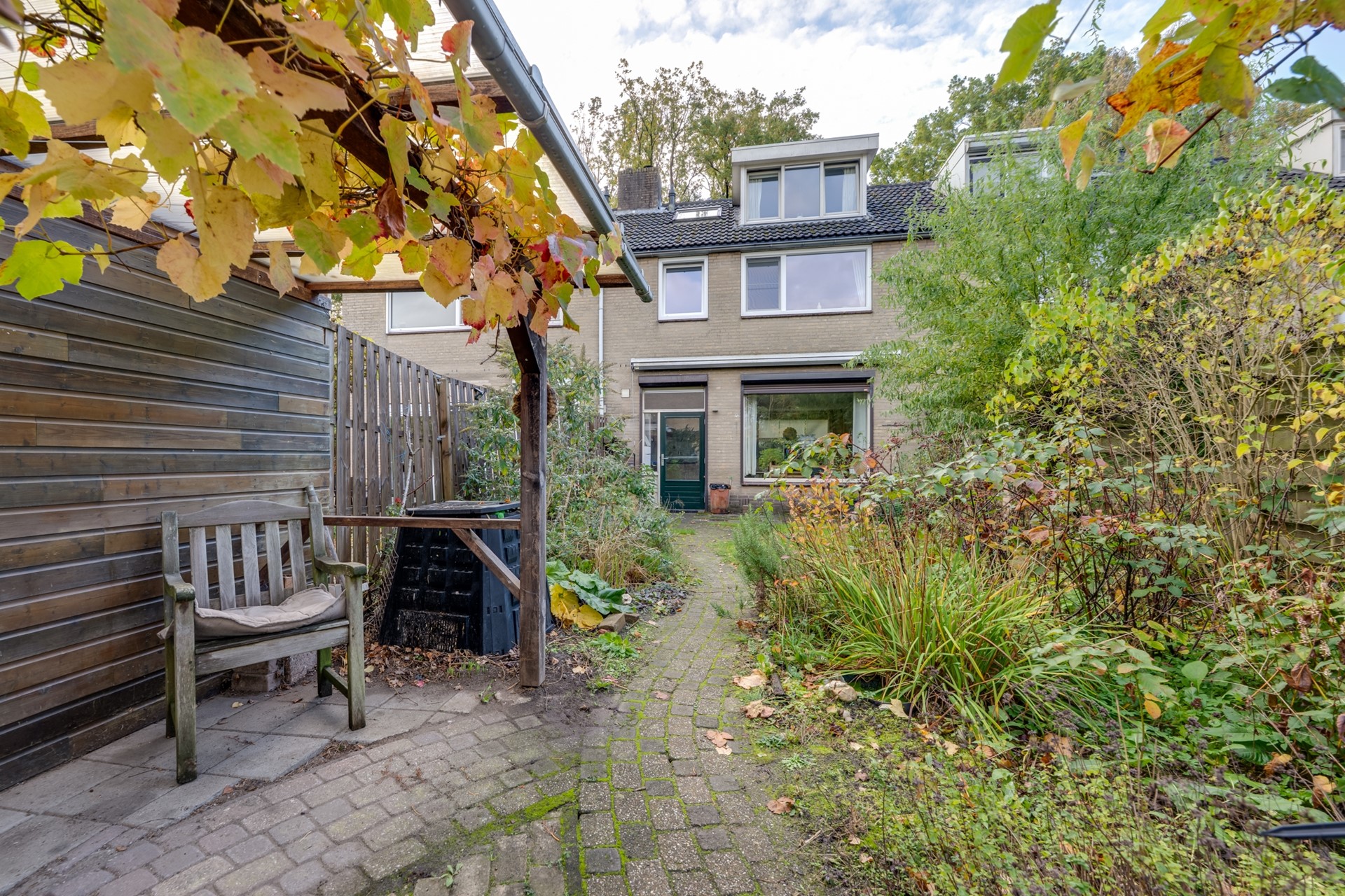 De groene achtertuin (ca. 20 m. x 6 m.) is v.v. sierbestrating, vaste beplanting en aan de achterzijde van de woning hangt een zonnescherm. Verder staat er een stenen garage. De tuin is ook achterom via een poort te bereiken.
