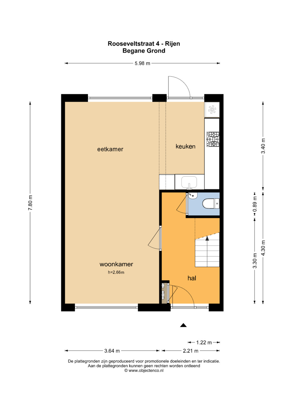 De half open keuken (3,40 m. x 2,21 m.) ligt aan de achterzijde van de woning en bestaat uit een keukenblok in hoekopstelling voorzien van een 4- pits gaskookplaat, een oven, een rvs afzuigkap en enkele gootsteen. De houten vloer is doorgetrokken naar de keuken. Vanuit de keuken kunt u naar de achtertuin.