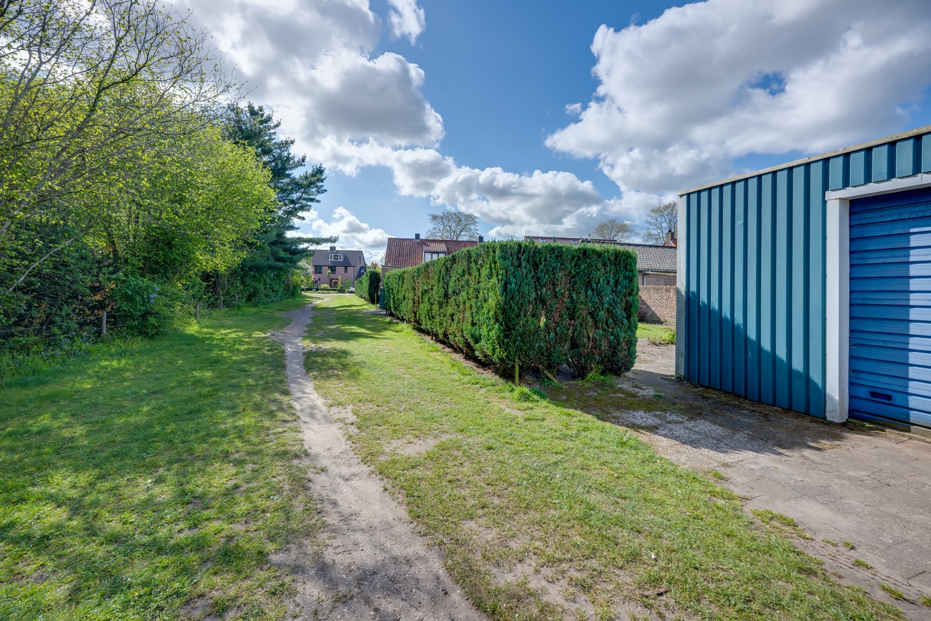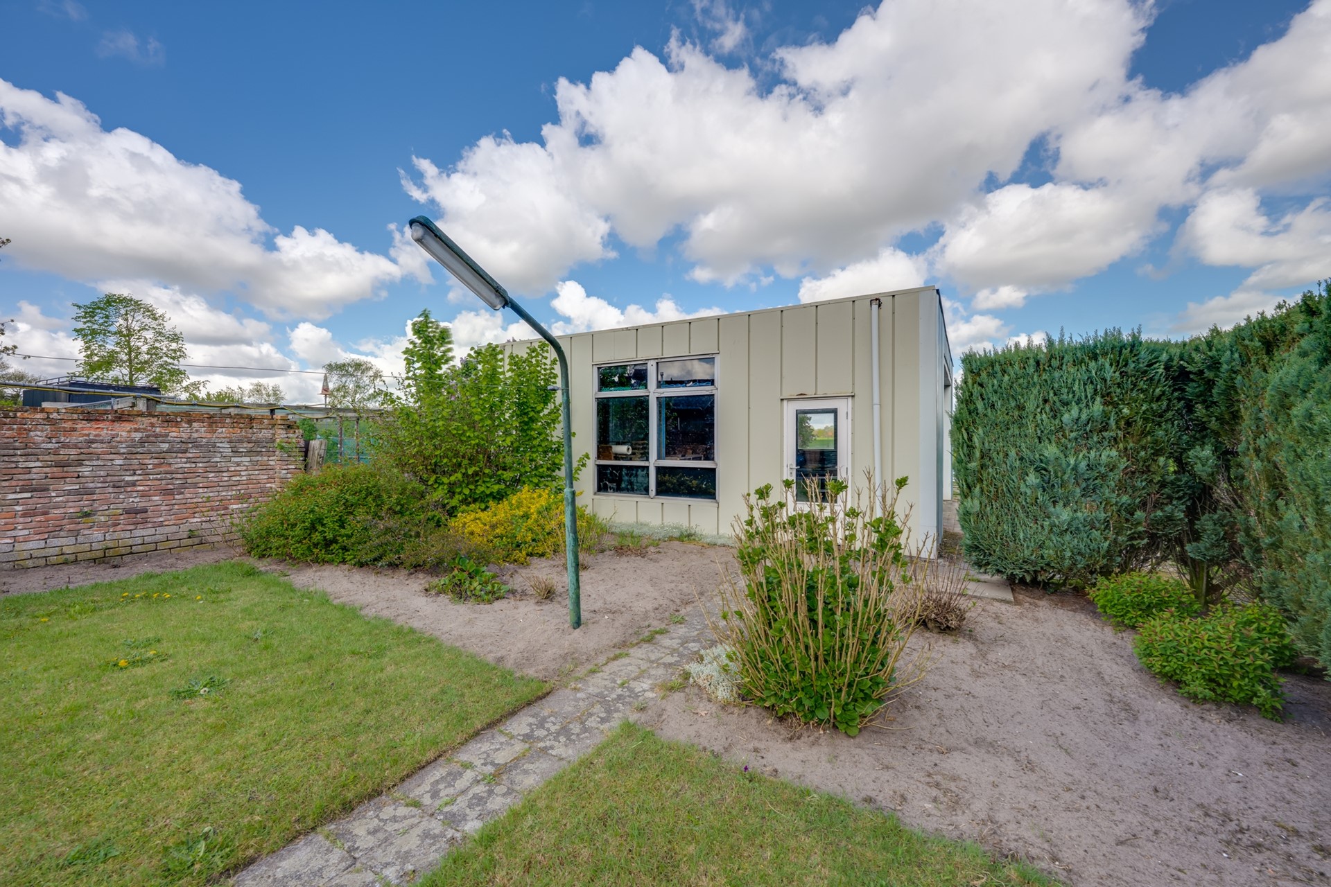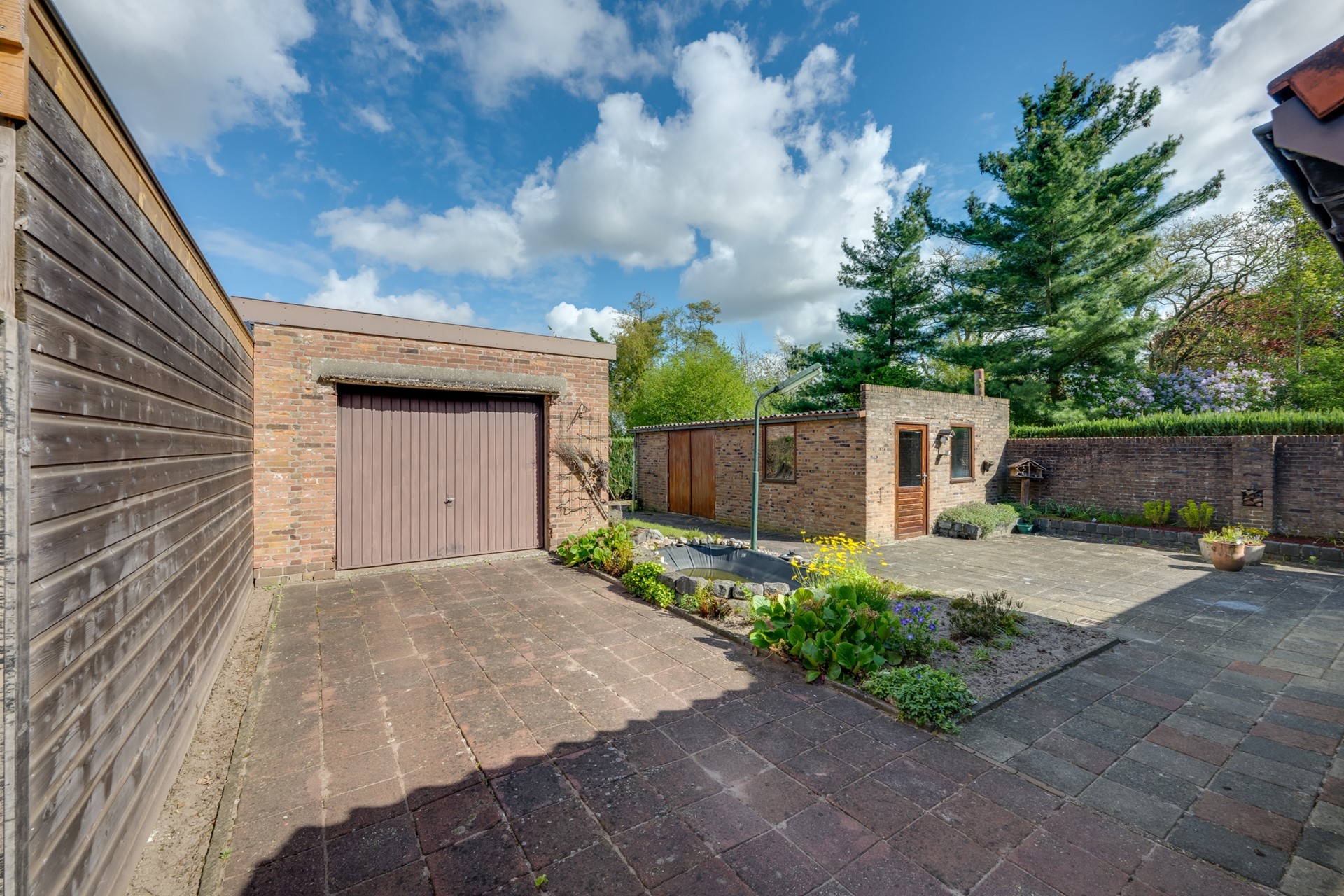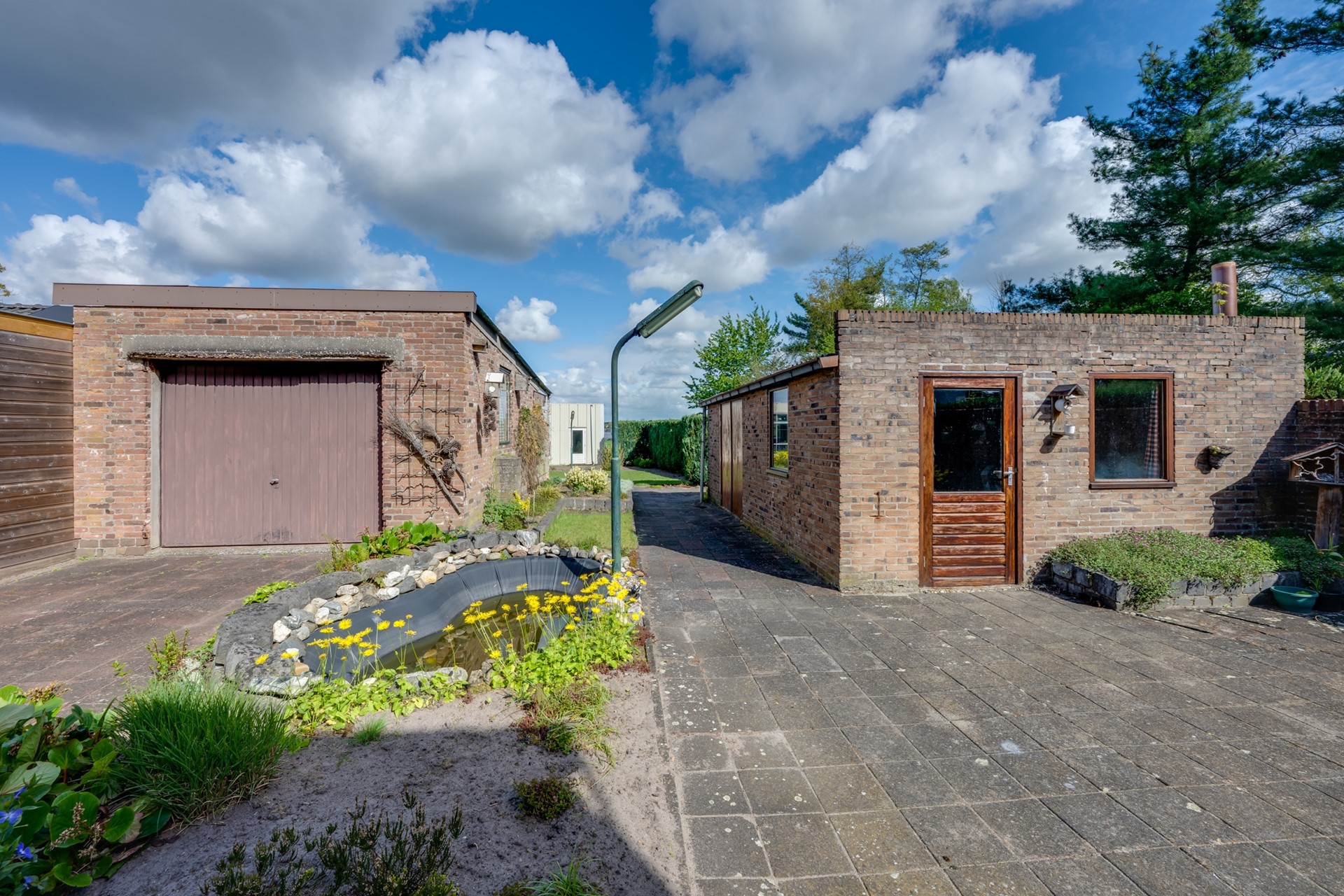 De achtertuin (zie plattegronden voor de juiste afmetingen) heeft een garage met berging, een schuur en een loods. Er is een terras met vijver en vaste beplanting direct achter de woning. Halverwege vindt u een gazon. Via de pad, aan de rechterzijde van de woning, kunt u de tuin op meerdere punten ingaan. Achter de loods ligt nog een deel van het perceel.