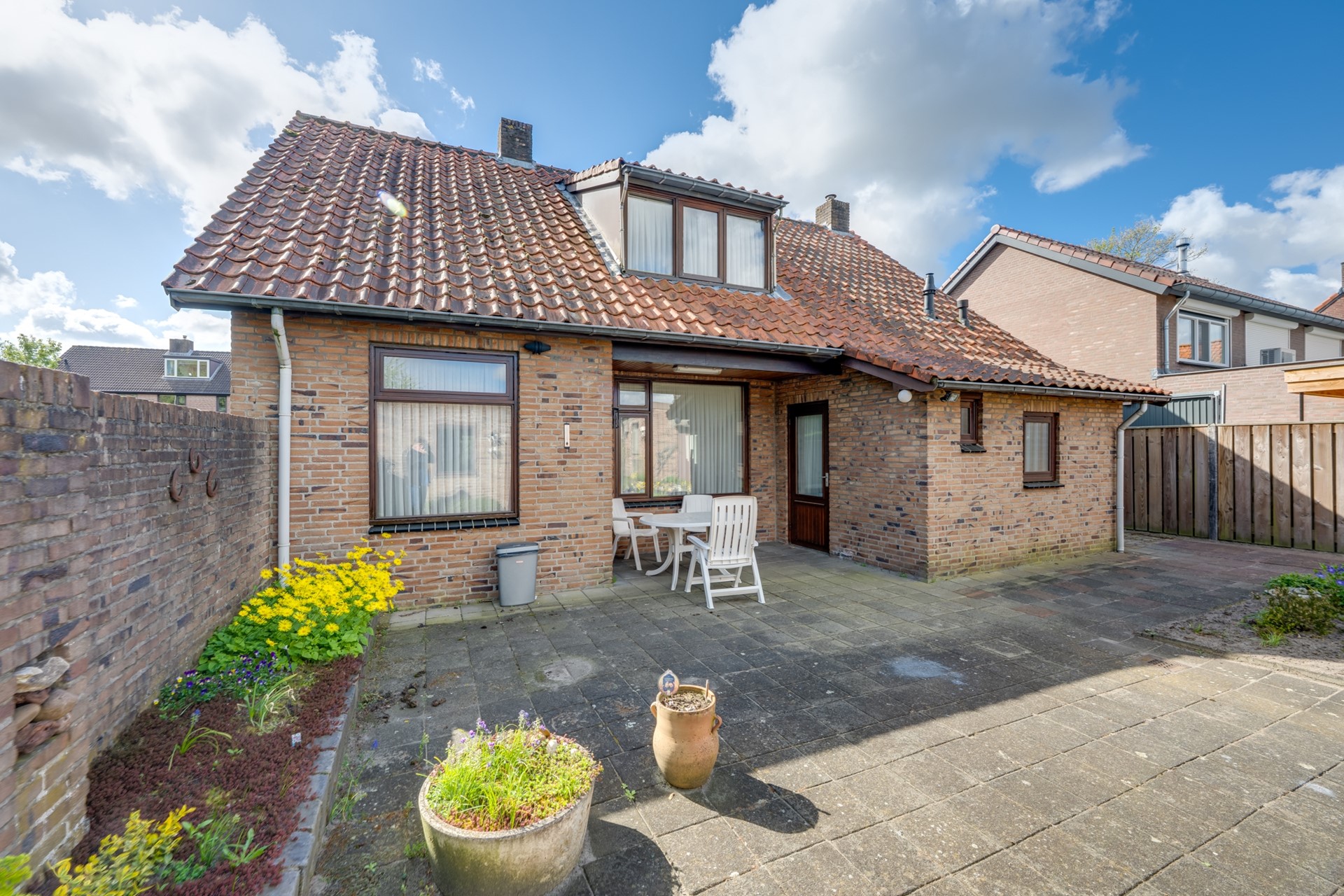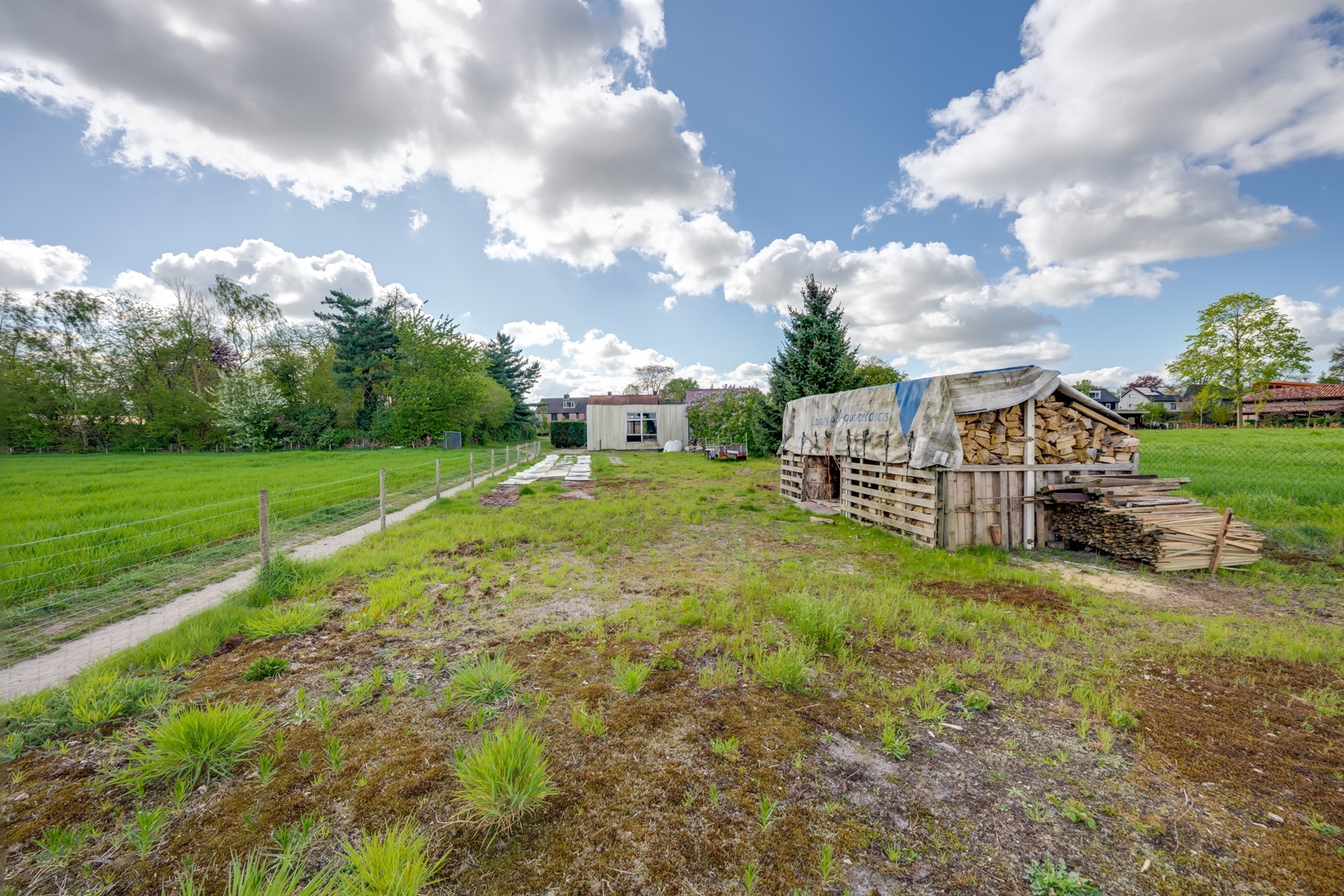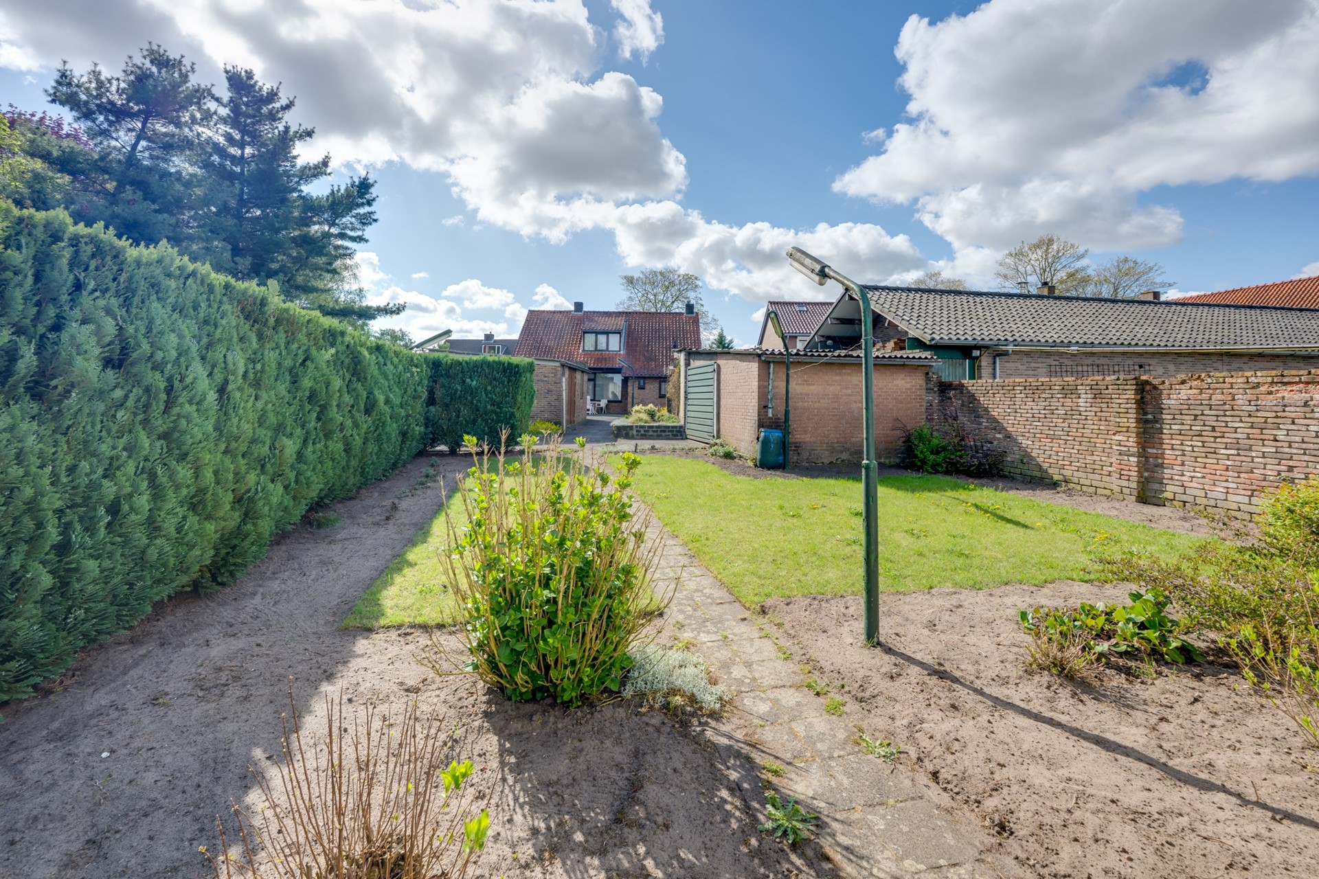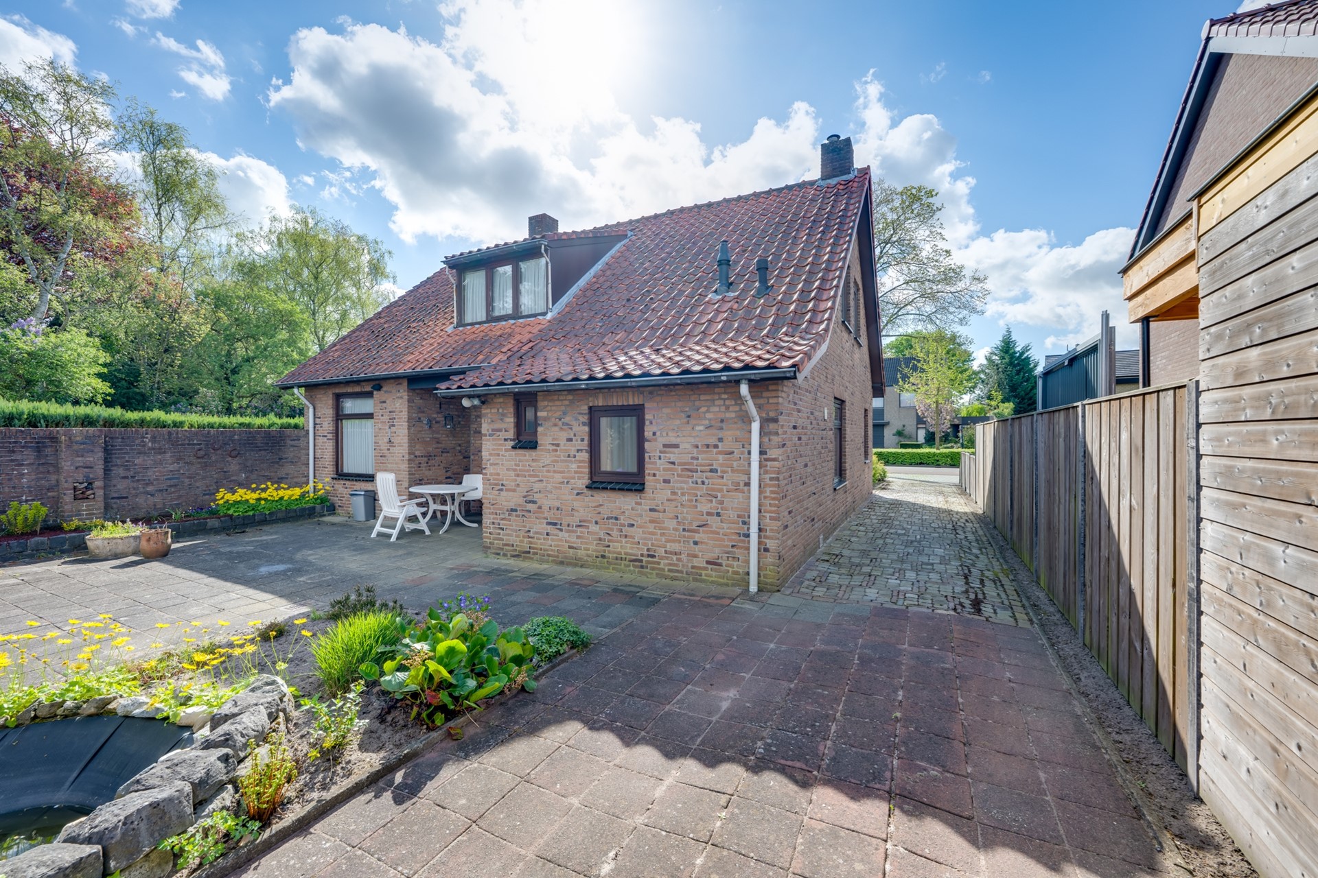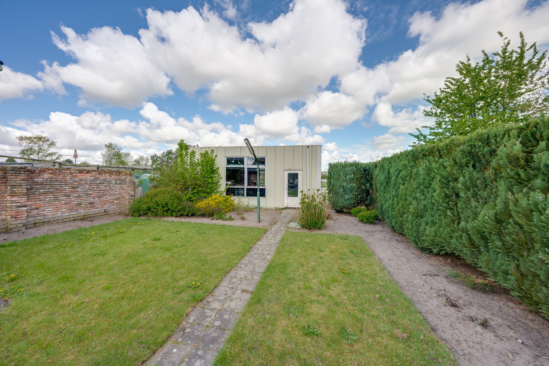 De achtertuin (zie plattegronden voor de juiste afmetingen) heeft een garage met berging, een schuur en een loods. Er is een terras met vijver en vaste beplanting direct achter de woning. Halverwege vindt u een gazon. Via de pad, aan de rechterzijde van de woning, kunt u de tuin op meerdere punten ingaan. Achter de loods ligt nog een deel van het perceel.