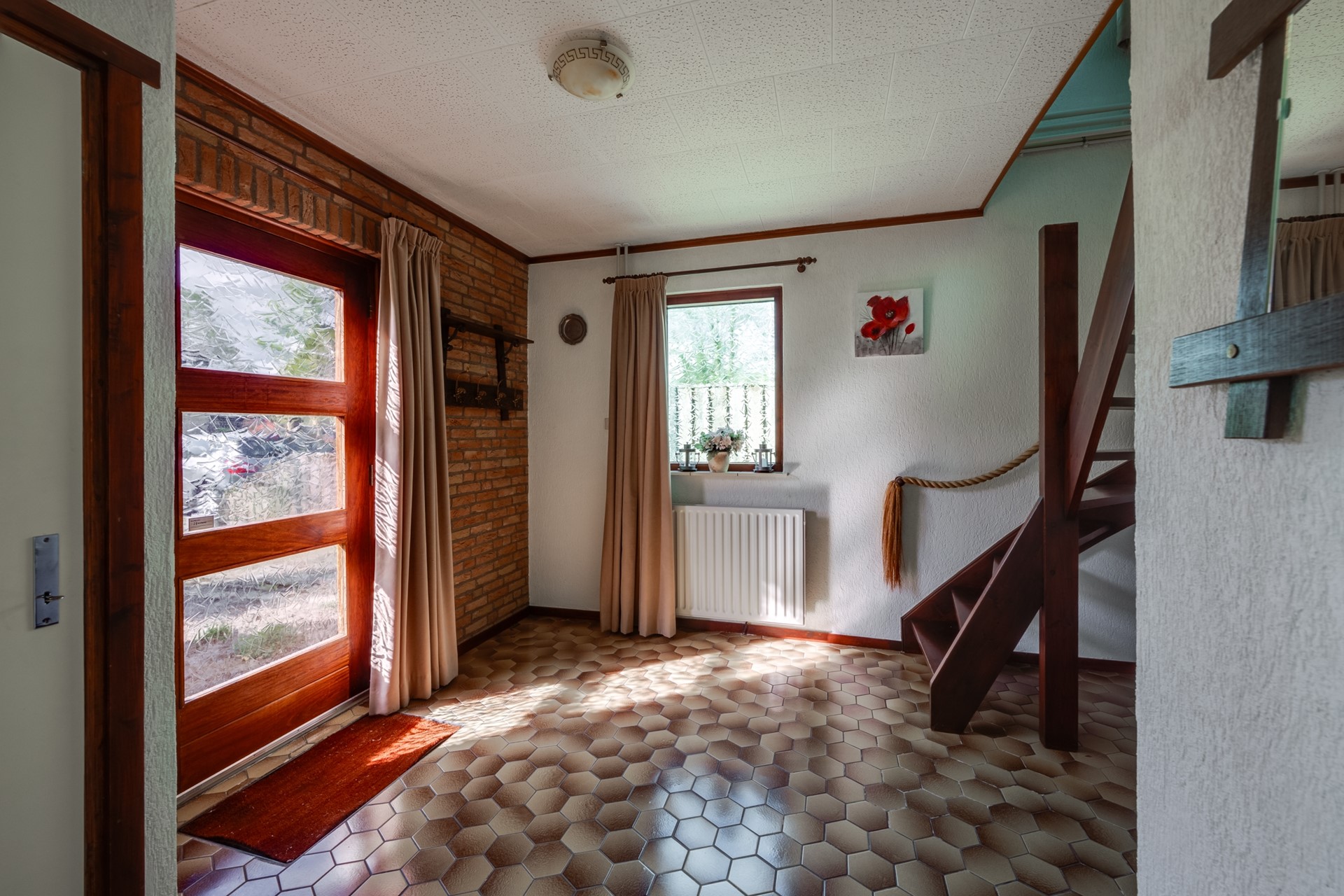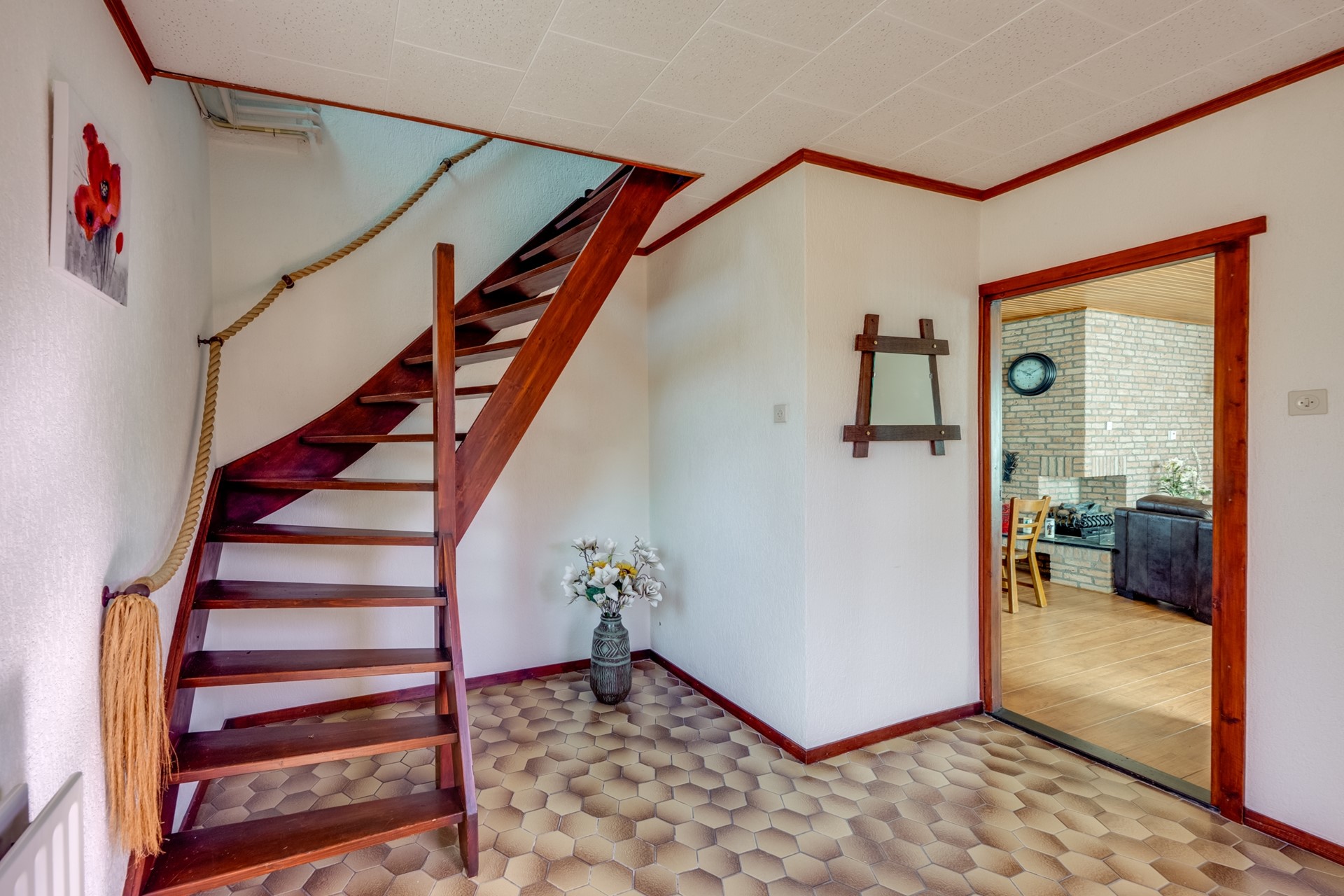 De ruime, lichte entree (3,88 m. x 3,41 m.) geeft toegang tot de garderobe, de meterkast (5 groepen en krachtstroomgroep) en de trapopgang. Via de entree kunt u naar de woonkamer.