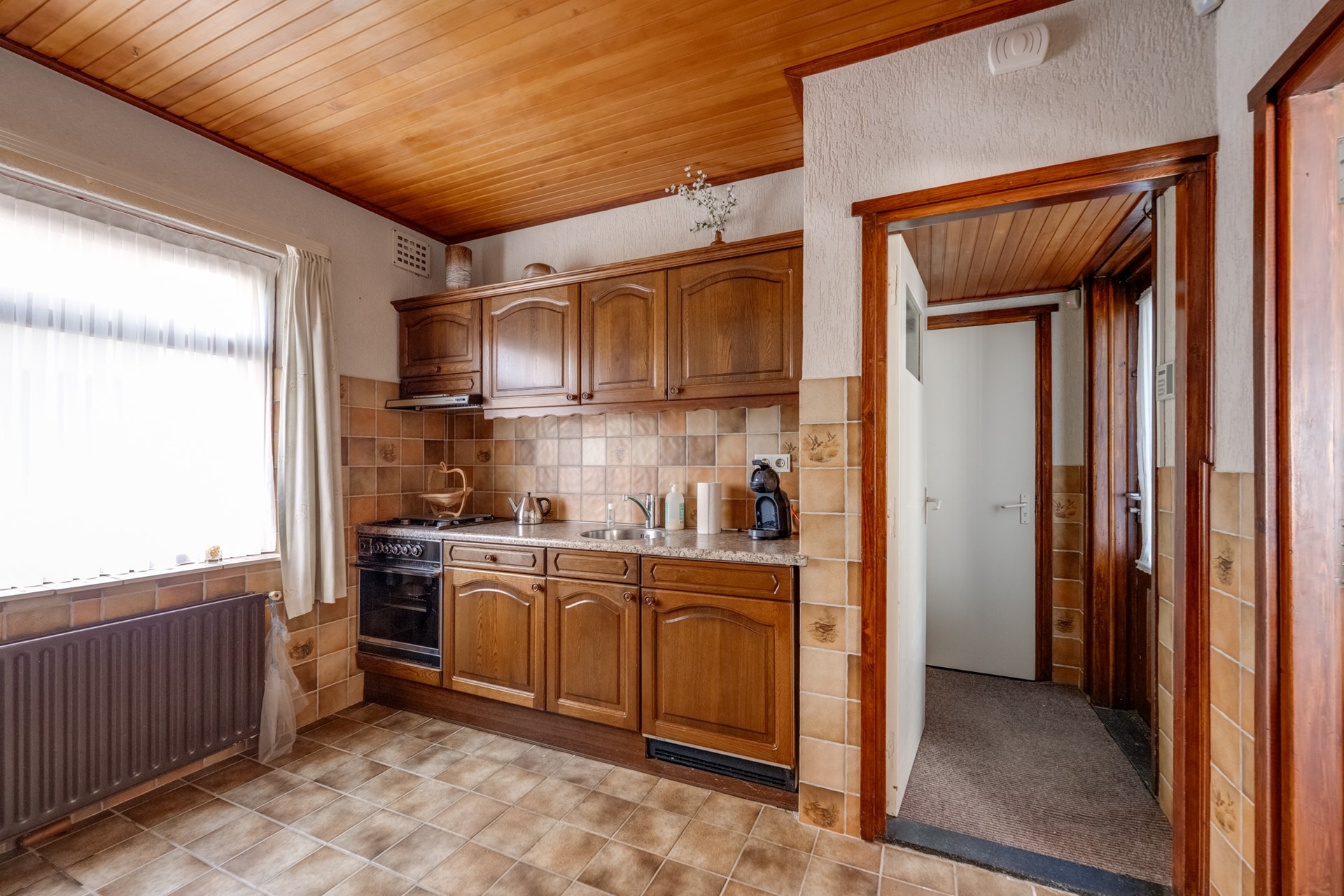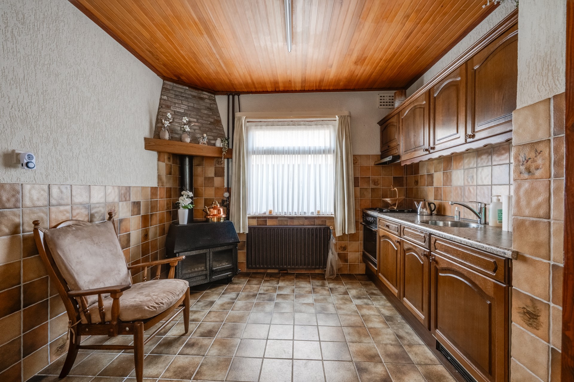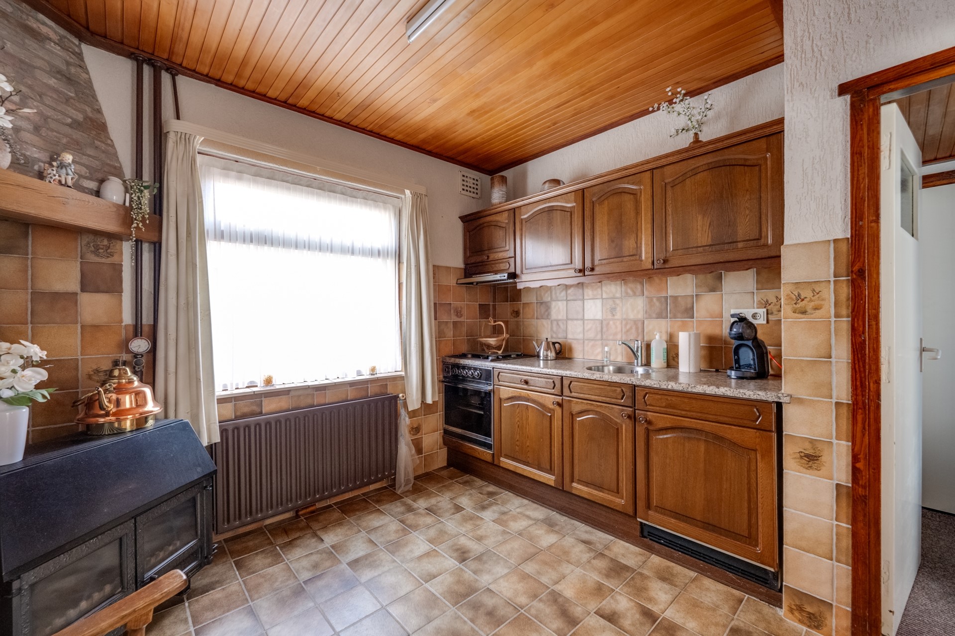 De gesloten keuken (3,38 m. x 2,63 m.) heeft een eenzijdig keukenblok. Hier vindt u een 4-pits gas kookplaat met afzuigkap, een oven en een gootsteen. Er is zowel onder als boven kastruimte. Er staat een houtkachel welke is aangesloten op de cv-installatie. U heeft toegang tot de kelder en er is een loopdeur naar de achterhal.