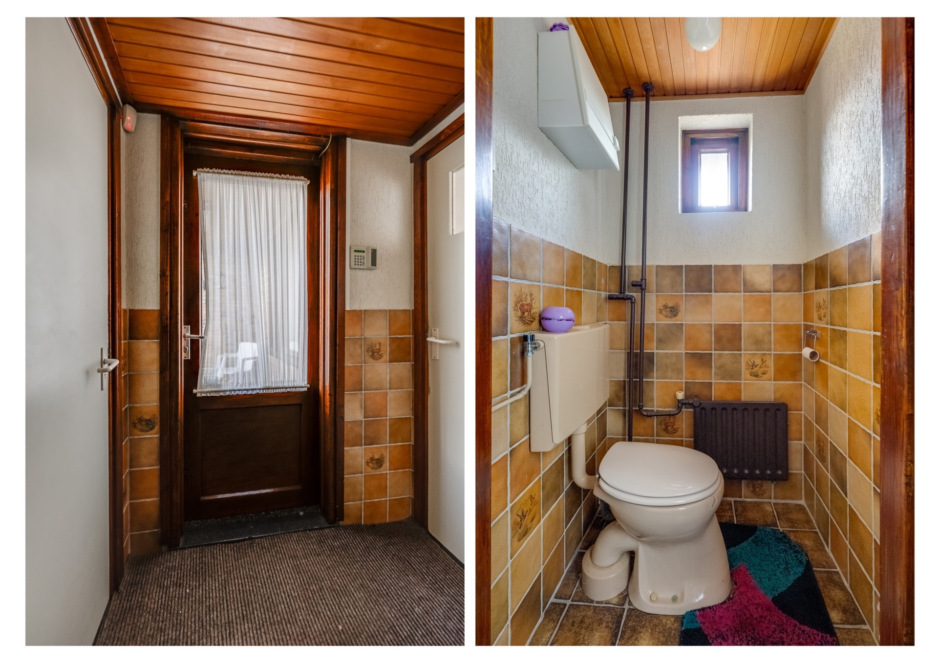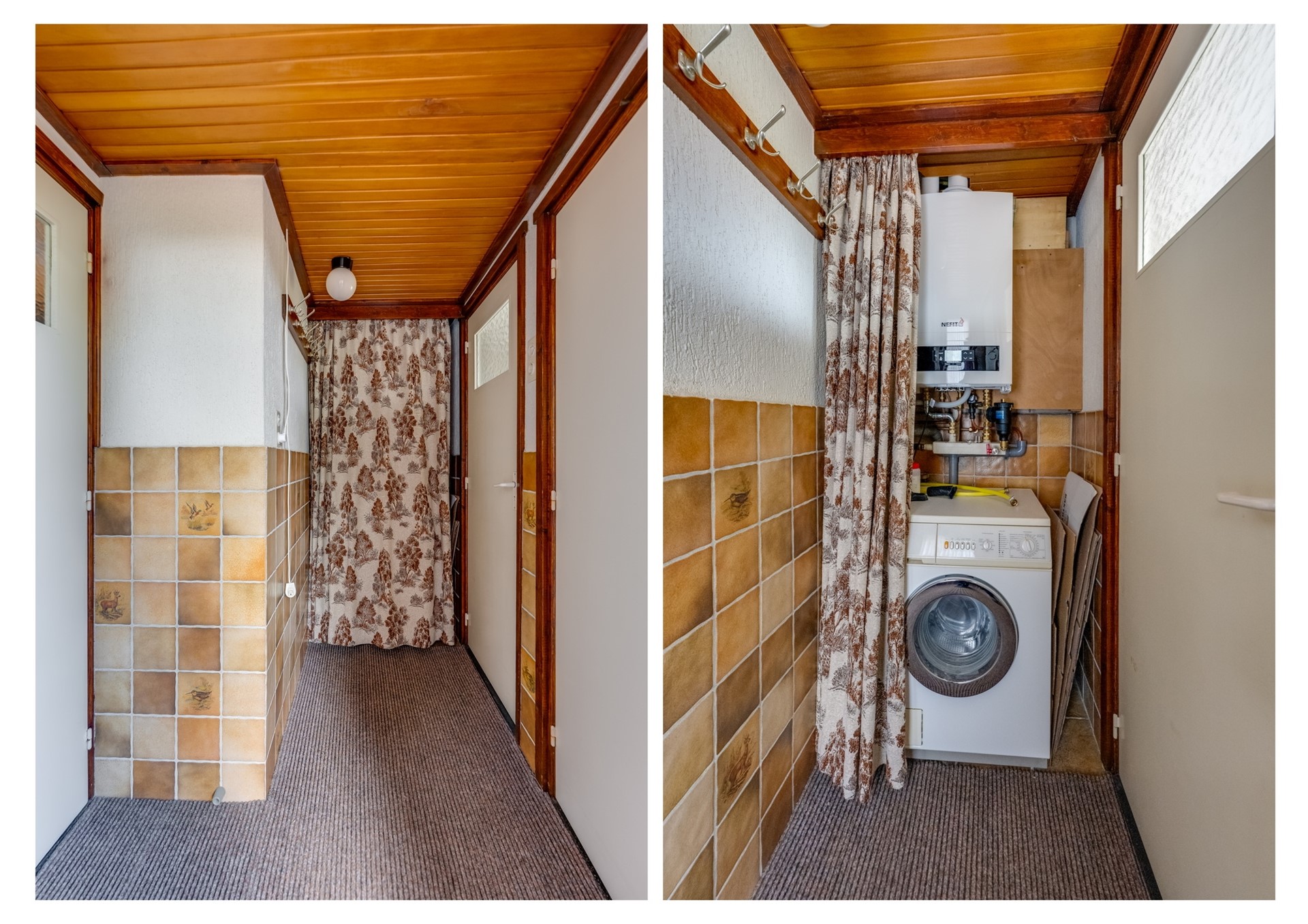 Via de keuken komt u in de achterhal/bijkeuken waar de cv-ketel (Nefit 2024) hangt en u de aansluiting voor de wasmachine vindt. Via de bijkeuken kunt u naar het toilet en de badkamer. Er is een loopdeur naar de tuin.