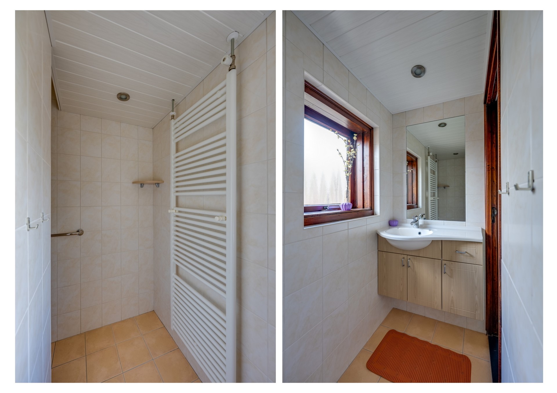 De badkamer heeft vloertegels en de wanden zijn geheel betegeld. Er is een inloopdouche met thermostaatkraan en een wastafelmeubel.