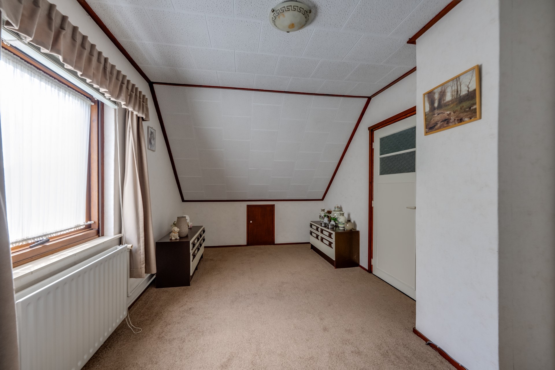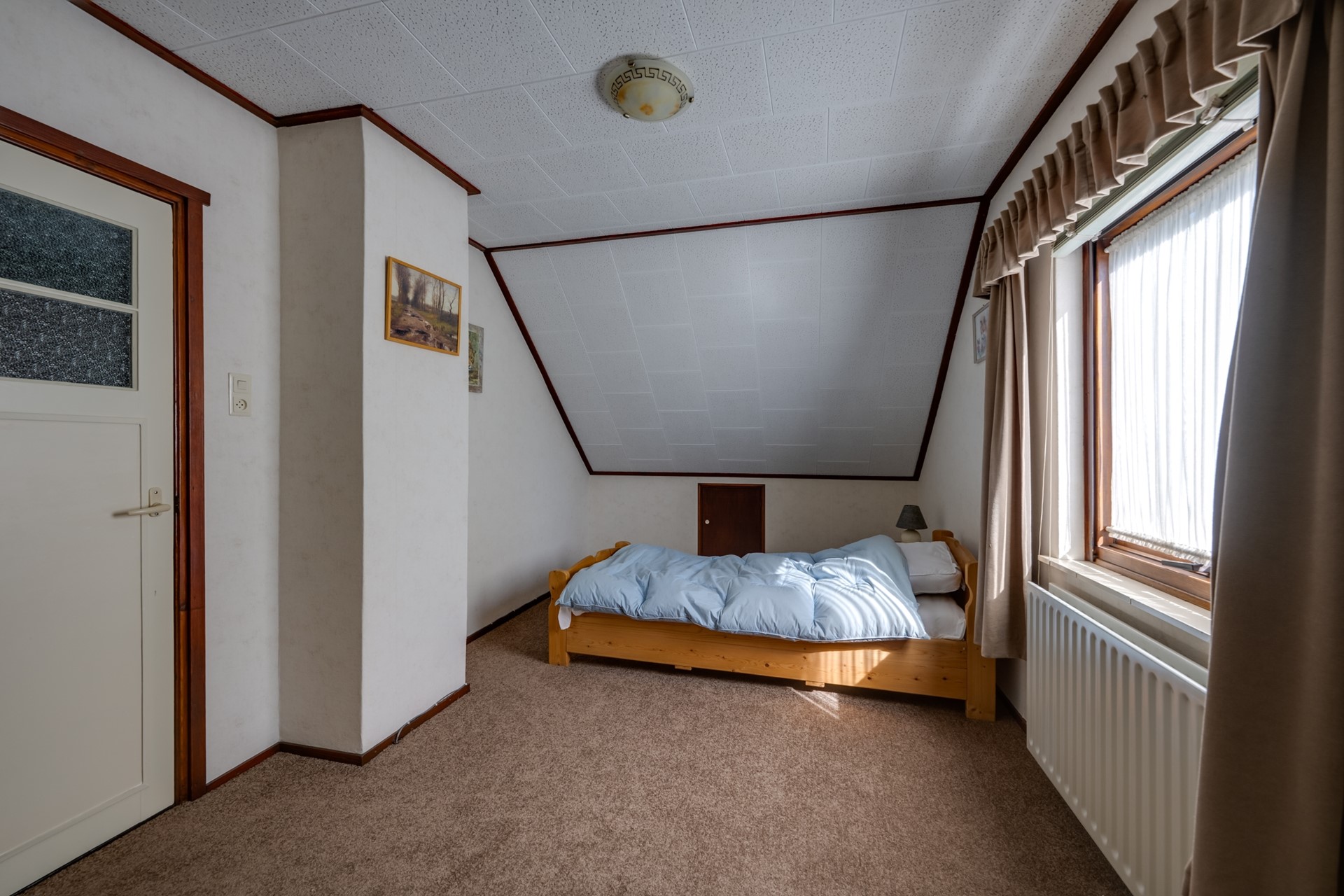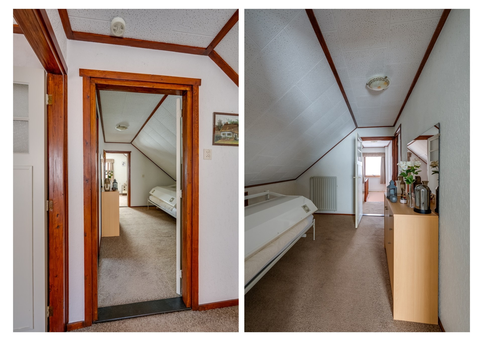 Via de overloop heeft u toegang tot 3 slaapkamers en twee inbouwkasten. De overloop heeft een voorste gedeelte (3,43 m. x 2,86 m.) met twee inbouwkasten en een tweede gedeelte (3,62 m. x 2,86 m.) aan de voorzijde van de woning. De gehele verdieping is v.v. vloerbedekking en behang op de muren. Alle plafonds zijn afgewerkt met zachtboardtegels. De houten kozijnen hebben allen dubbel glas. Op diverse plaatsen komt u knieschotten tegen voor extra bergruimte.
