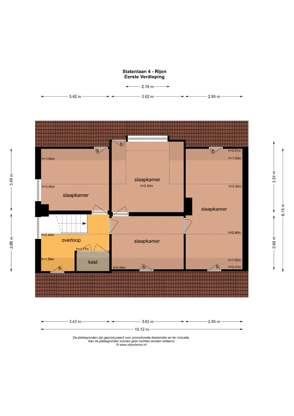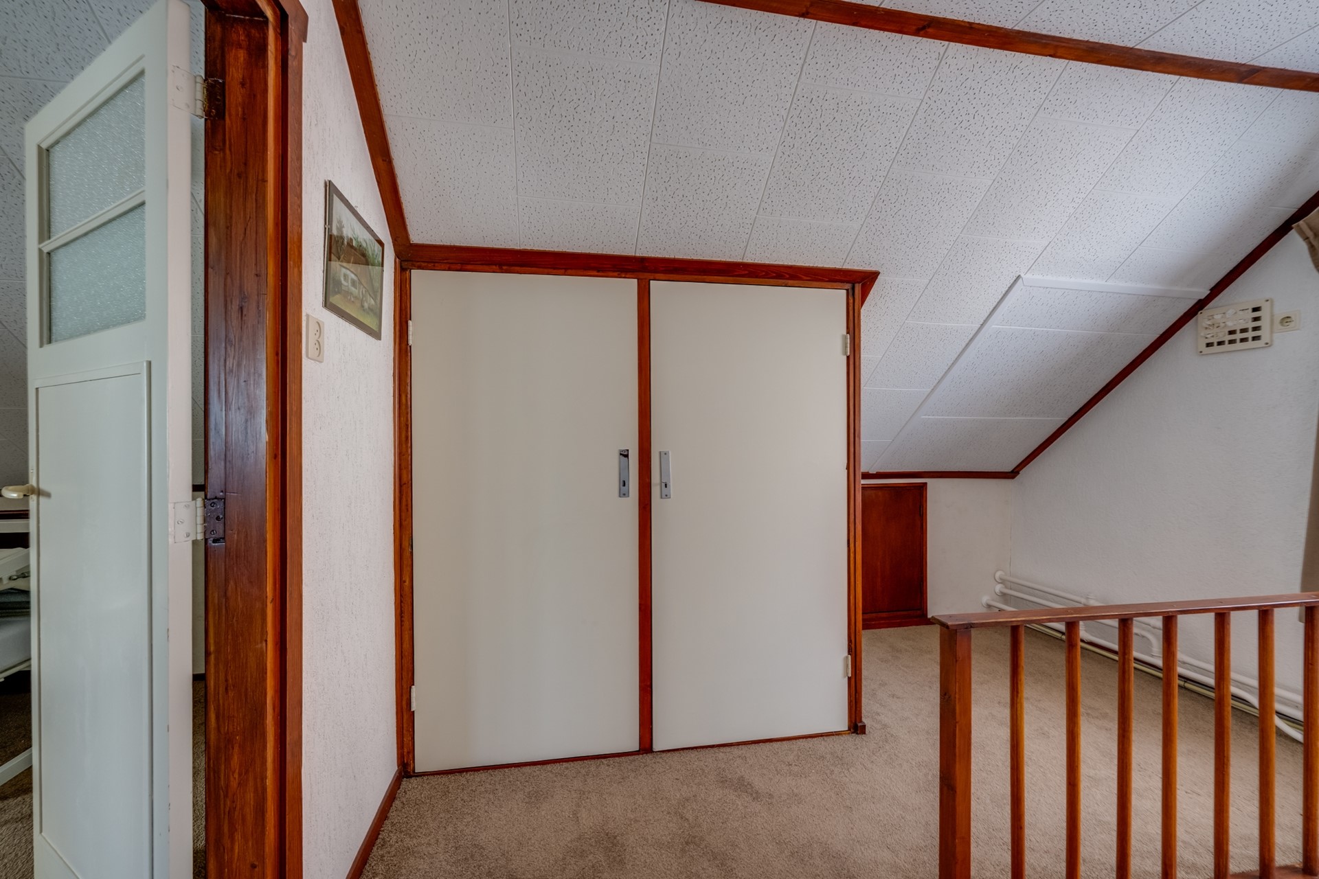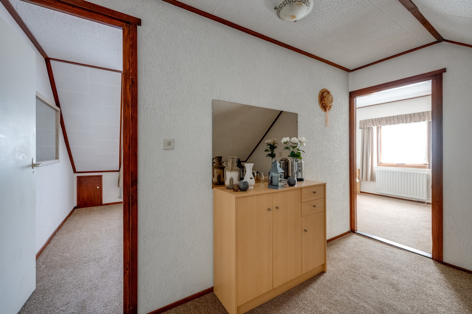 Via de overloop heeft u toegang tot 3 slaapkamers en twee inbouwkasten. De overloop heeft een voorste gedeelte (3,43 m. x 2,86 m.) met twee inbouwkasten en een tweede gedeelte (3,62 m. x 2,86 m.) aan de voorzijde van de woning. De gehele verdieping is v.v. vloerbedekking en behang op de muren. Alle plafonds zijn afgewerkt met zachtboardtegels. De houten kozijnen hebben allen dubbel glas. Op diverse plaatsen komt u knieschotten tegen voor extra bergruimte.