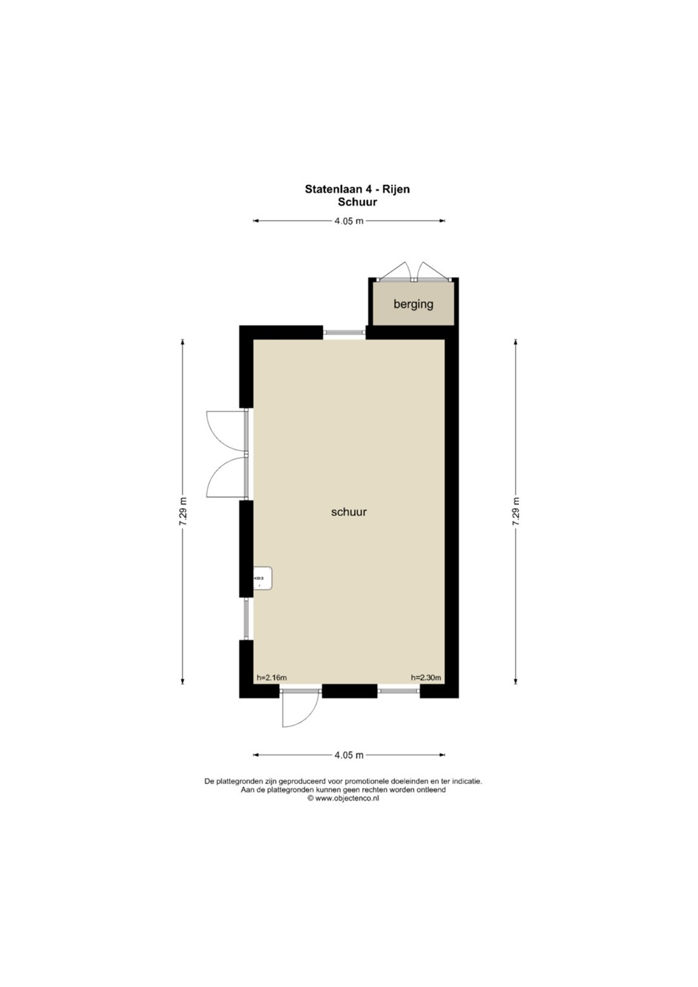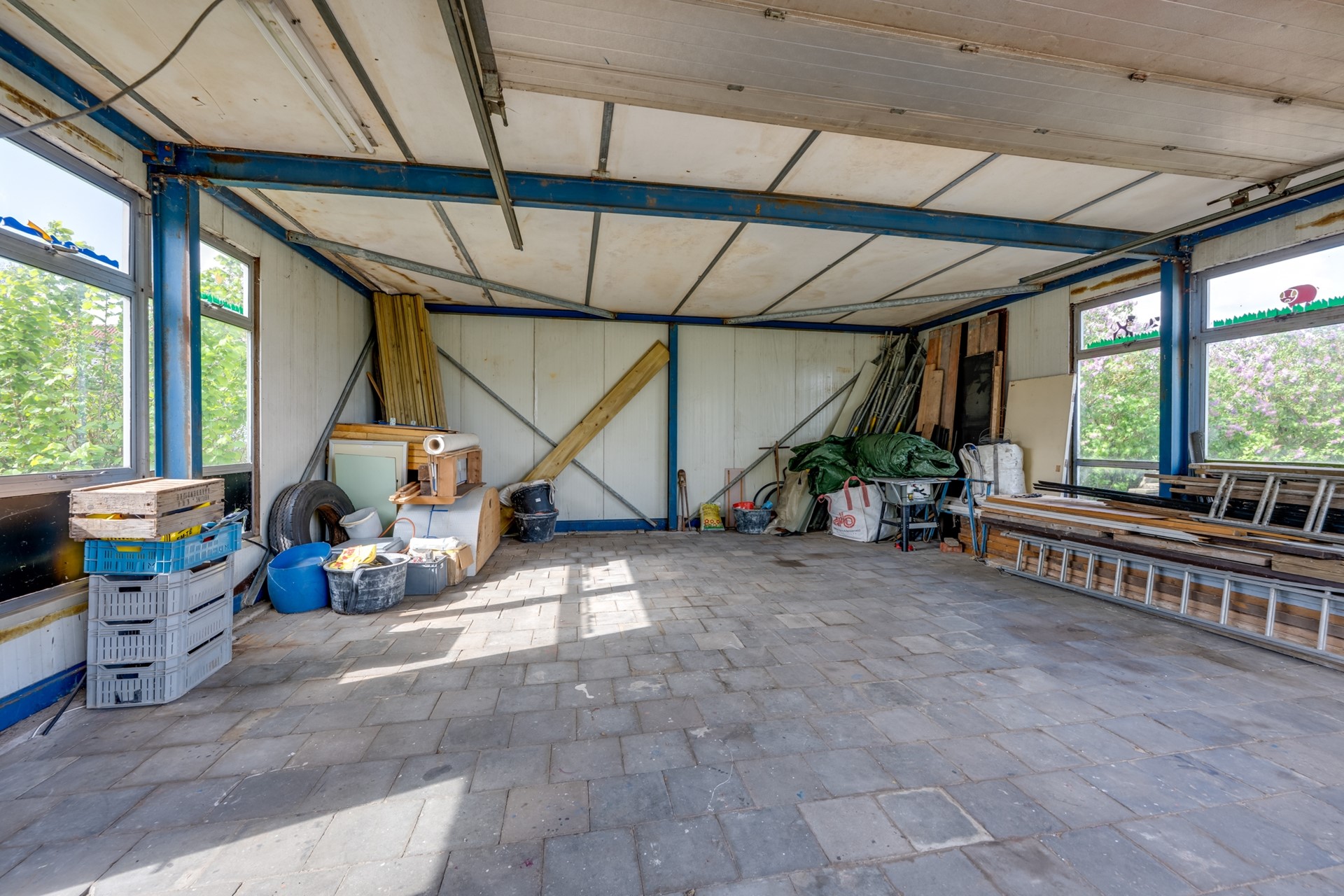 Deze vrijstaande, stenen berging (7,29 m. x 4,05 m.) heeft een dubbele, openslaande deur en een loopdeur. Er is een meterkast met krachtstroom (16 ampère) aanwezig. Ook vindt u hier een gootsteen.