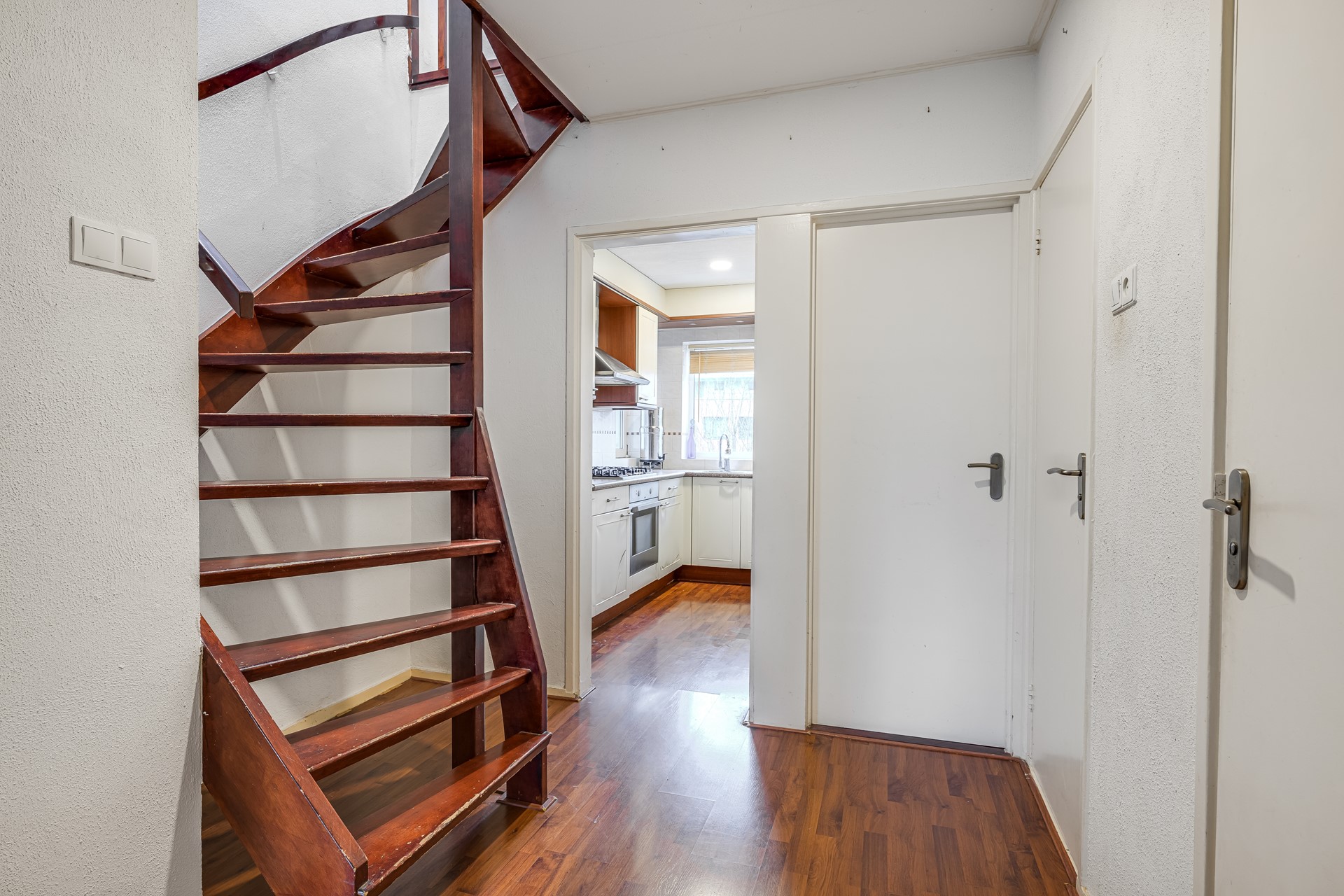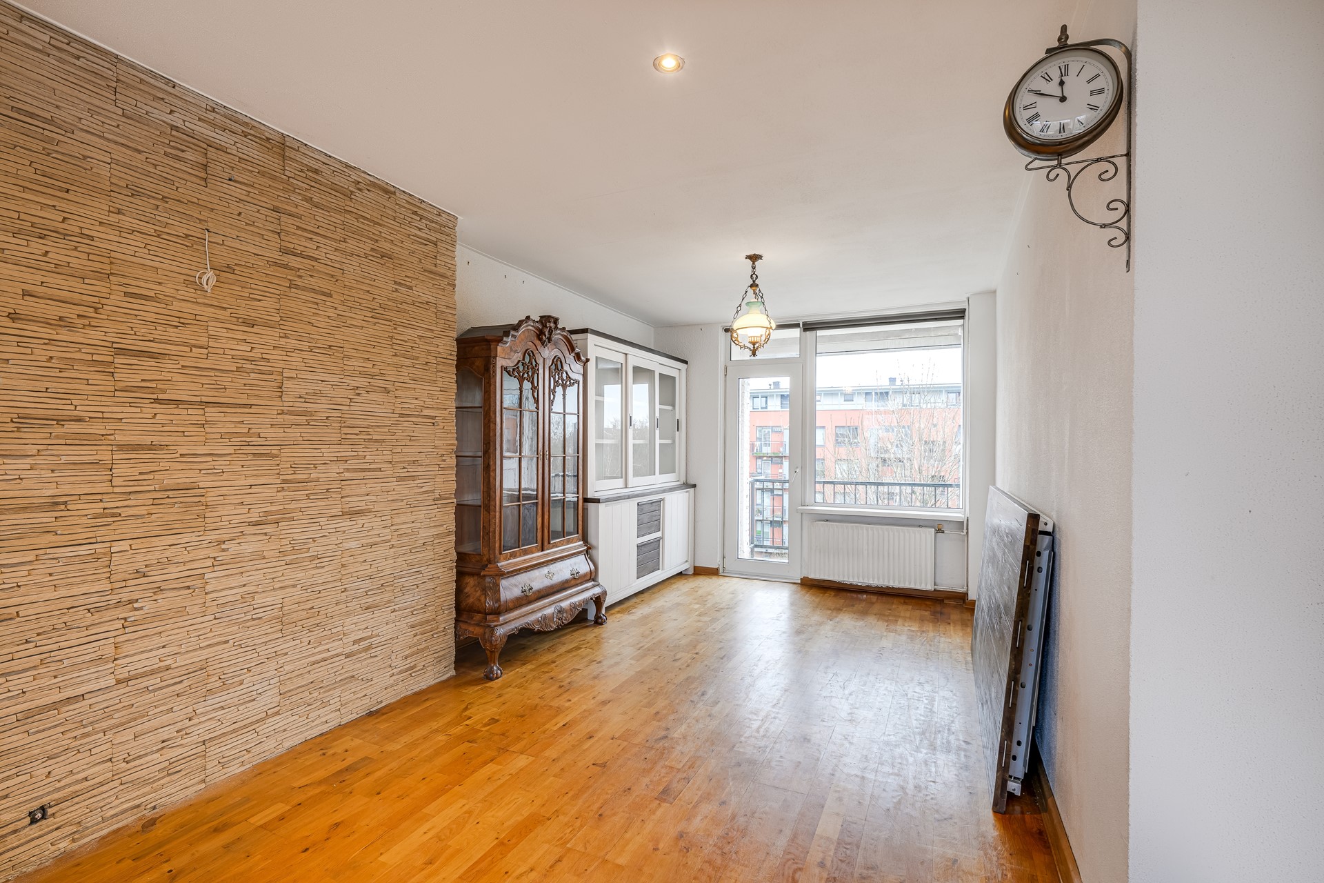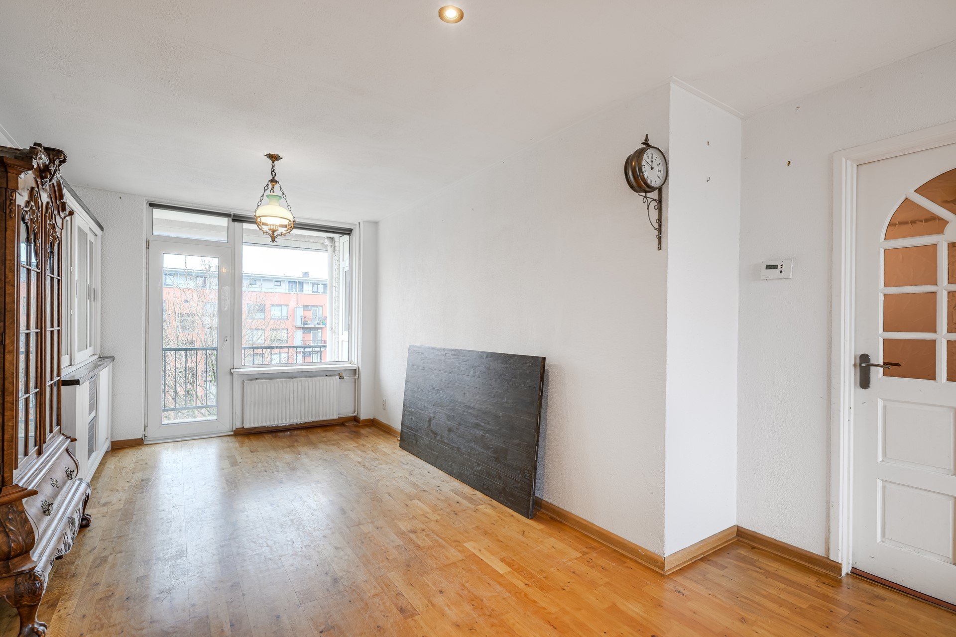 De woonverdieping vormt het hart van de woning. De royale woonkamer biedt volop ruimte voor een comfortabele zithoek én een grote eettafel. Dankzij de brede raampartijen valt het daglicht hier rijkelijk naar binnen, wat zorgt voor een prettige, open sfeer. De keuken ligt praktisch naast de woonkamer en geeft toegang tot het balkon: een fijne plek voor een koffiemoment in de ochtendzon of een ontspannen borrel aan het einde van de dag.