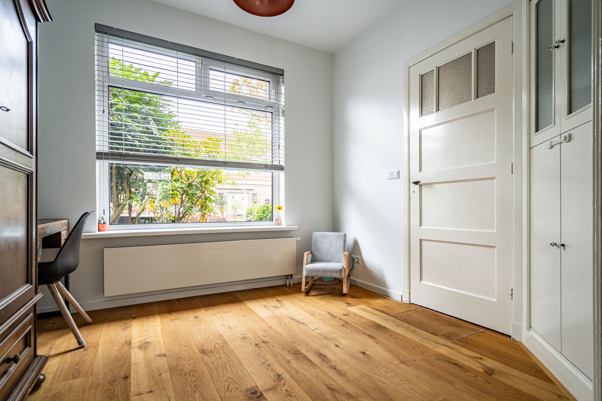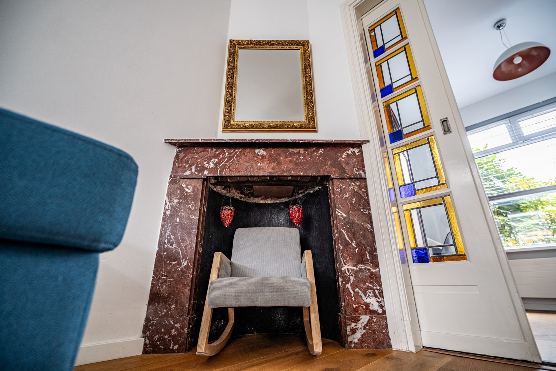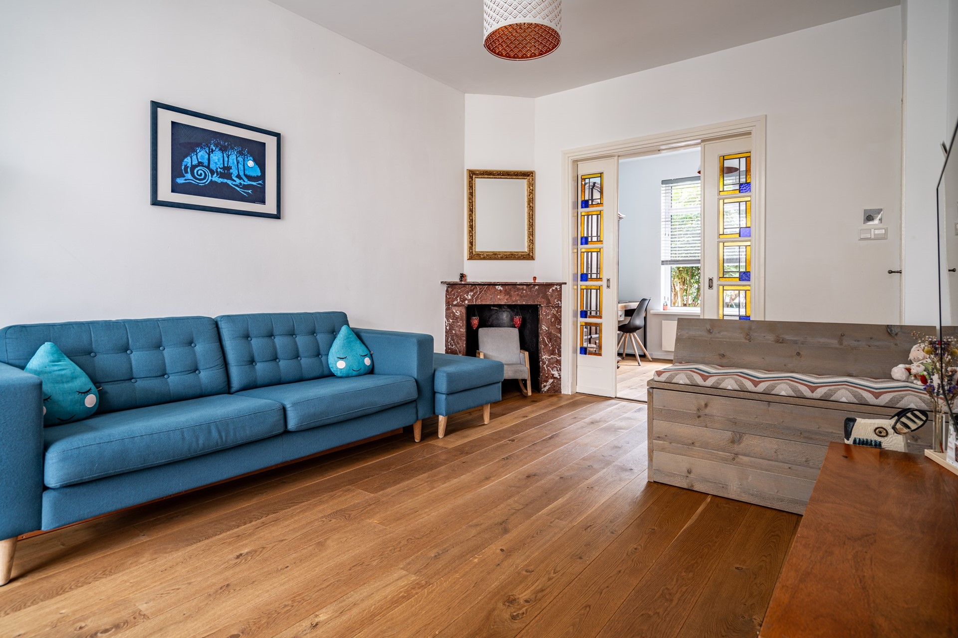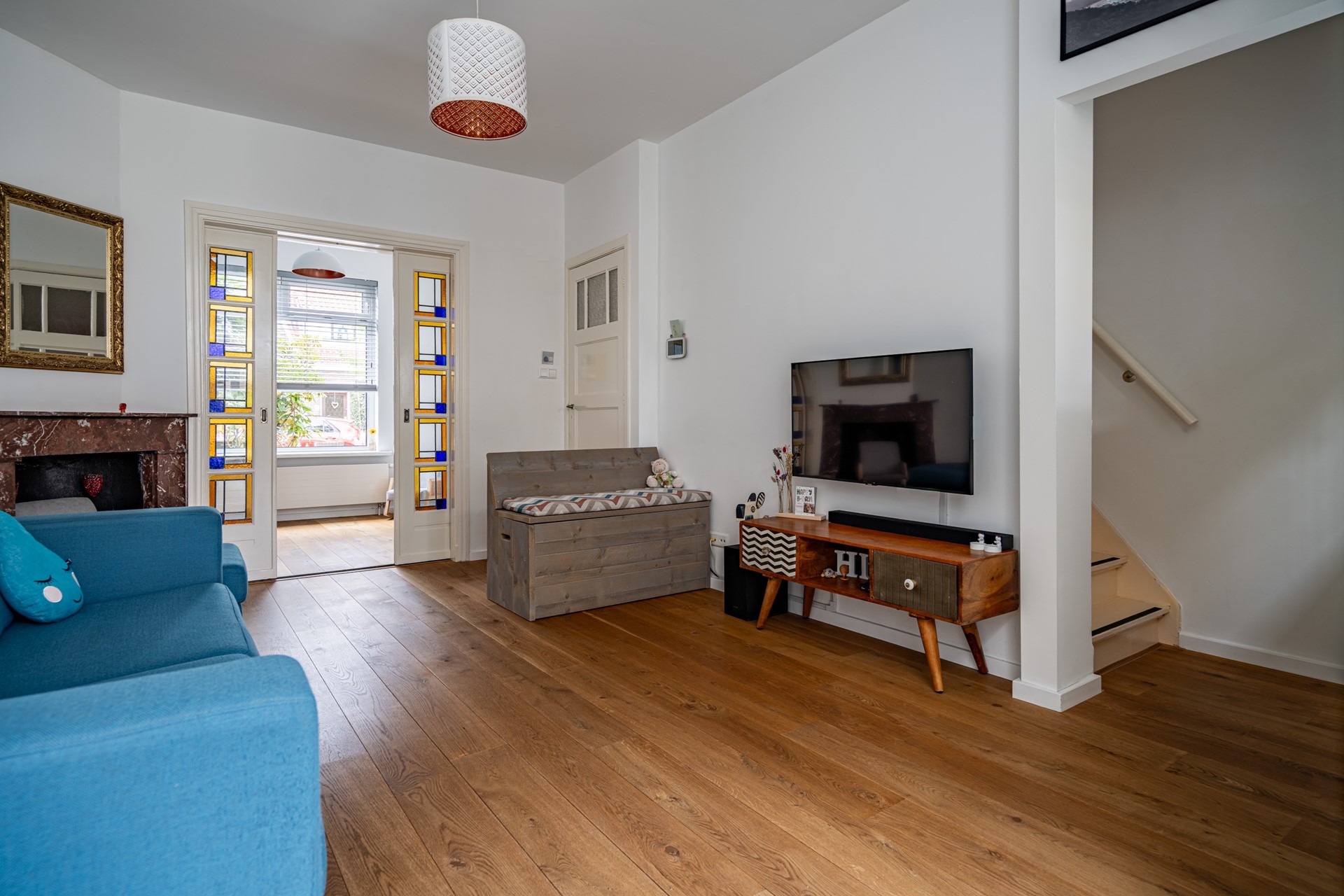 De woonkamer is ruim en licht van opzet en beschikt nog over de originele ensuite deuren, waarmee een aparte kamer is gecreëerd die naar eigen wens is in te vullen, bijvoorbeeld als werk- of eetkamer. De woning is aan de achterzijde uitgebouwd, waardoor er een royale leefruimte is ontstaan met een open keuken en eetgedeelte.
