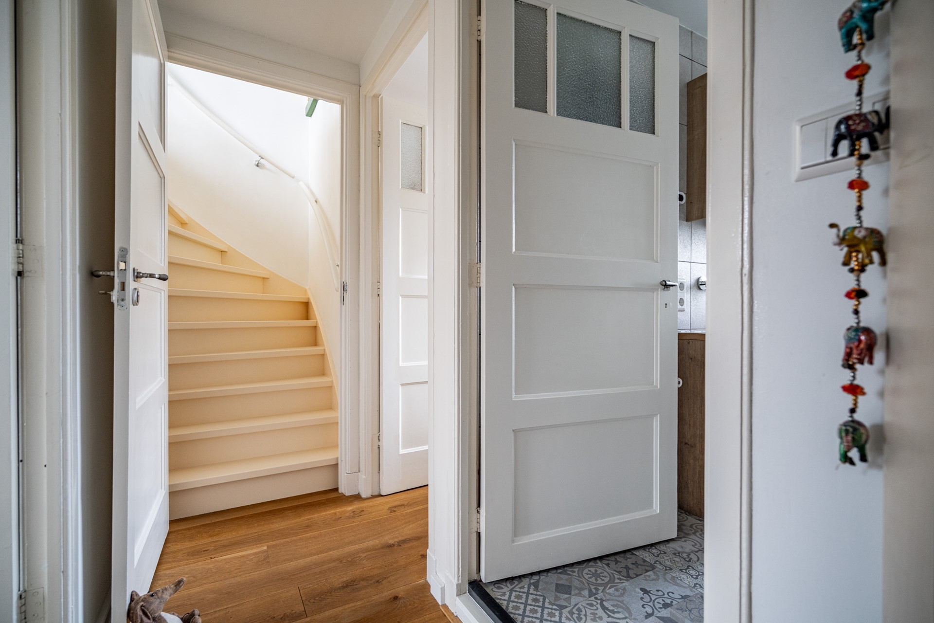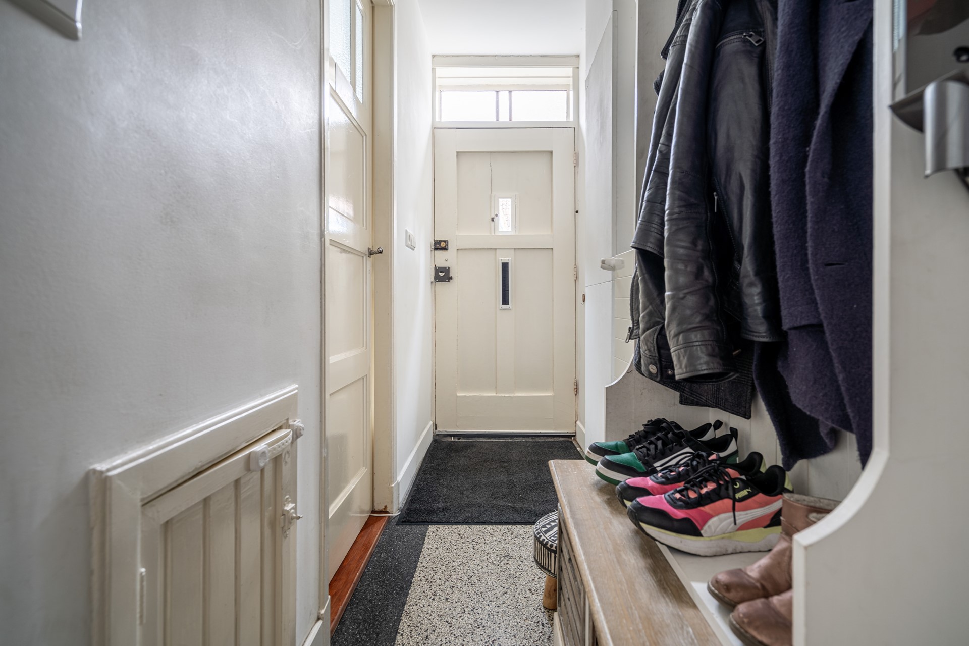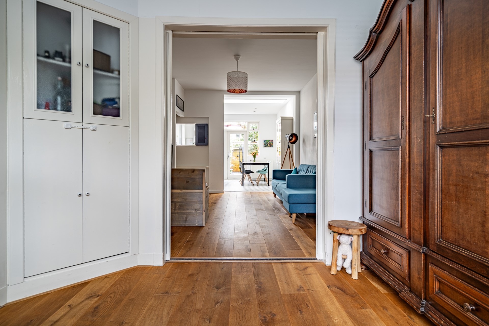Via de voortuin, waar ook een nette fietsenschuur staat, kom je bij de voordeur en stap je binnen in de hal waar de originele granieten vloer nog aanwezig is. In de hal bevinden zich tevens het toilet en de deur naar de woonkamer.