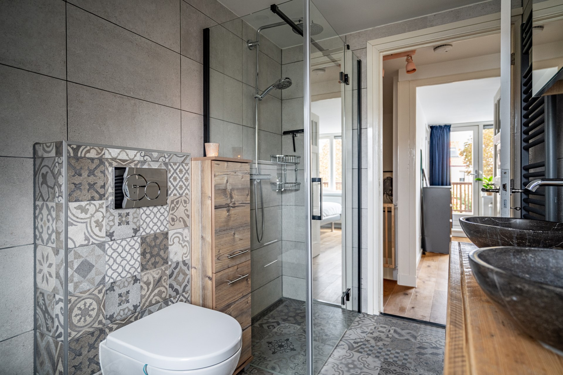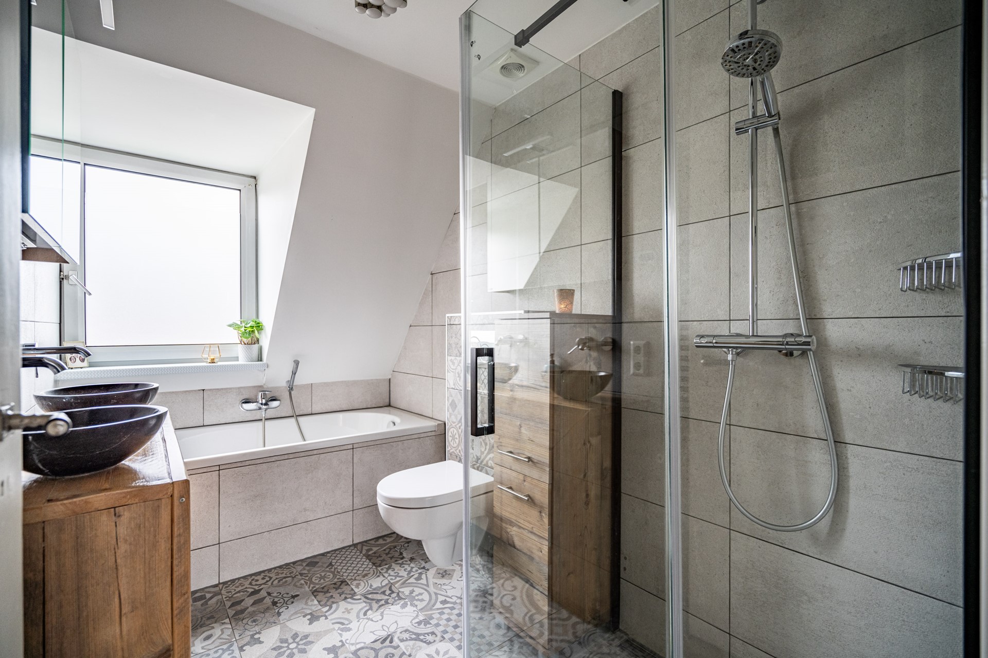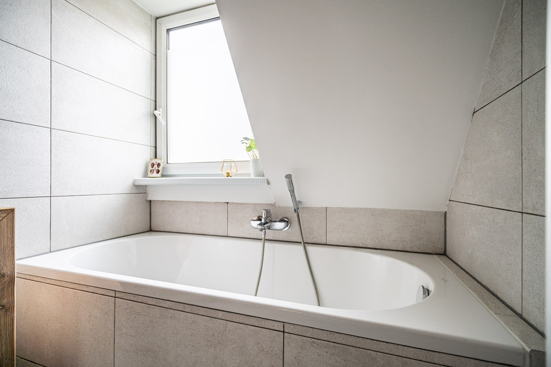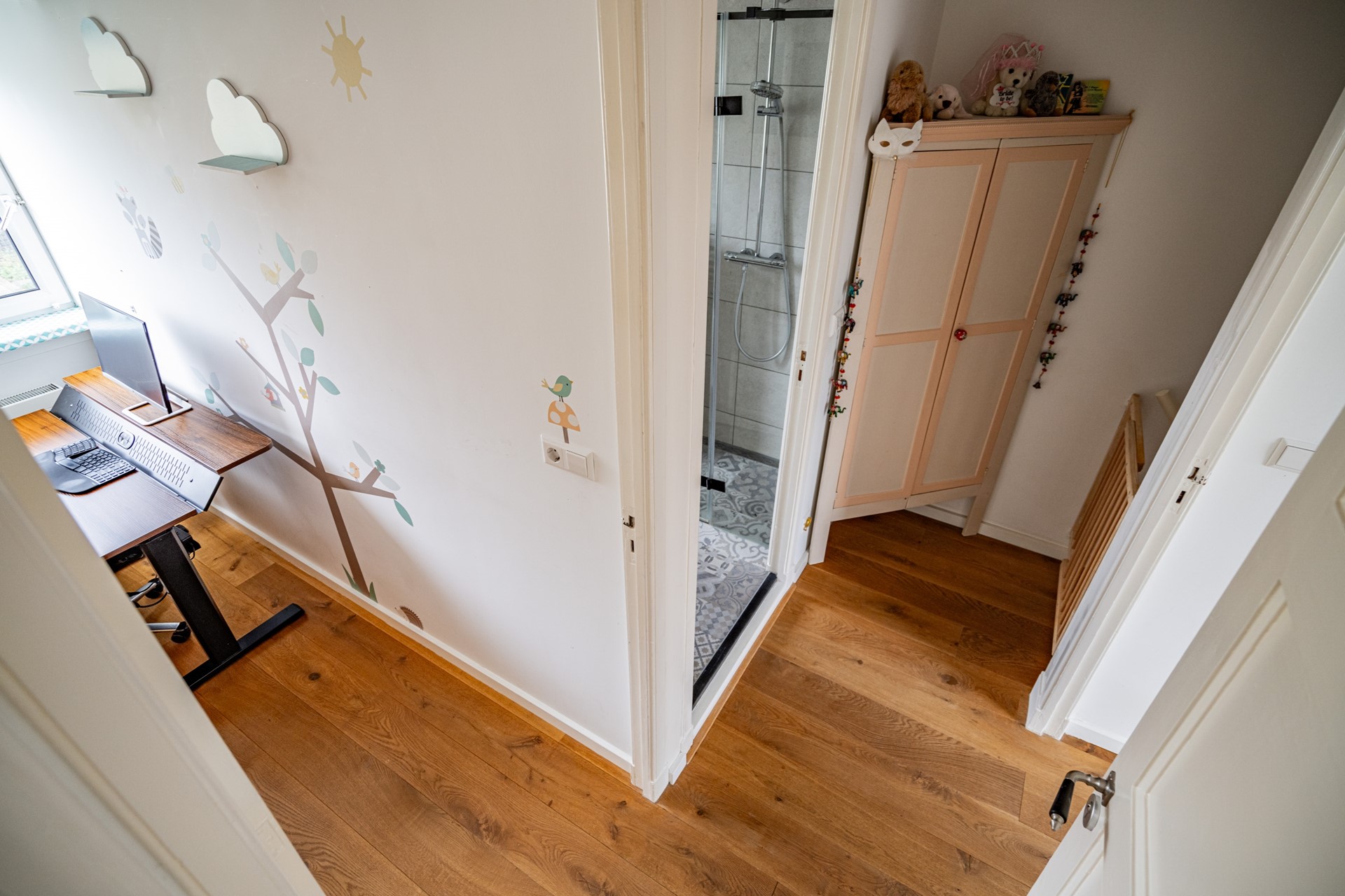 Op de eerste verdieping bevinden zich twee ruime slaapkamers met veel lichtinval. Vanuit de hoofdslaapkamer is er toegang tot het ruime dakterras. De badkamer is modern afgewerkt en voorzien van een ligbad, inloopdouche, zwevend toilet en dubbele wastafel.