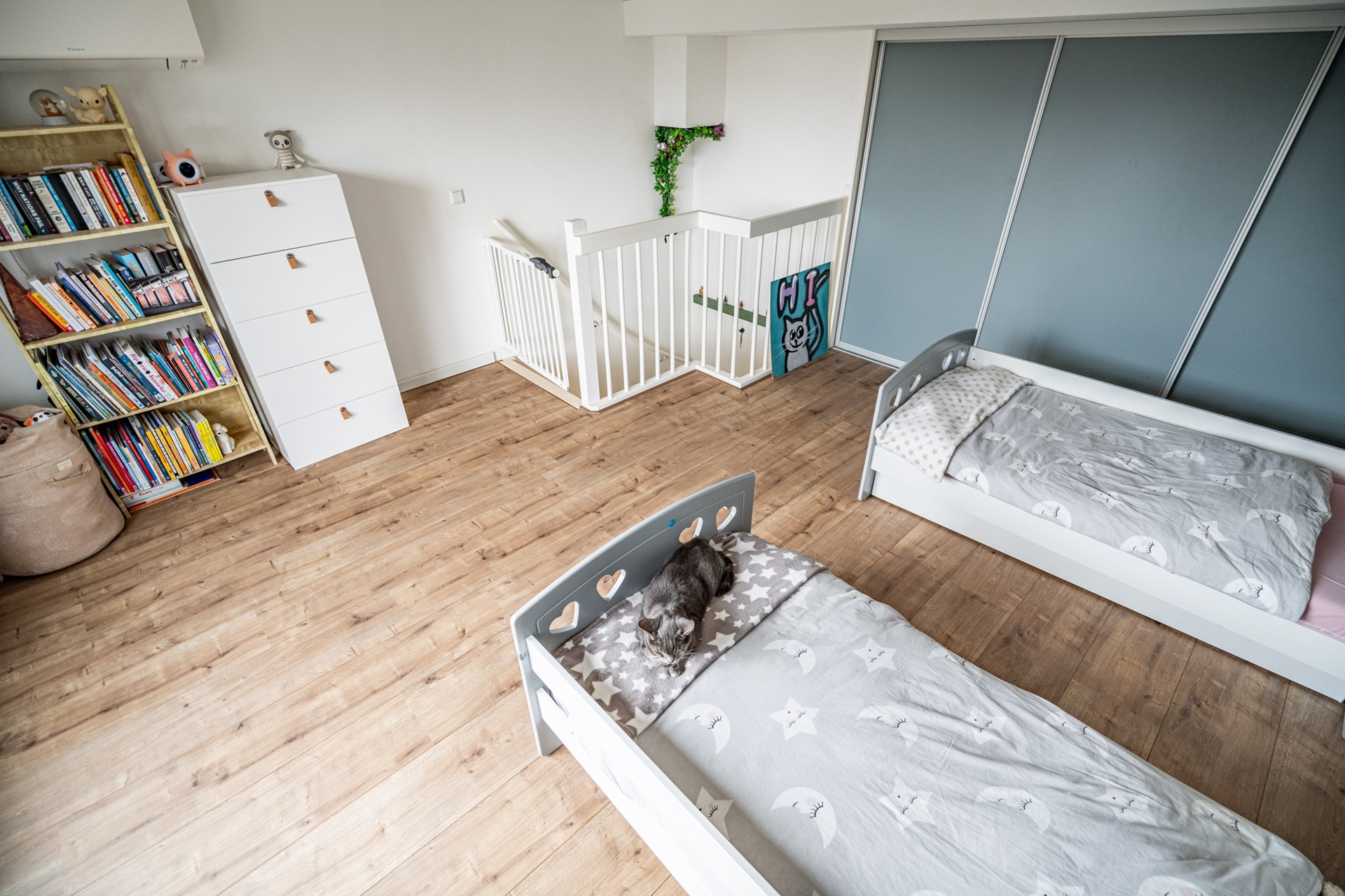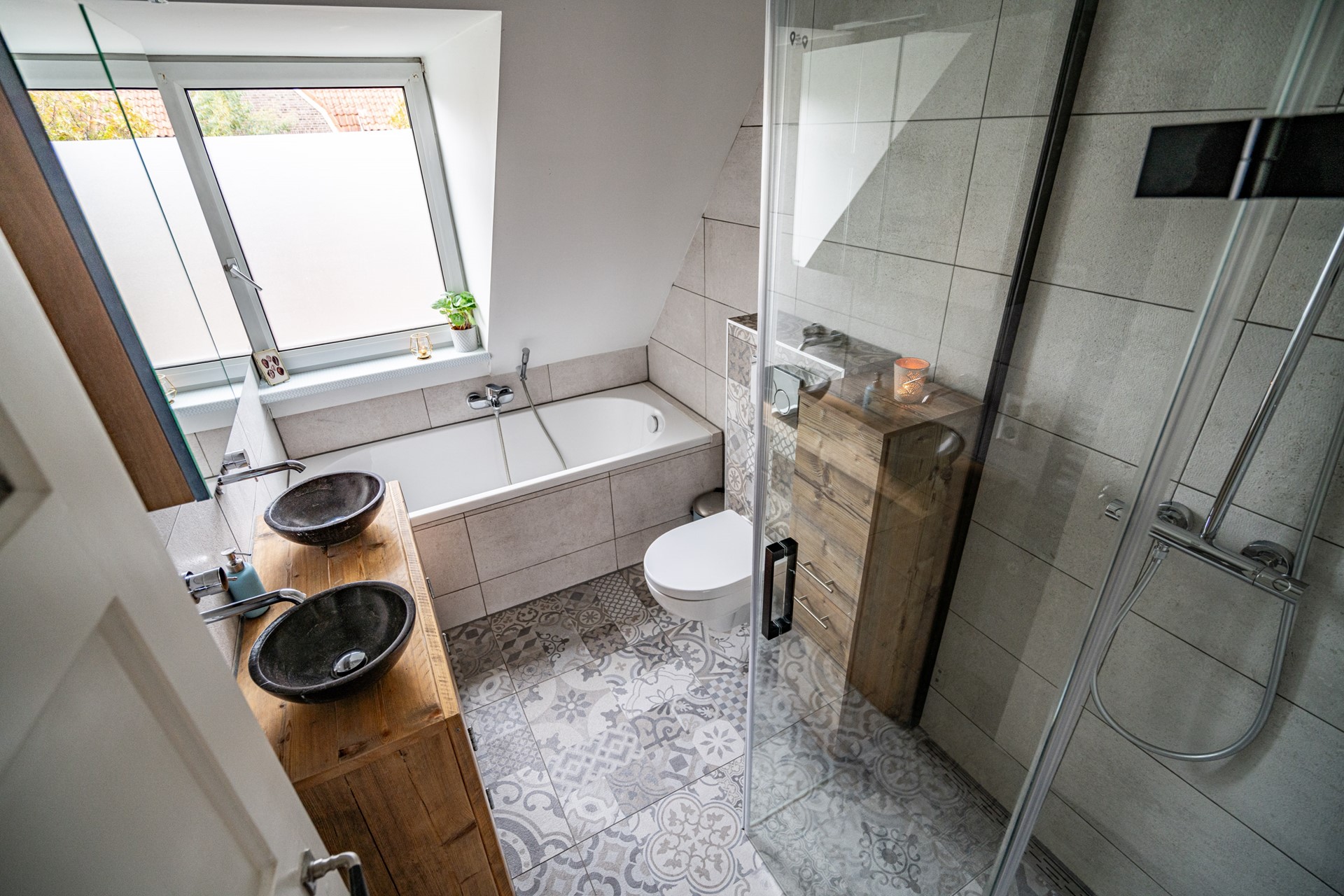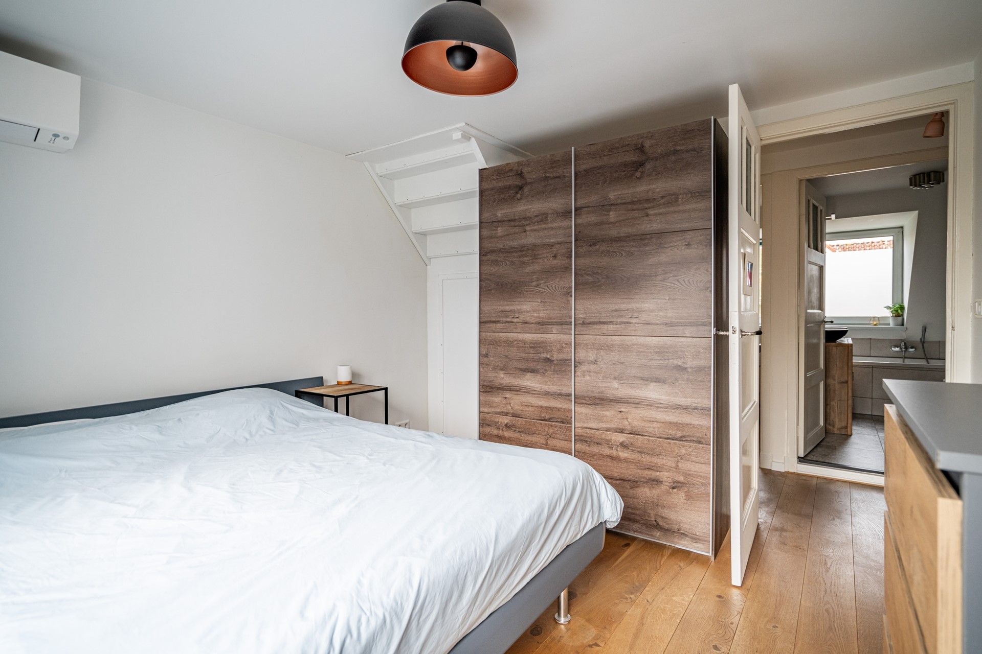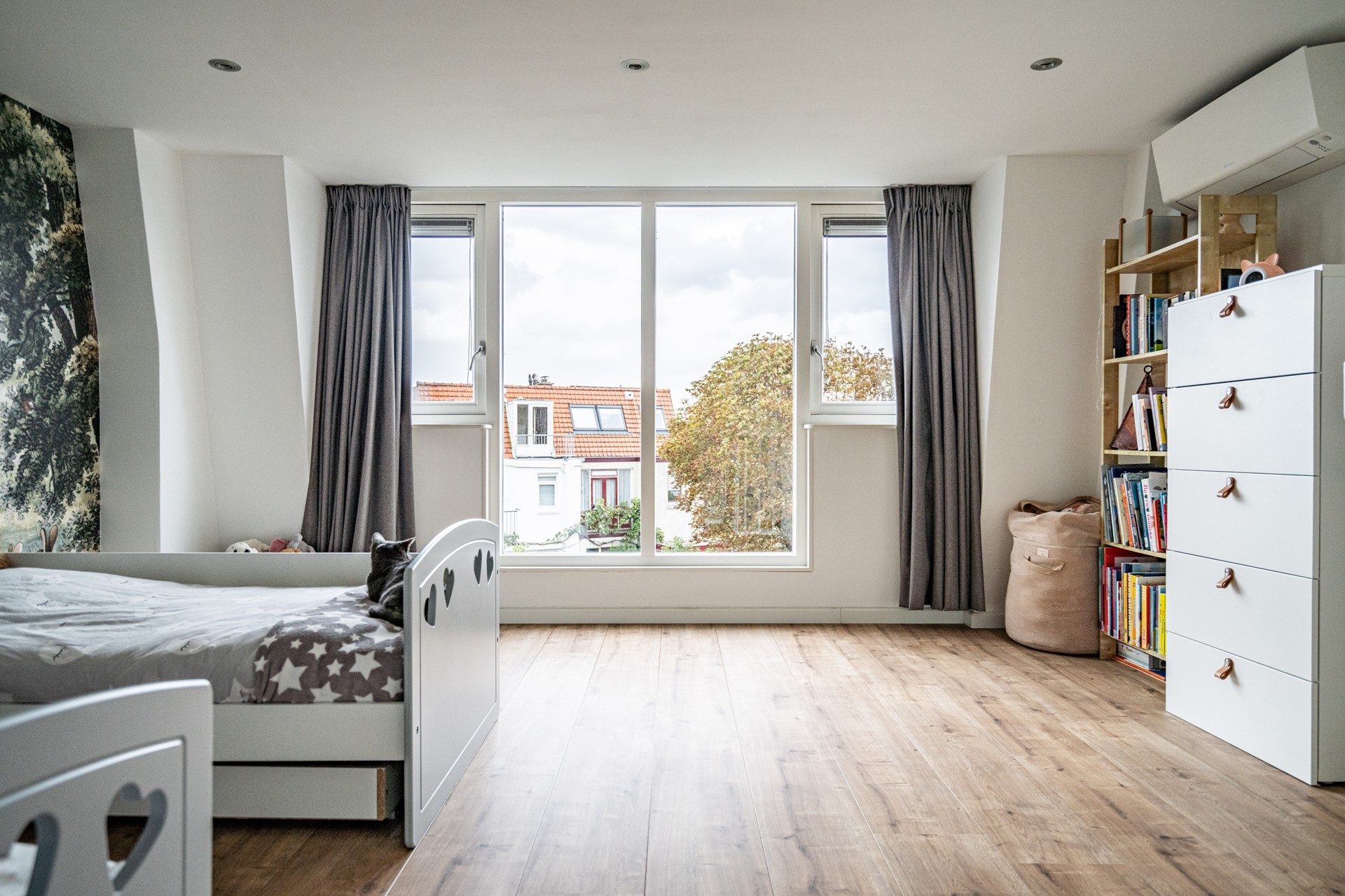 Op de eerste verdieping bevinden zich twee ruime slaapkamers met veel lichtinval. Vanuit de hoofdslaapkamer is er toegang tot het ruime dakterras. De badkamer is modern afgewerkt en voorzien van een ligbad, inloopdouche, zwevend toilet en dubbele wastafel.