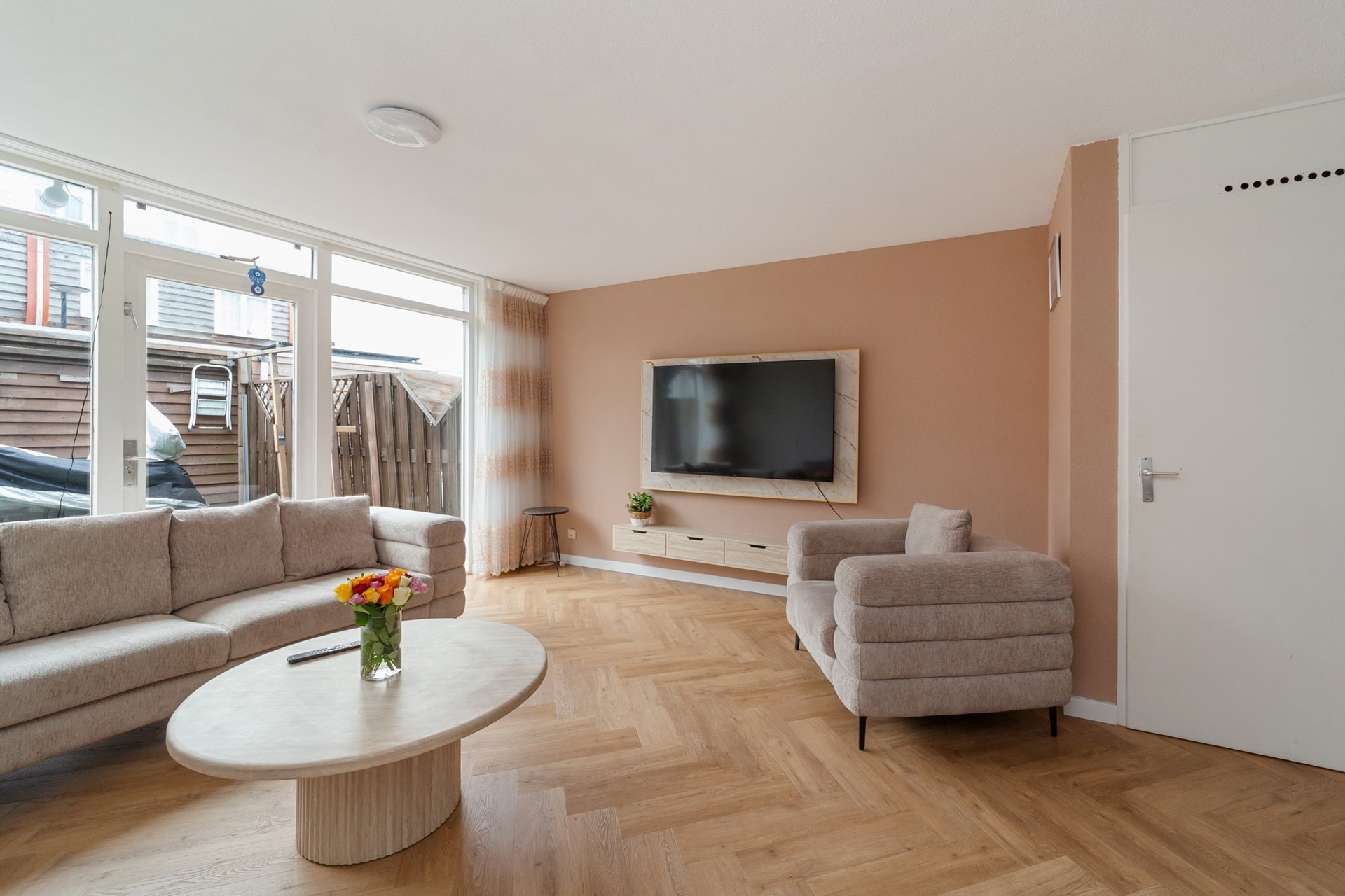The garden-facing living room is very bright and cozy. Features include a threshold-free PVC floor in a herringbone pattern and a practical built-in cupboard. From here, a door leads directly into the sunny south-east-facing back garden.