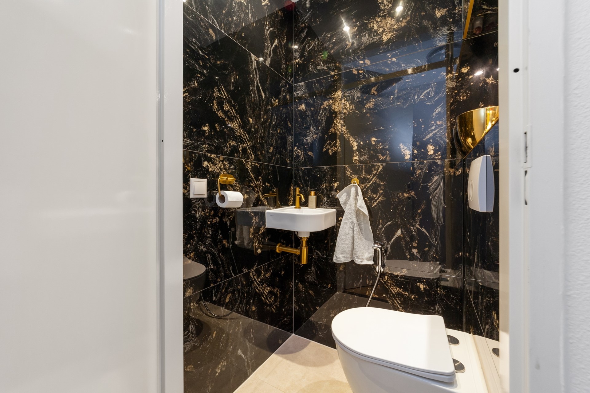 Upon entering, you will find the hallway with the meter cupboard and a modern restroom equipped with a wall-hung toilet and a small sink.