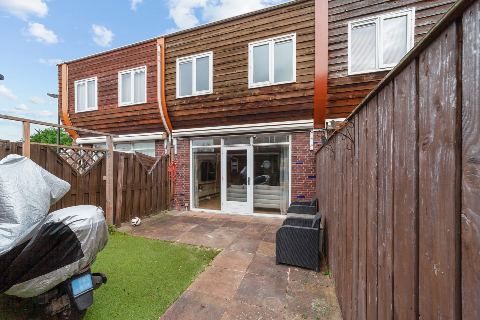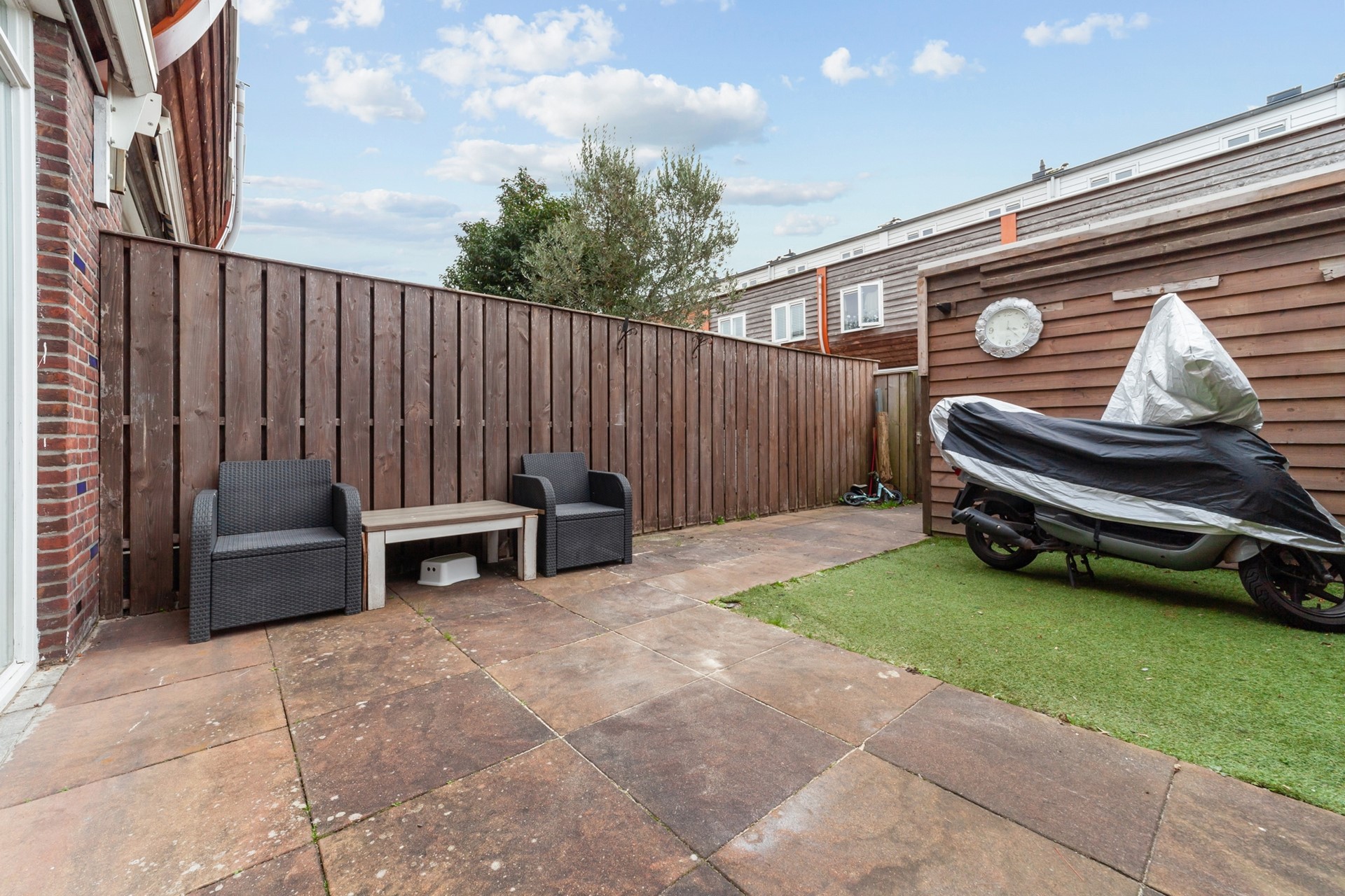 De onderhoudsvriendelijke achtertuin ligt op het zonnige zuiden, waardoor u vrijwel de hele dag van de zon kunt genieten. Extra voorzieningen: buitenkraan, achterom en vrijstaande houten berging voorzien van elektra.