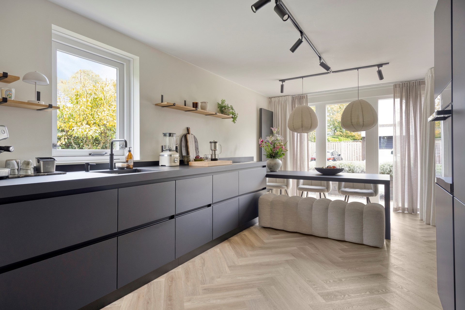 Bij binnenkomst komt u via de hal, met de deur naar de garage, de trapopgang en het toilet, in de sfeervolle leefkeuken. En wat een eyecatcher is dat! Zo goed als nieuw (2022), van het solide merk Tieleman, uitgevoerd in modern mat carbonzwart en voorzien van alle denkbare inbouwapparatuur als een vaatwasser, een koelkast, een vrieskast, een oven en een Quooker. Er wordt gekookt op een inductiekookplaat van Bora, met geïntegreerde afzuiging. De grote raampartij zorgt voor veel lichtinval, en de gezellige zithoek maakt dit tot de perfecte plek om samen te ontbijten of ’s avonds met een glas wijn de dag door te nemen. Aansluitend is de woonkamer. Deze is tuingericht en heeft een schuifpui naar het terras, waardoor binnen en buiten mooi in elkaar overlopen. De strakke visgraat pvc-vloer, de glad gestuukte wanden en de houtkachel maken dit tot een bijzonder prettige leefruimte; licht, warm, eigentijds en uitnodigend.