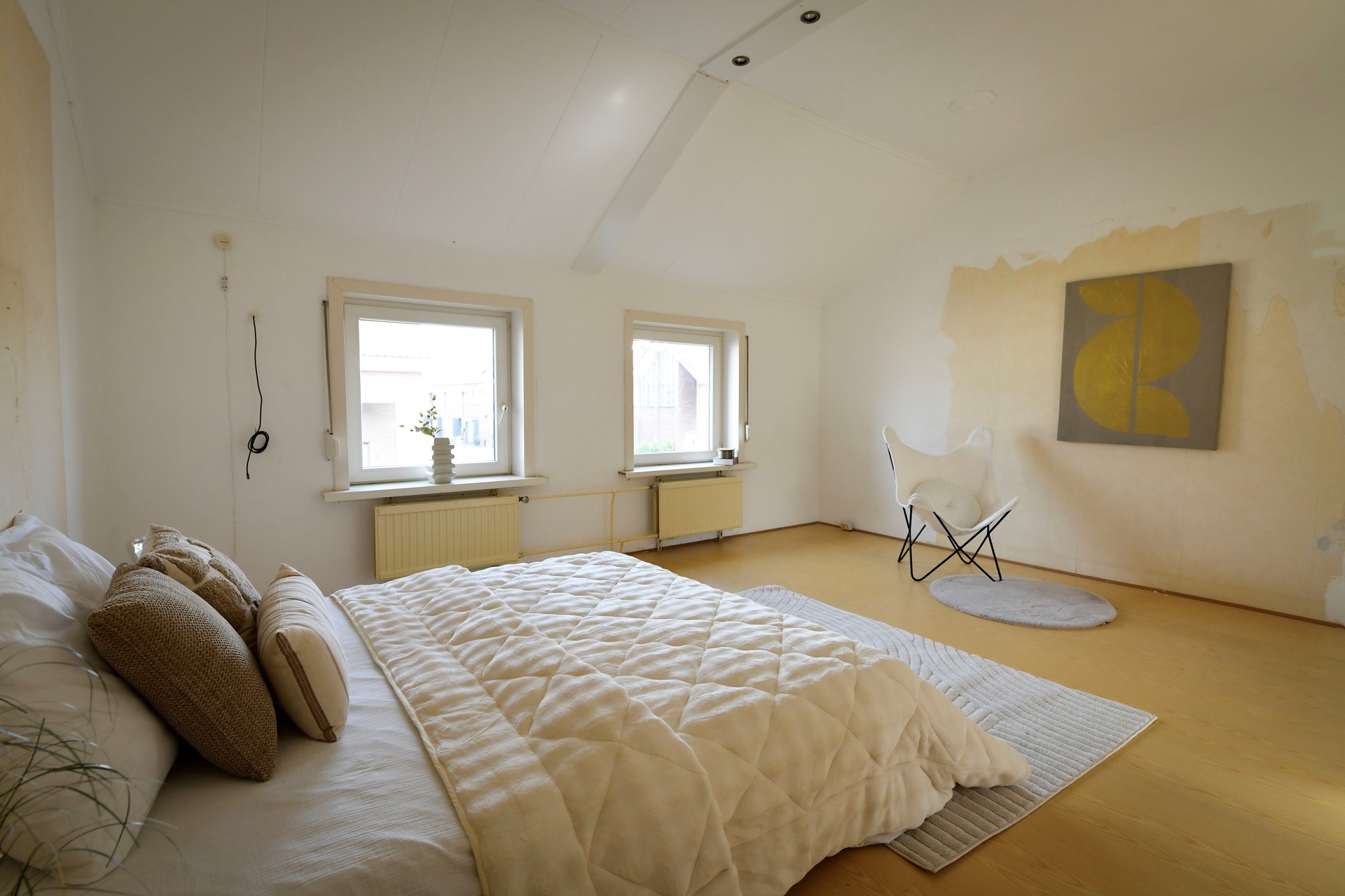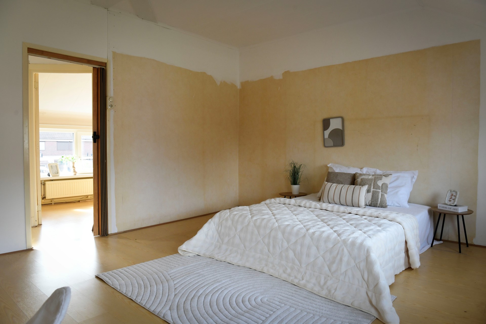 Slaapkamer 1: 5,20 x 4,20 met laminaatvloer, inbouwspots en deur naar achtertuin.