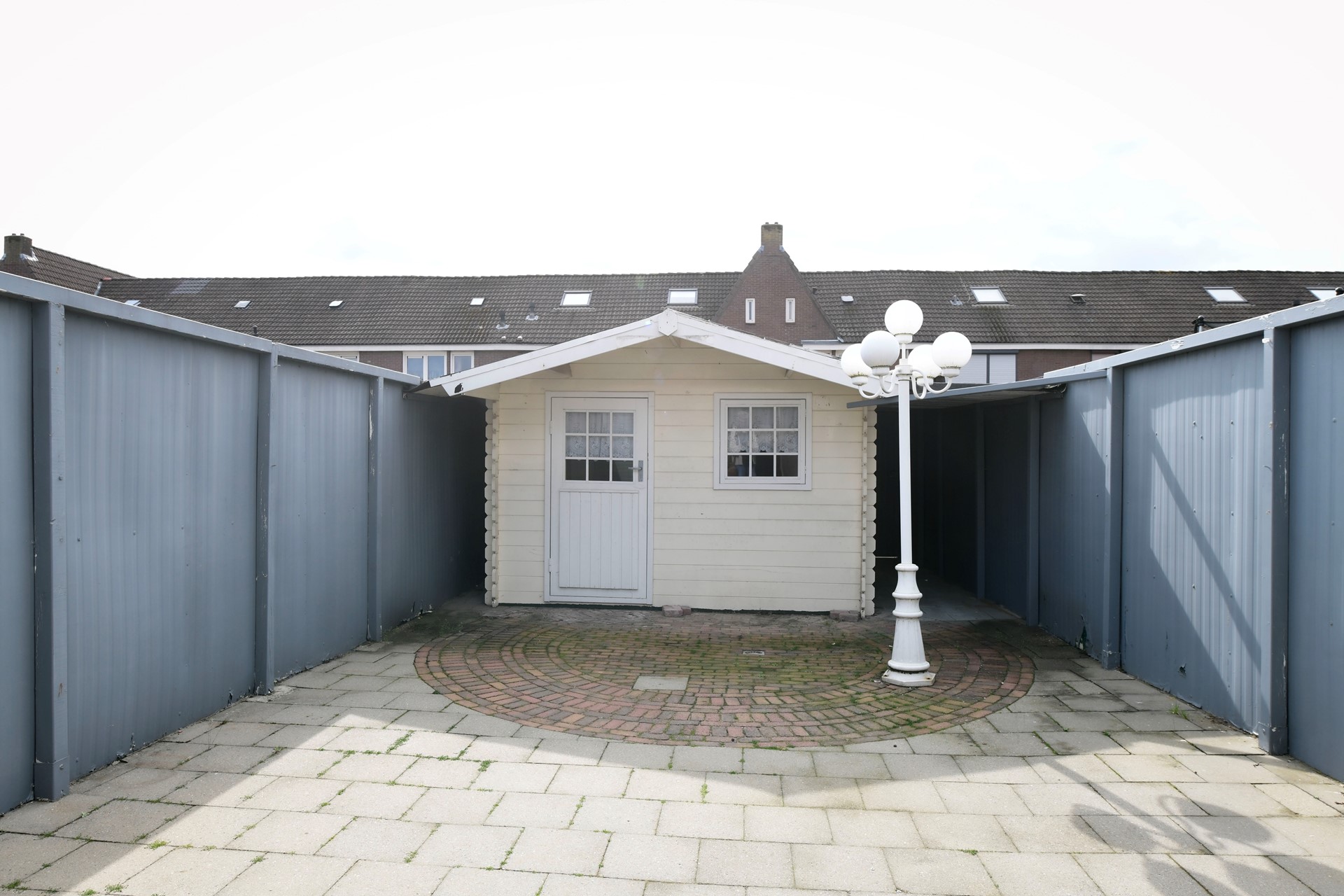 Achtertuin 12,40 x 4,90 is geheel bestraat en voorzien van stenen buitenberging 2,70 x 2,00 met elektriciteit, schutting, verlichting, overkapping 4,80 x 3,65, houten tuinhuisje 3,05 x 1,85, overdekte stalling met verlichting, en achteringang.