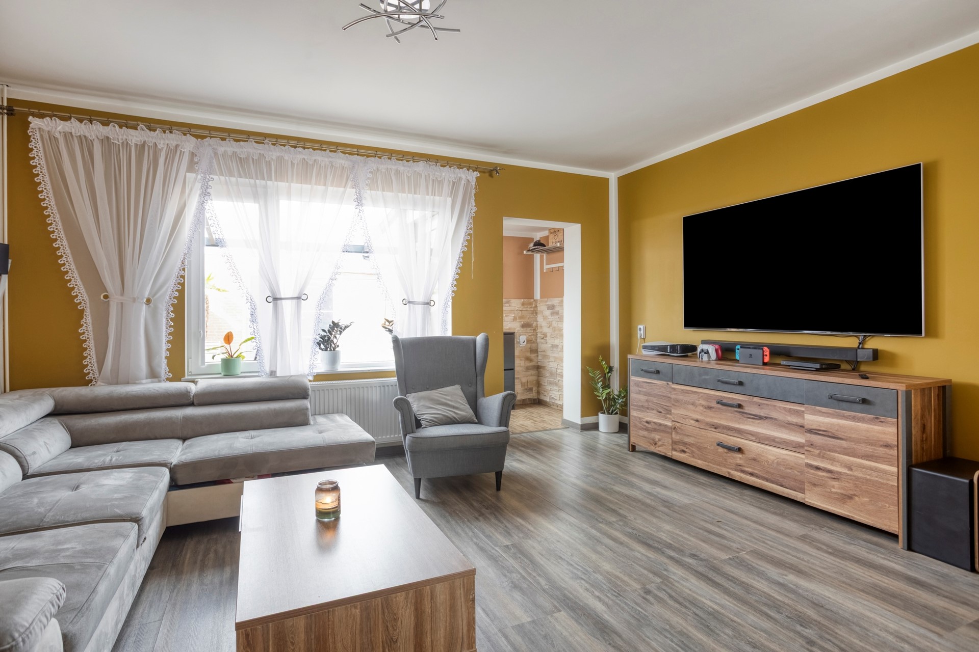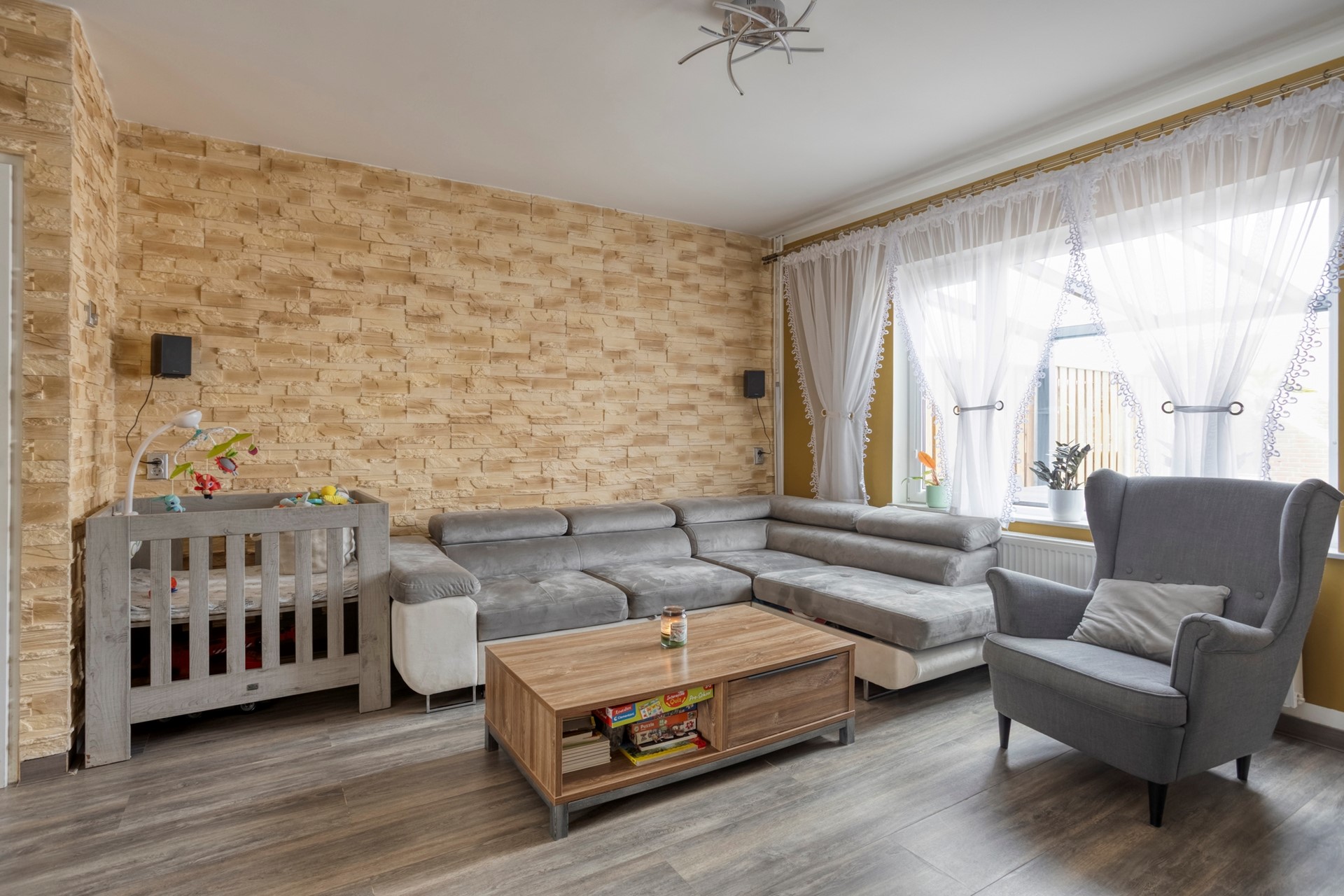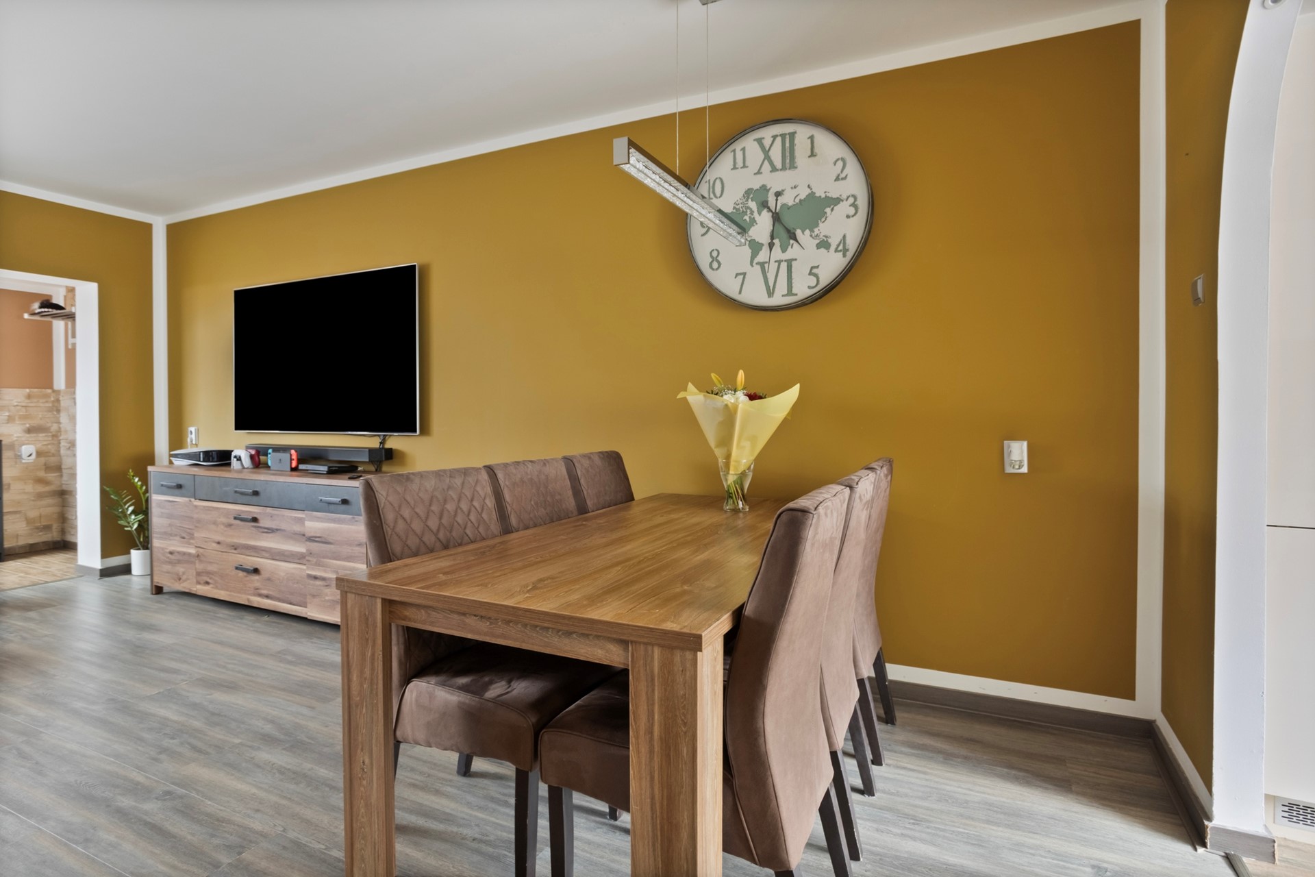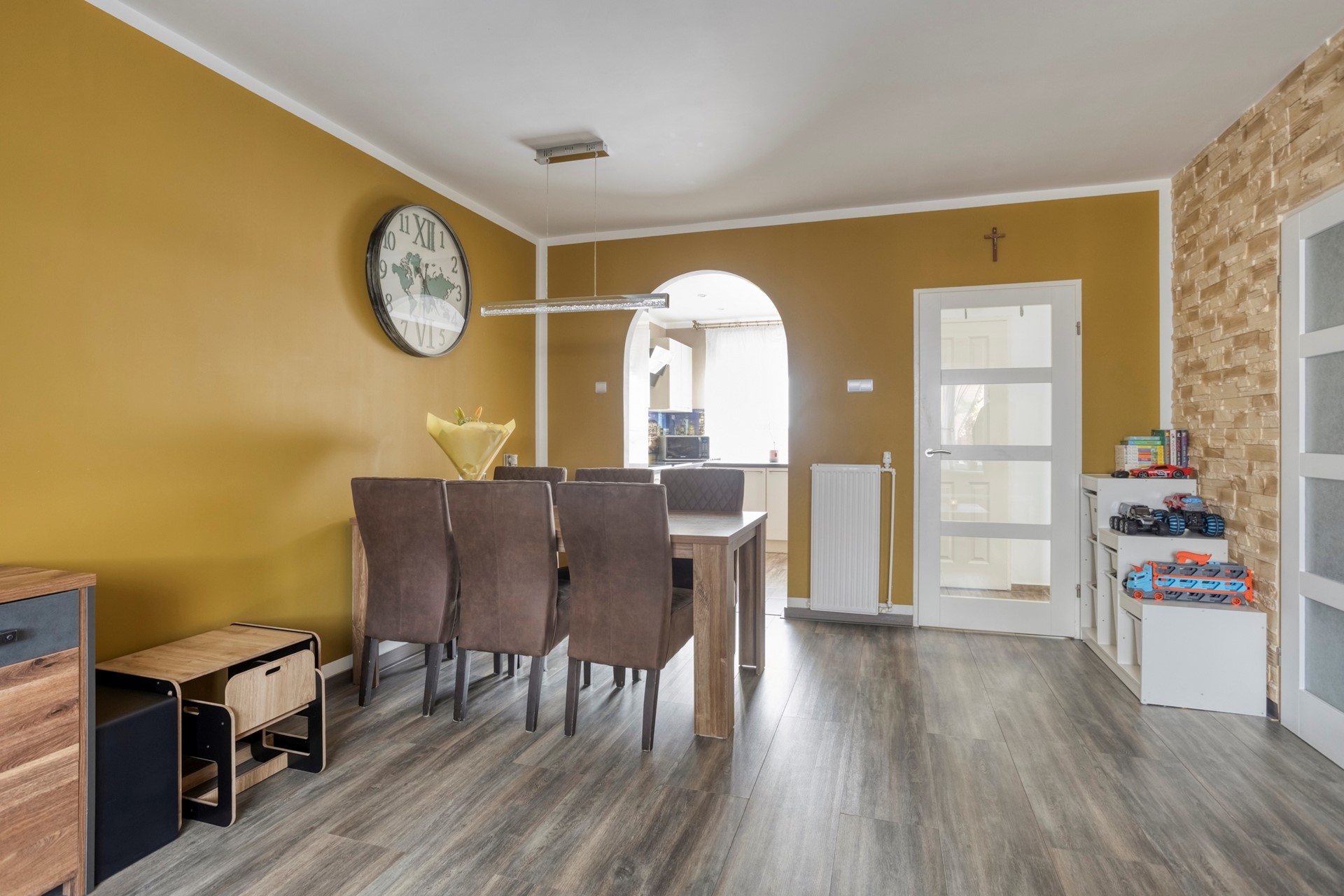 De lichte woonkamer beschikt over een praktische trapkast, het laminaat is vanuit de hal doorgetrokken woonkamer en keuken De wanden in de woonkamer zijn afgewerkt met steenstrips.