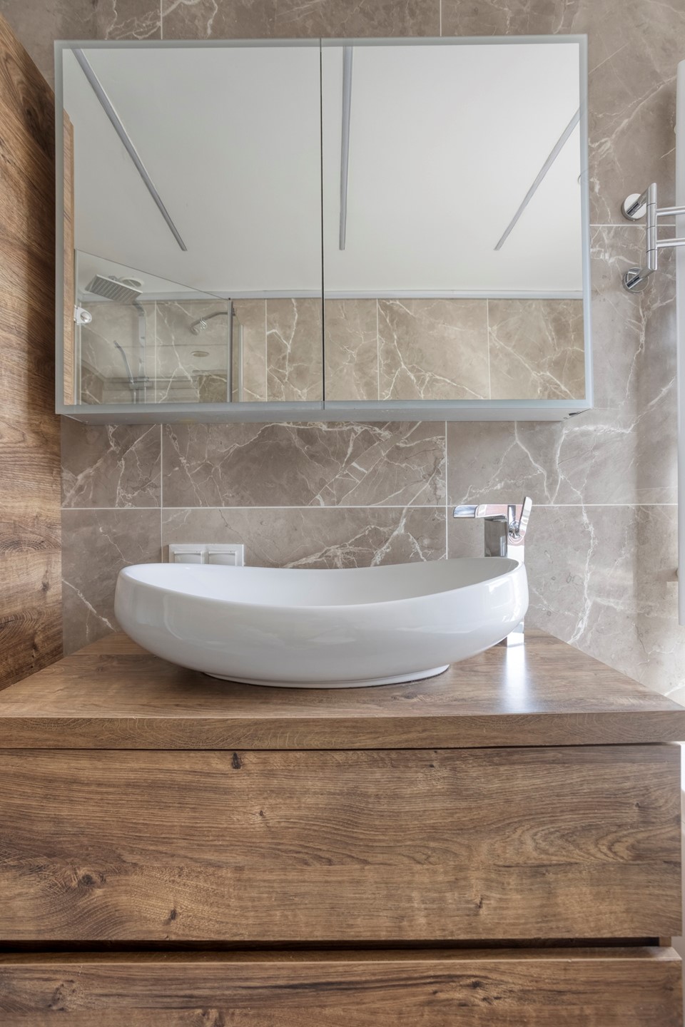 De smaakvolle badkamer is schitterend afgewerkt. De badkamer is volledig betegeld en beschikt over een luxe bubbelbad, inloopdouche, toilet en badkamermeubel.