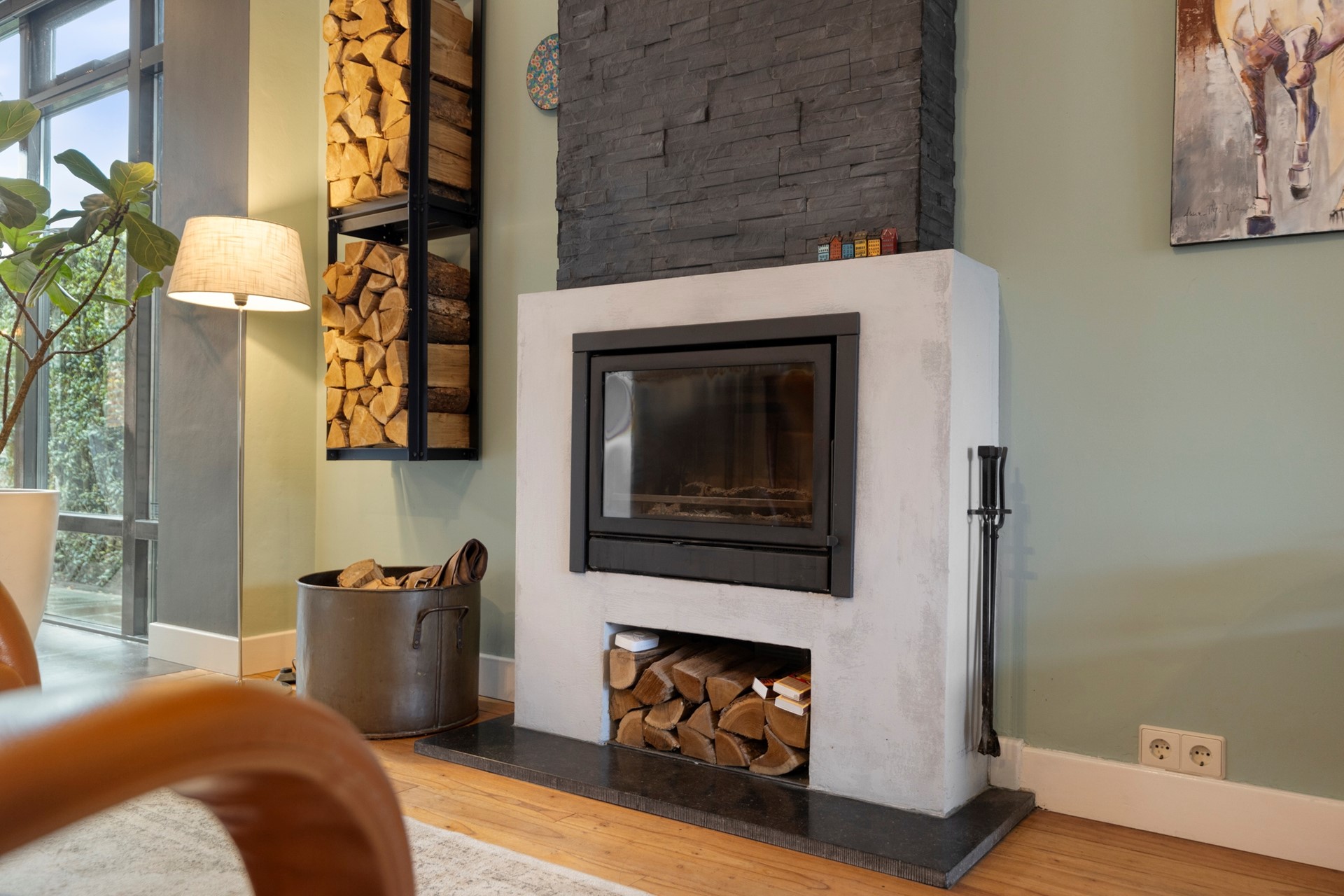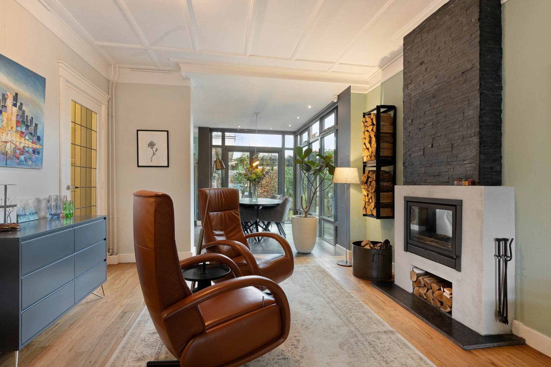 De sfeervolle woonkamer is voorzien van een grote erker, een hoog origineel plafond met geluids- en brandwerende isolatie, glas-in-looddeuren met originele omlijsting, een houten planken vloer met hoge plinten en een moderne houthaard met design rek voor haardhout.