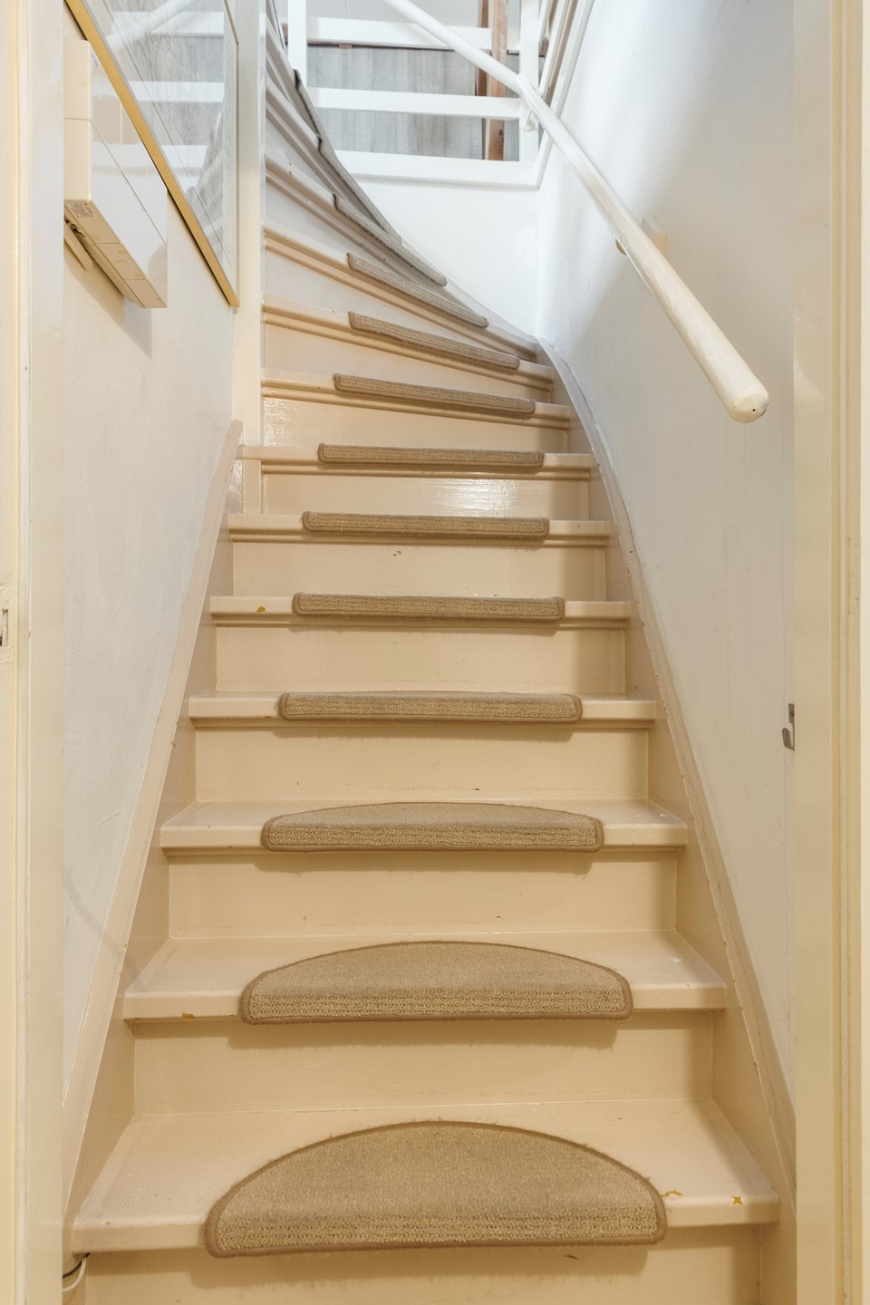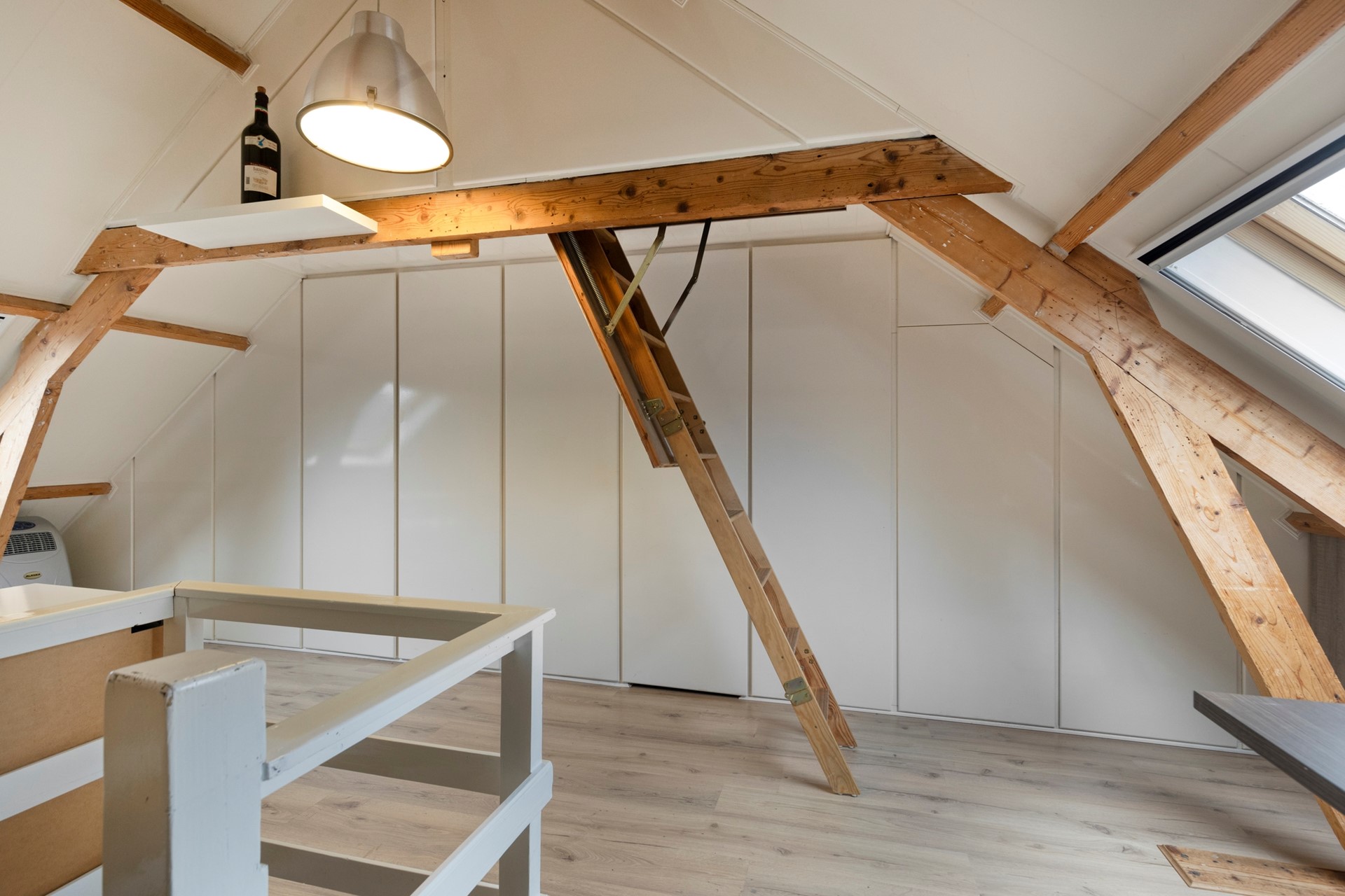 De tweede verdieping is bereikbaar via een vaste trap met afsluitbare deur en biedt een grote, open slaap- of werkruimte met veel licht en karakter.