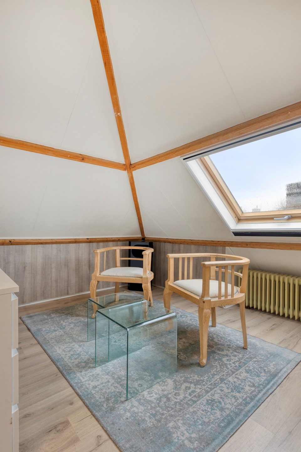 De zichtbare originele houten balken geven deze verdieping een sfeervolle en authentieke uitstraling, waardoor de ruimte zich uitstekend leent als master bedroom, thuiskantoor of atelier.