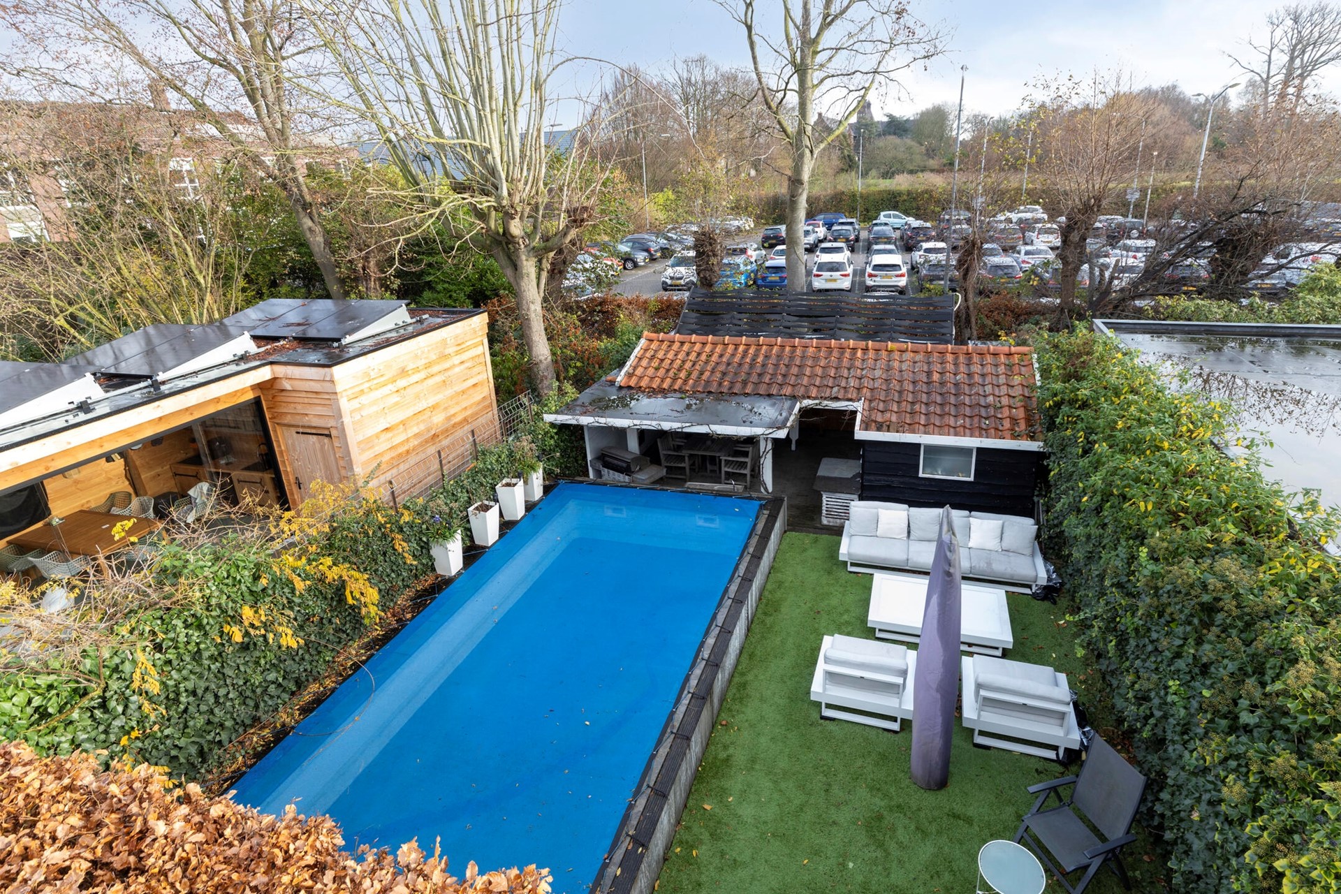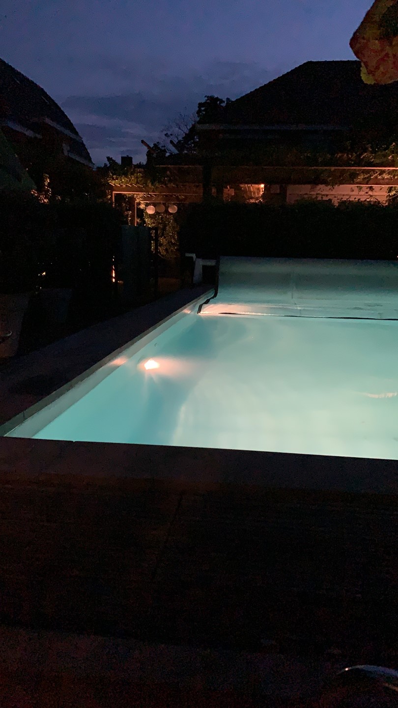 Achter in de tuin bevindt zich een grote, volledig omsloten en verwarmde overkapping, ideaal voor gebruik in alle seizoenen. Daarnaast is er een verwarmd zwembad, verwarmd via een warmtepomp of zonnecollectoren, wat het buitenleven een luxe resortgevoel geeft.