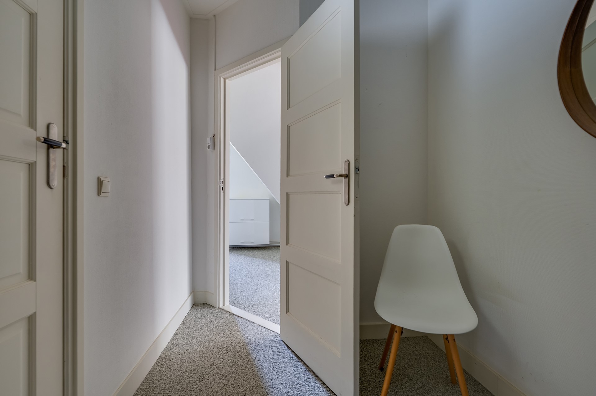 Op de verdieping kom je op een ruime overloop met ook weer een karakteristieke uitstraling, hier bevindt zich ook de opstelplaats van de CV-ketel (2016, Intergas). De ruime slaapkamer is aan de voorzijde van de woning. Verder is er op deze etage een grote inloopkast en aansluitend de ruime badkamer, welke is voorzien van een douchecabine, wastafelmeubel en opstelplaats voor de wasmachine. Ten slotte is er nog een vliering/zolder met extra bergruimte.