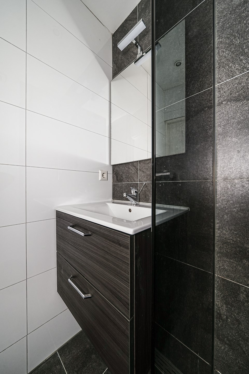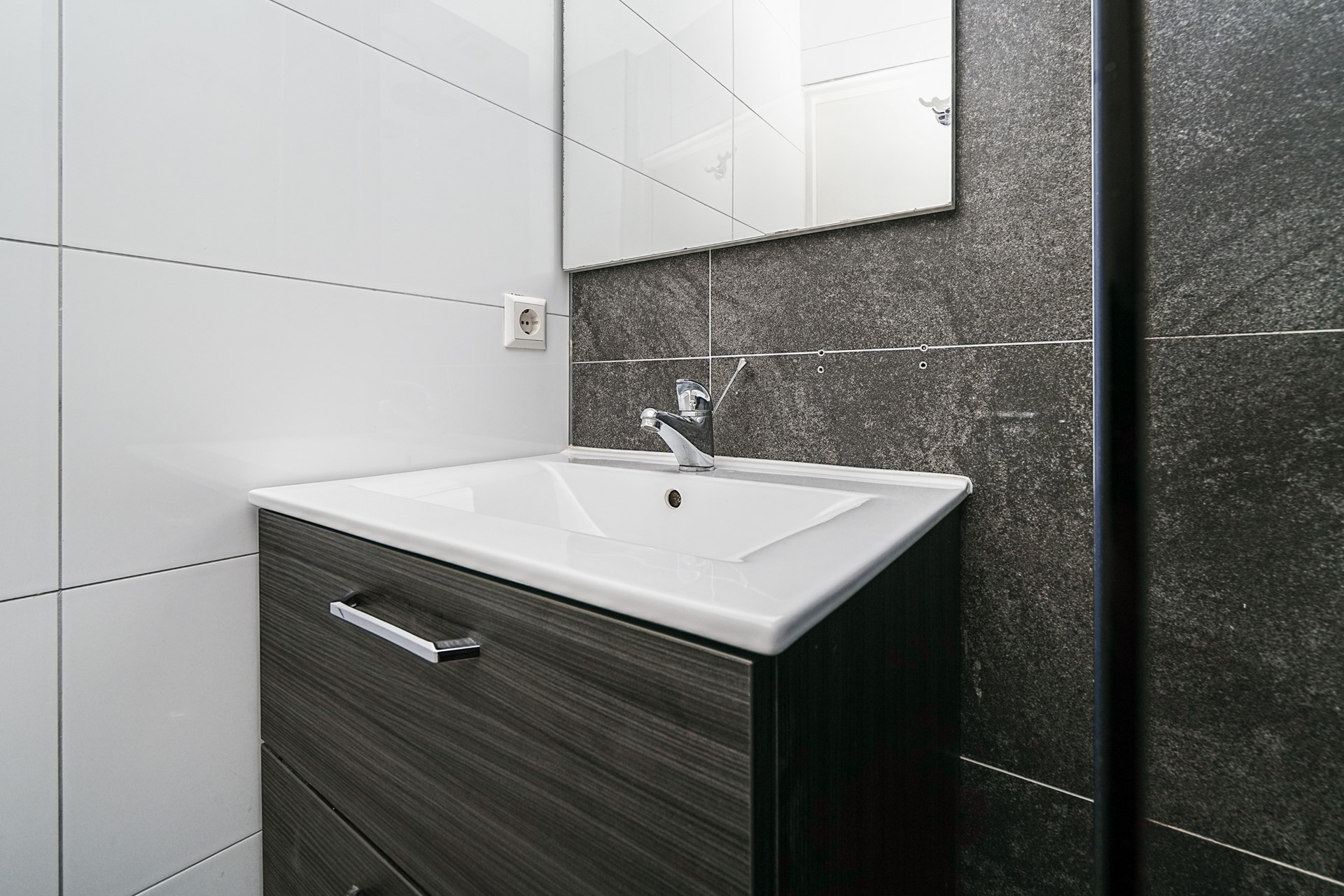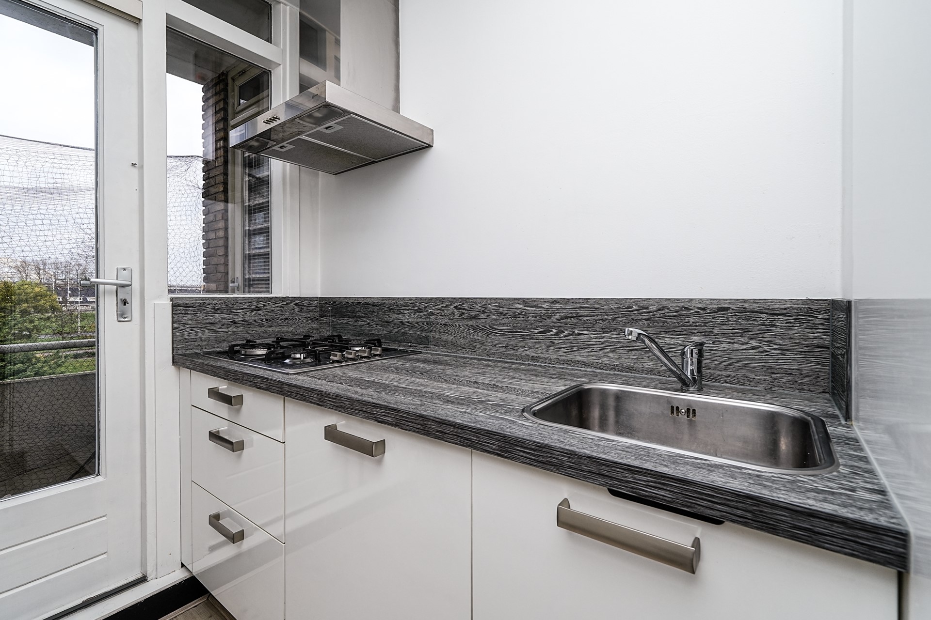 De keuken, centraal in de woning gelegen, is praktisch ingedeeld en biedt toegang tot het tweede balkon aan de voorzijde. De badkamer vanuit de hal bereikbaar is uitgerust met douche en wastafel, en er is een separaat toilet. De woning beschikt verder over twee goed bemeten slaapkamers beide aan de voorzijde van het appartement gelegen.