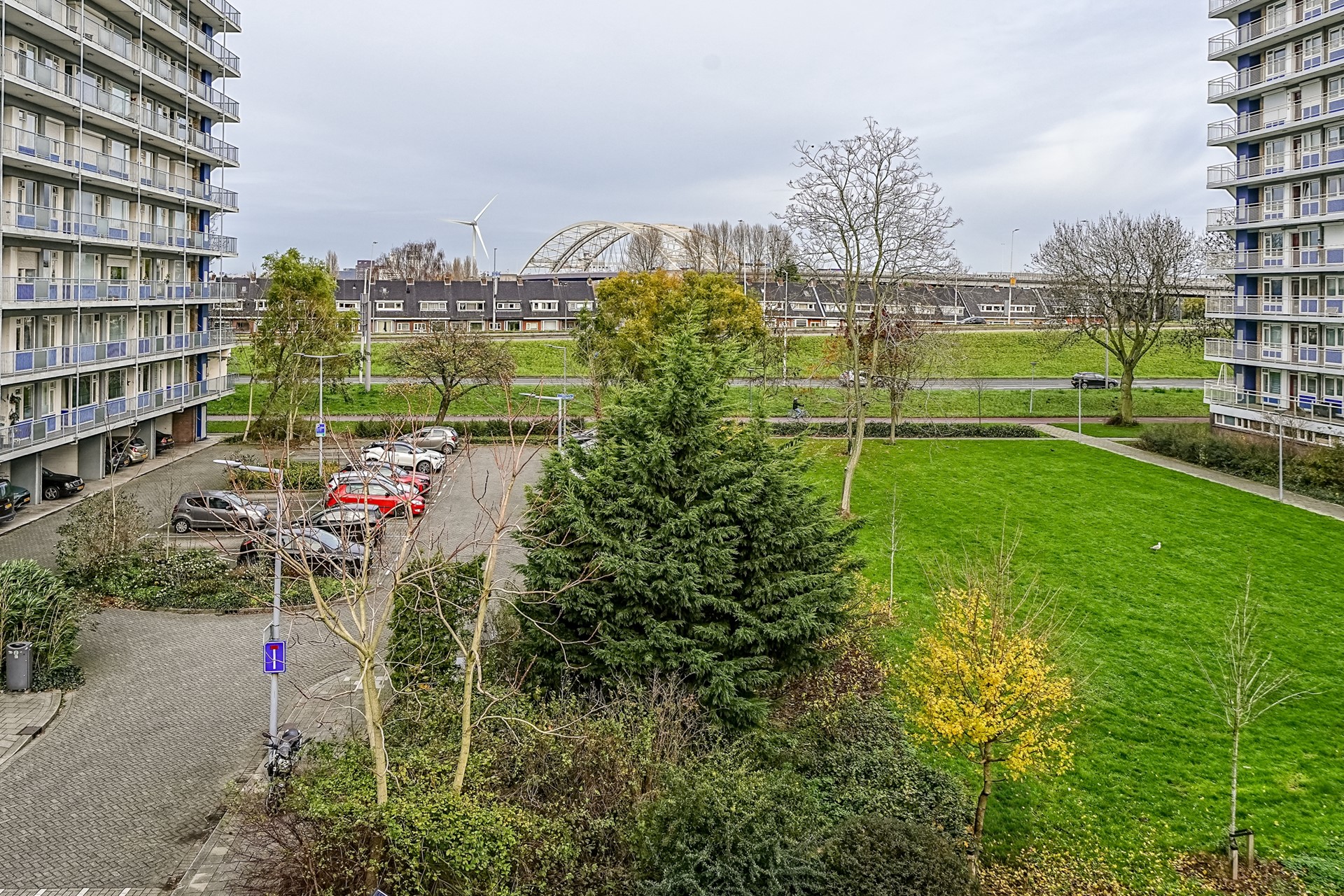 Het balkon aan de voorzijde is 1,84 meter breed en is totaal 1,75 m2- en ligt op het Noorden. U heeft vrij uitzicht vanaf het balkon op de Van Brienenoordbrug.