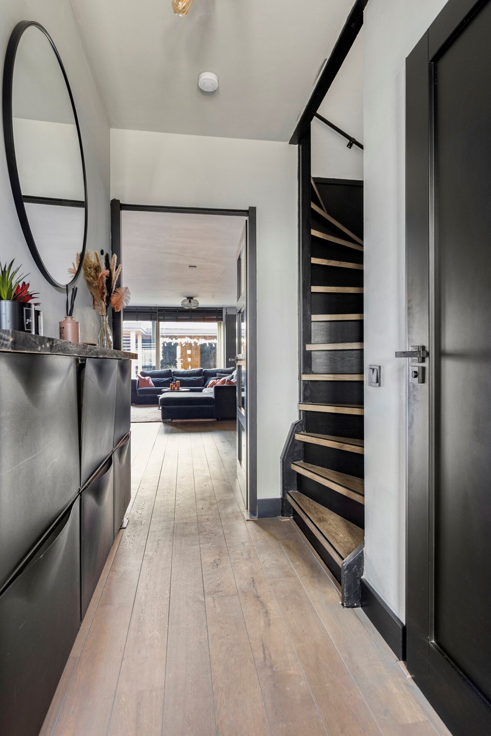 De houten vloer in de woonkamer is in 2024 professioneel geschuurd en opnieuw gelakt, wat zorgt voor een frisse en verzorgde uitstraling.