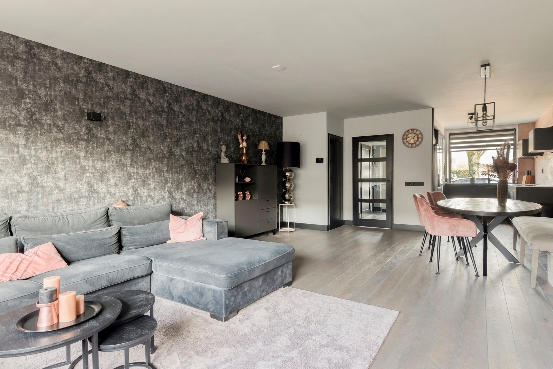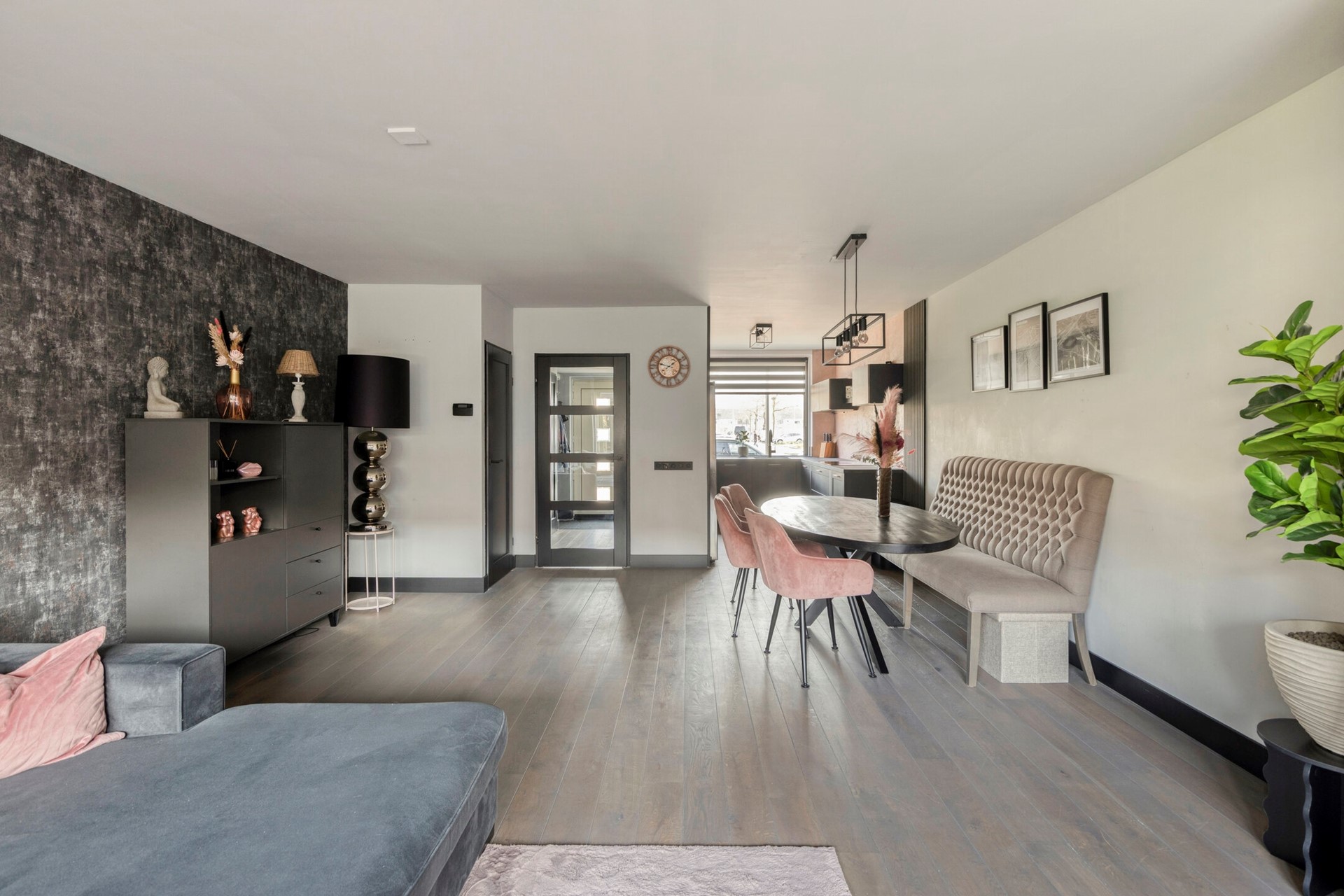 Vanuit de hal betreedt u de royale uitgebouwde woonkamer. Door de uitbouw is hier een bijzonder ruime en lichte leefruimte ontstaan met voldoende plaats voor zowel een comfortabele zithoek als een grote eettafel. De grote raampartijen aan de achterzijde zorgen voor veel daglicht en een prettige verbinding met de tuin.