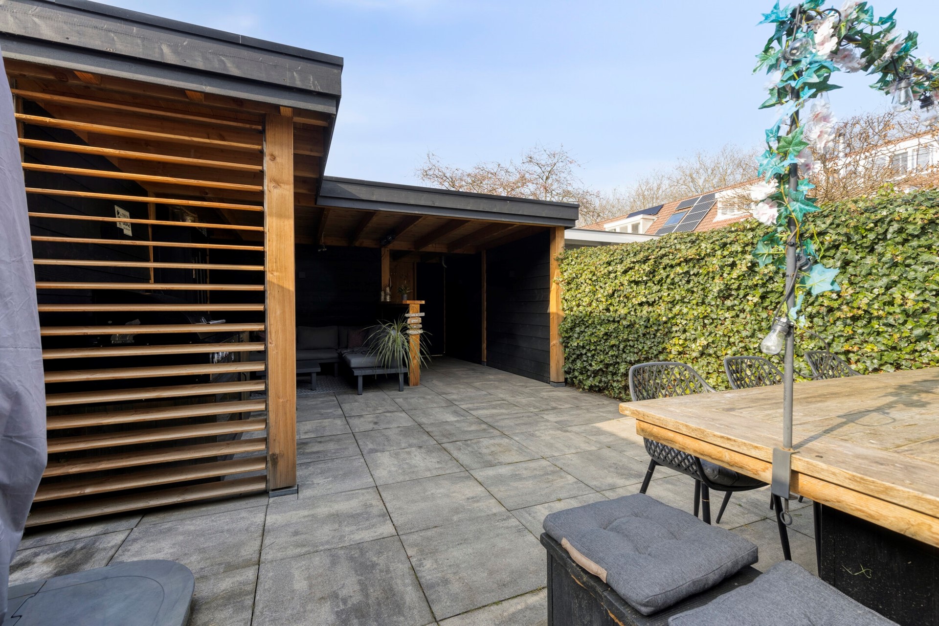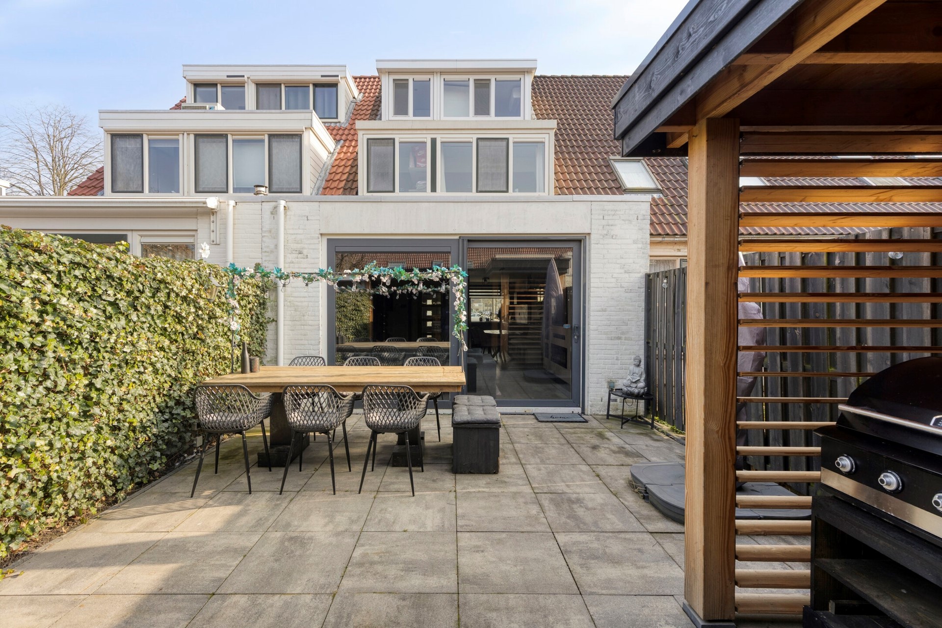 De tuin is verzorgd aangelegd en beschikt over een mooie overkapping (2025), waardoor u ook bij minder goed weer comfortabel buiten kunt zitten.