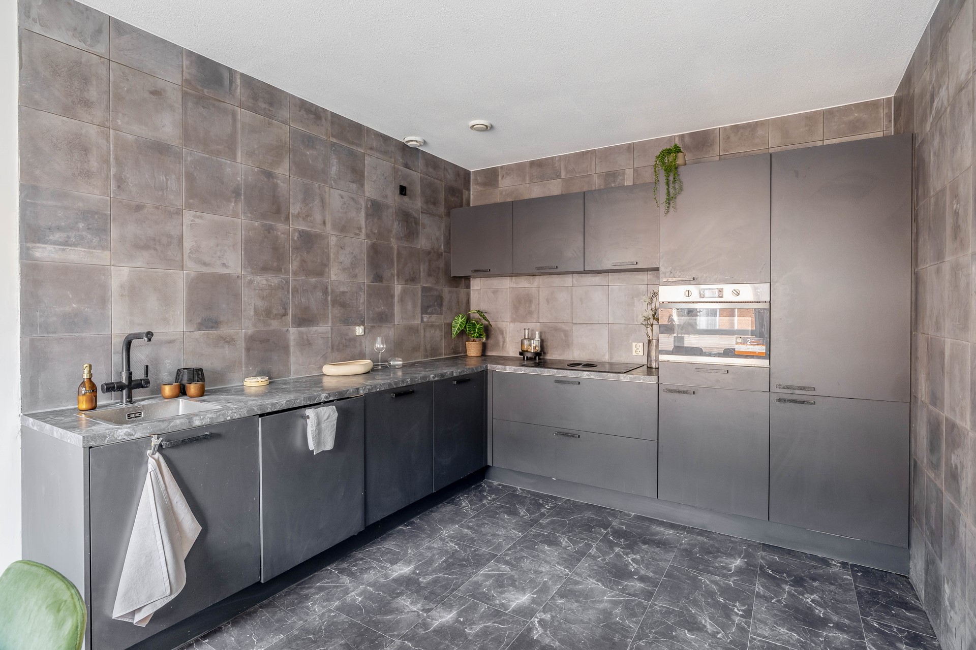 De woonkeuken is een echte leefkeuken waar je met gemak uren doorbrengt. Je beschikt over volop kastruimte dankzij de onder- en bovenkasten en de keuken is uitgerust met een vaatwasser, inductiekookplaat met geïntegreerd afzuigsysteem, combi-oven en koelkast. Of je nu snel iets klaarmaakt of uitgebreid kookt voor vrienden: hier kan het allemaal.