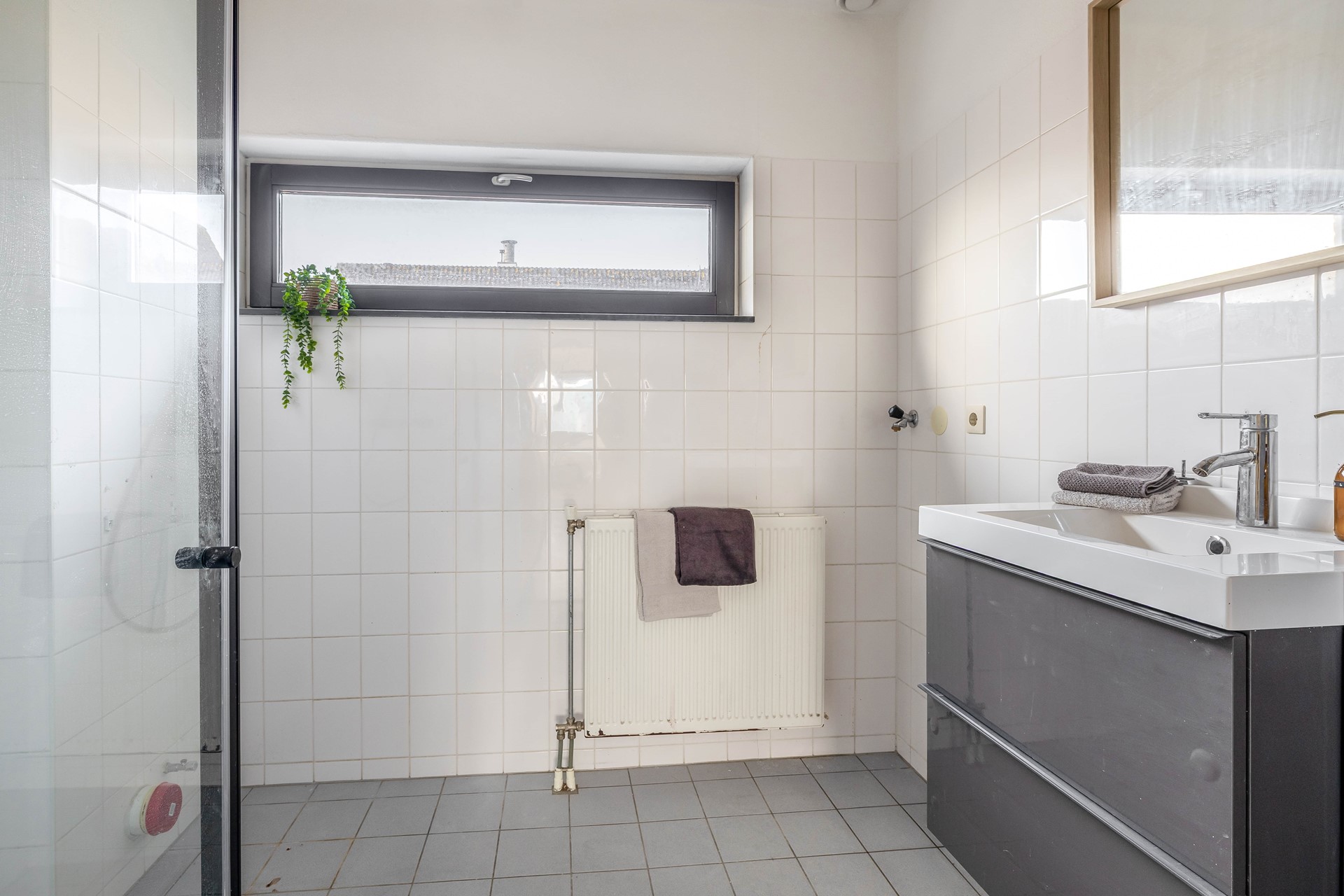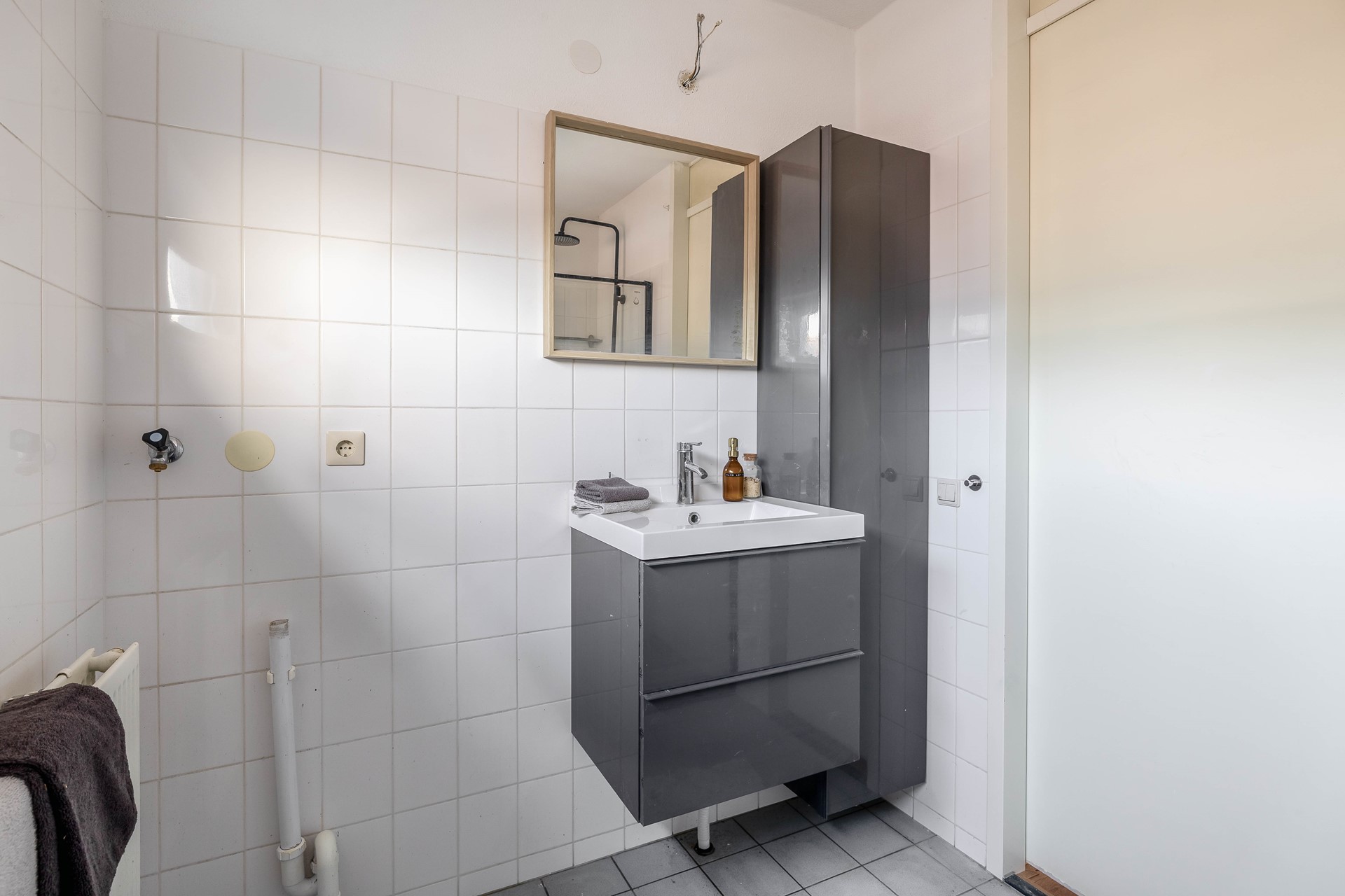 De badkamer is simpel maar functioneel uitgevoerd en voorzien van een inloopdouche, wastafel en wasmachineaansluiting. Daarnaast is er een aparte bergkast waar de CV-ketel netjes is opgesteld.