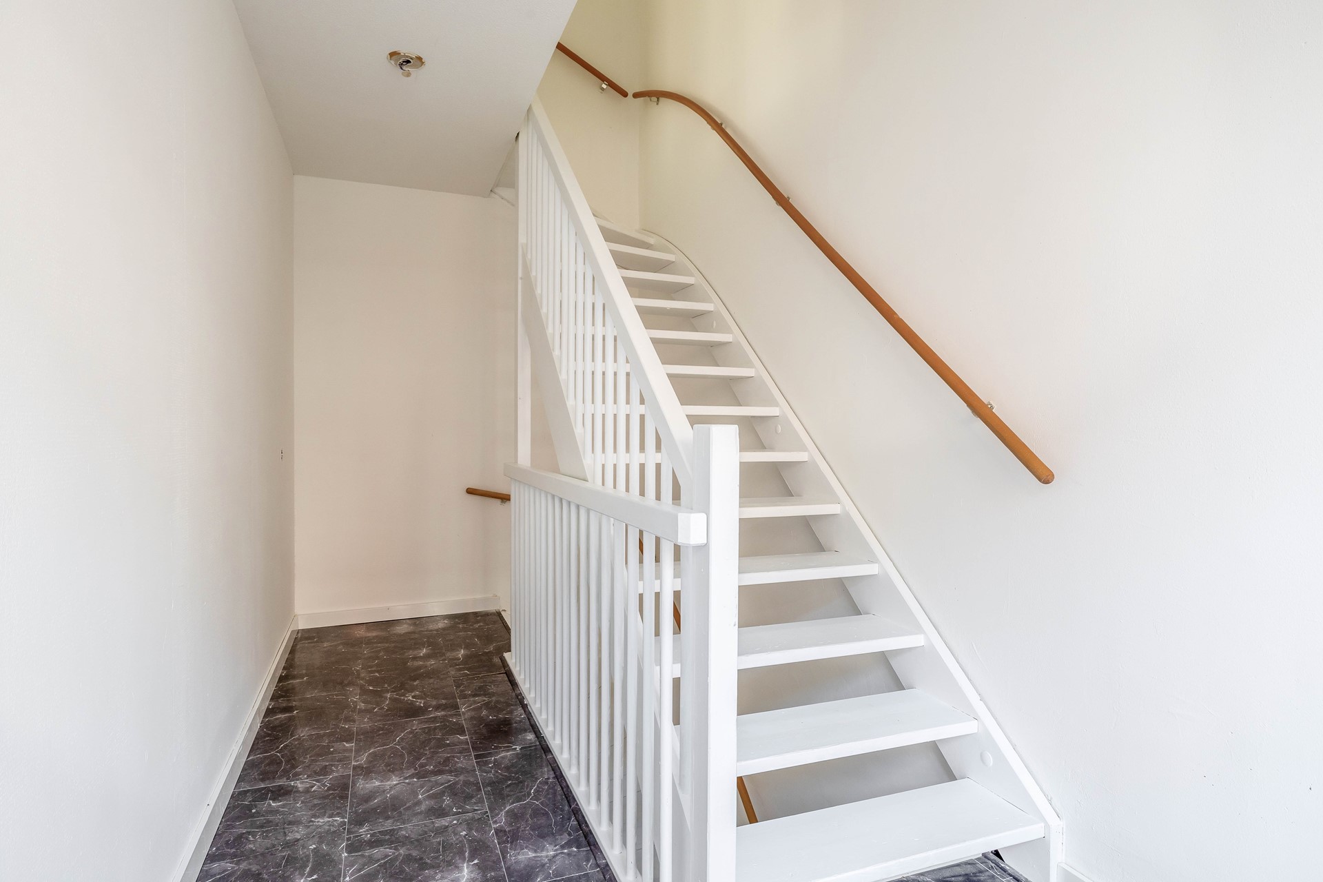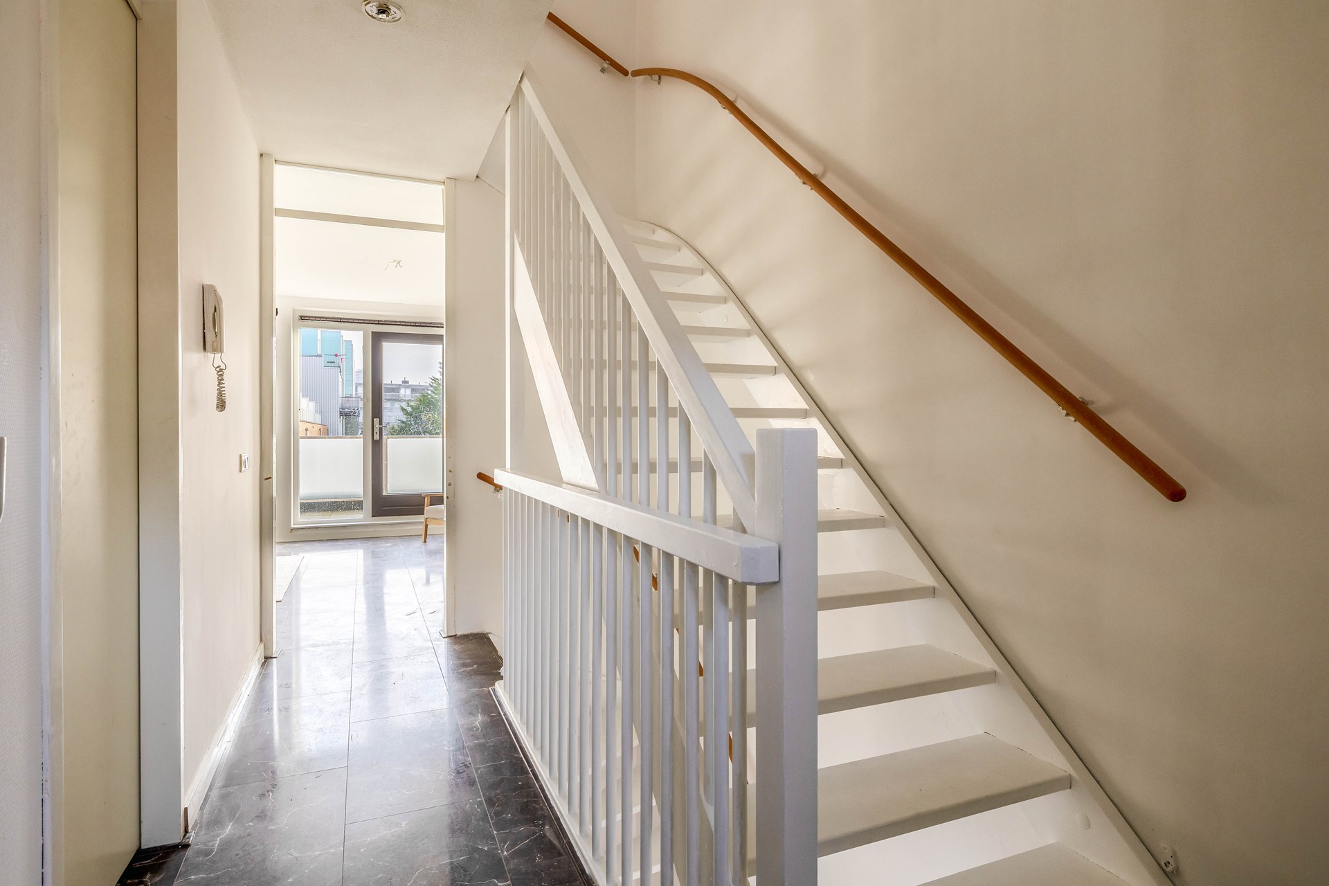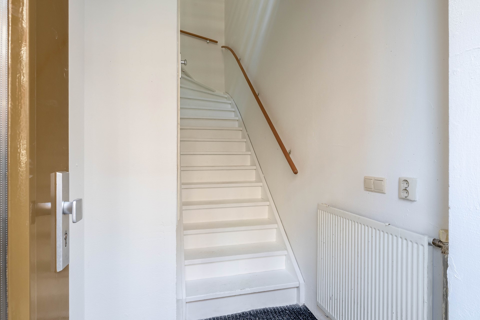 Je komt binnen in de hal met meterkast en een dubbele trapopgang naar de tweede verdieping.