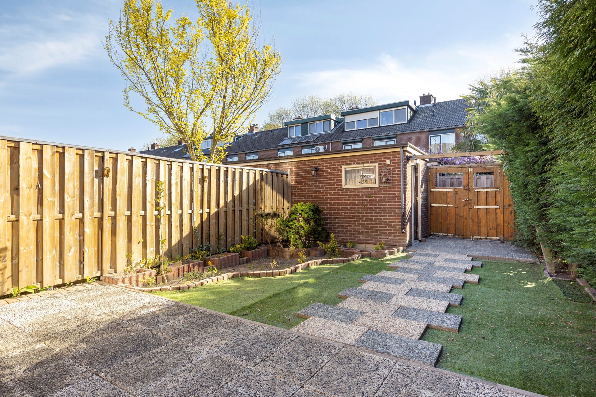 Via de woonkamer bereik je de achtertuin, gelegen op het oosten, waar je in de ochtend en vroege middag heerlijk van de zon kunt genieten. De tuin is voorzien van een betegeld terras, buitenkraan en een stenen, onderheide berging met elektra.