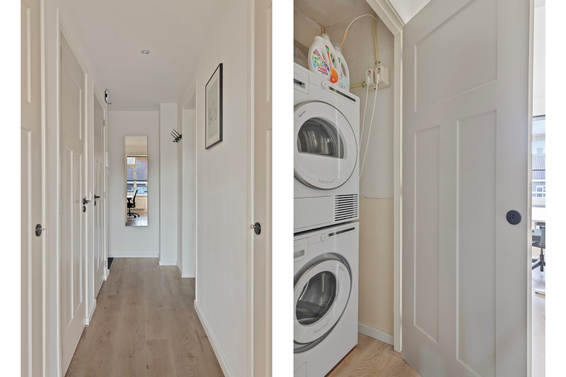 Daarnaast is er in de hal een praktische inbouwkast met aansluitingen voor je wasmachine en droger.