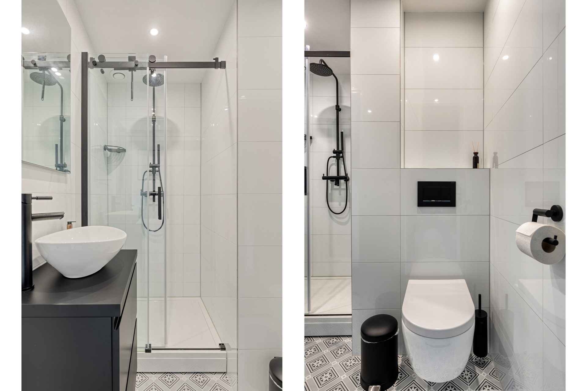 De hal geeft ook toegang tot de badkamer, welke modern en volledig betegeld is. De badkamer is voorzien van een douchecabine, wastafelmeubel met waskom en een hangend toilet.
