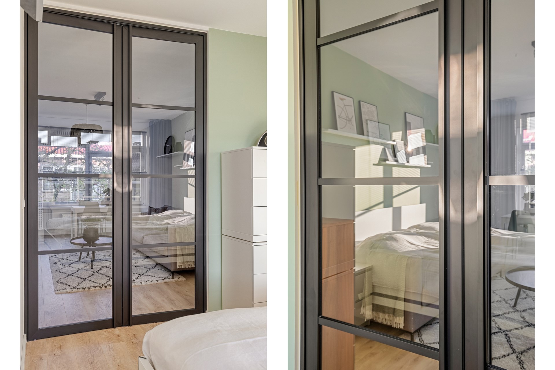 Dankzij de stijlvolle zwarte stalen taatsdeuren naar de ruime slaapkamer, voelt de woning extra ruim aan.