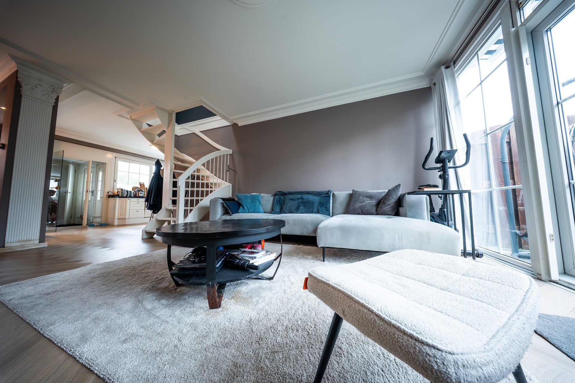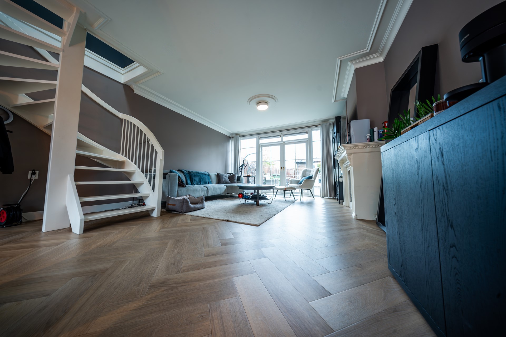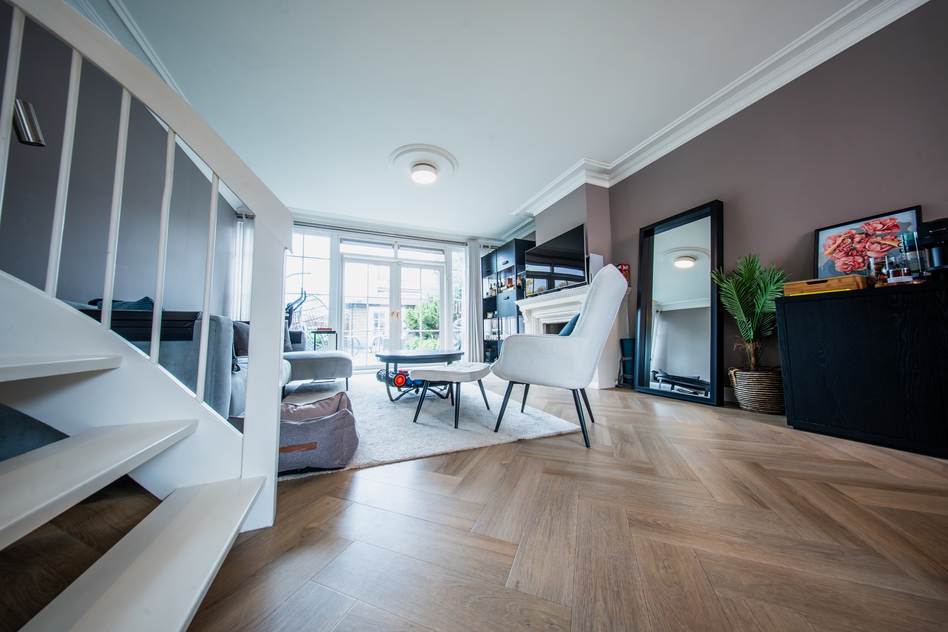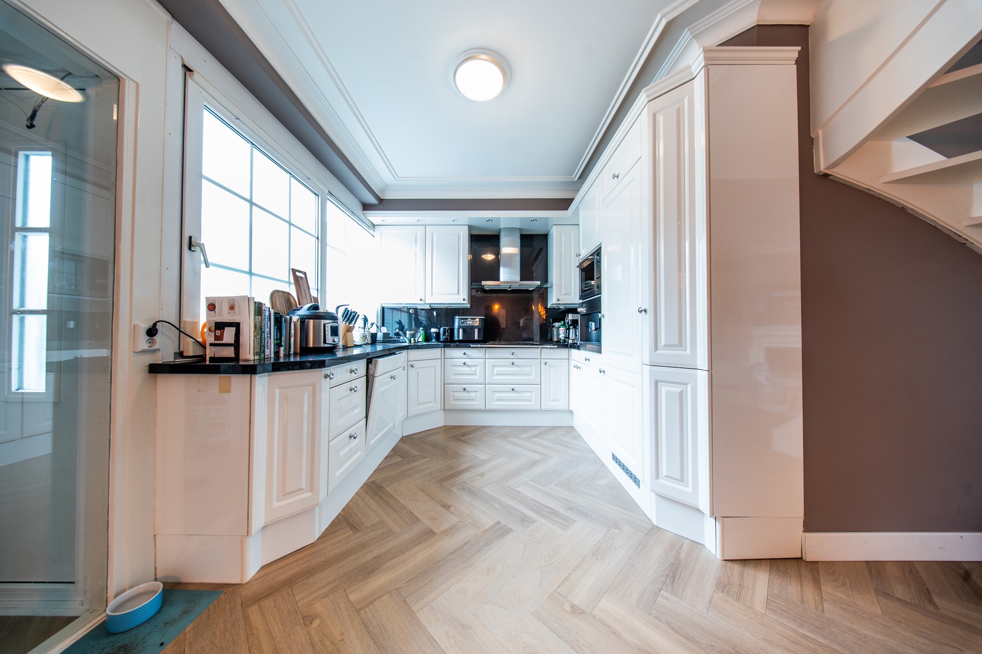 De woonkamer is heerlijk licht door de grote ramen en heeft strak afgewerkte plafonds met ornamenten en inbouwspots. De open keuken, circa 8 jaar oud, is modern uitgevoerd en voorzien van diverse inbouwapparatuur. De open opstelling maakt het een gezellige ruimte waar koken, eten en samenzijn mooi samenkomen.