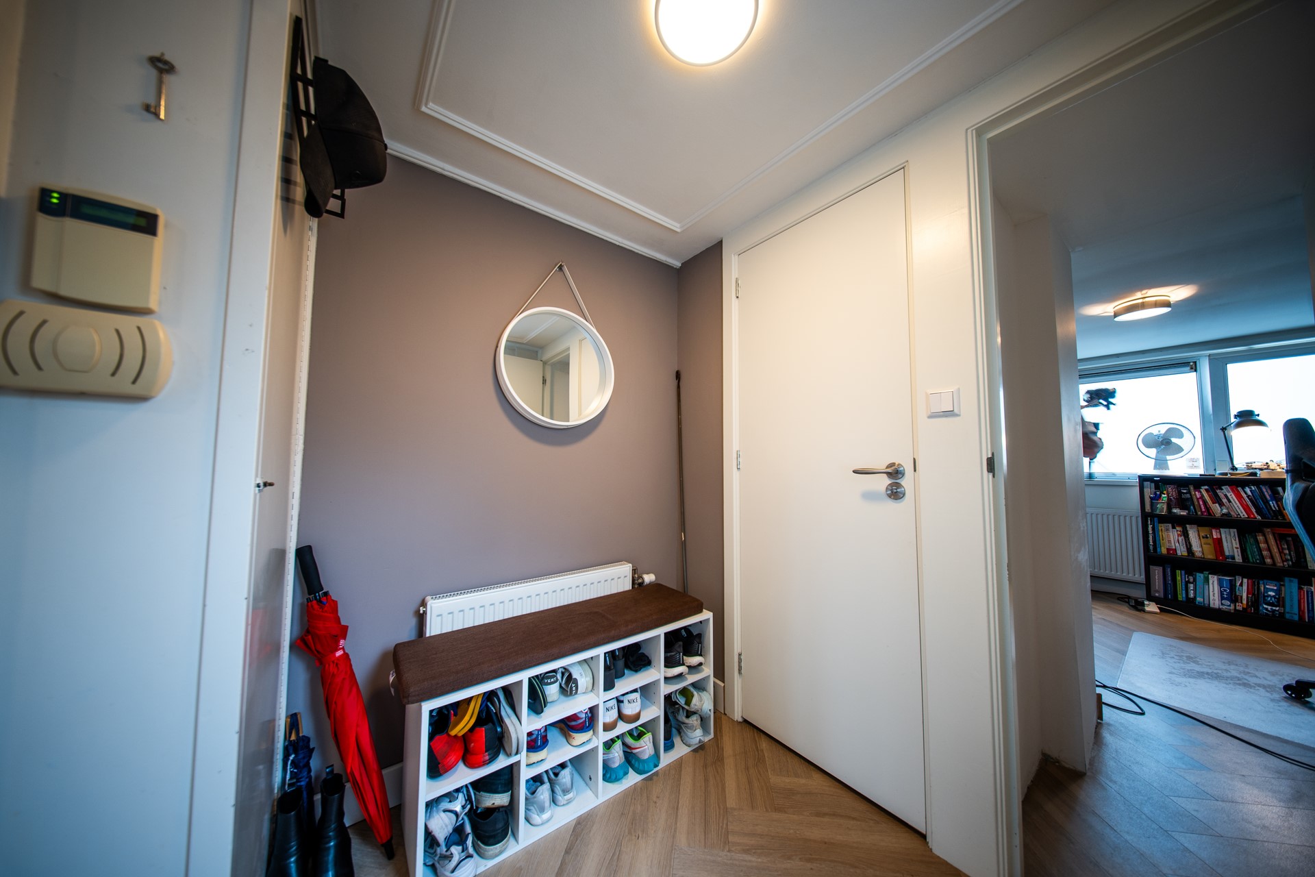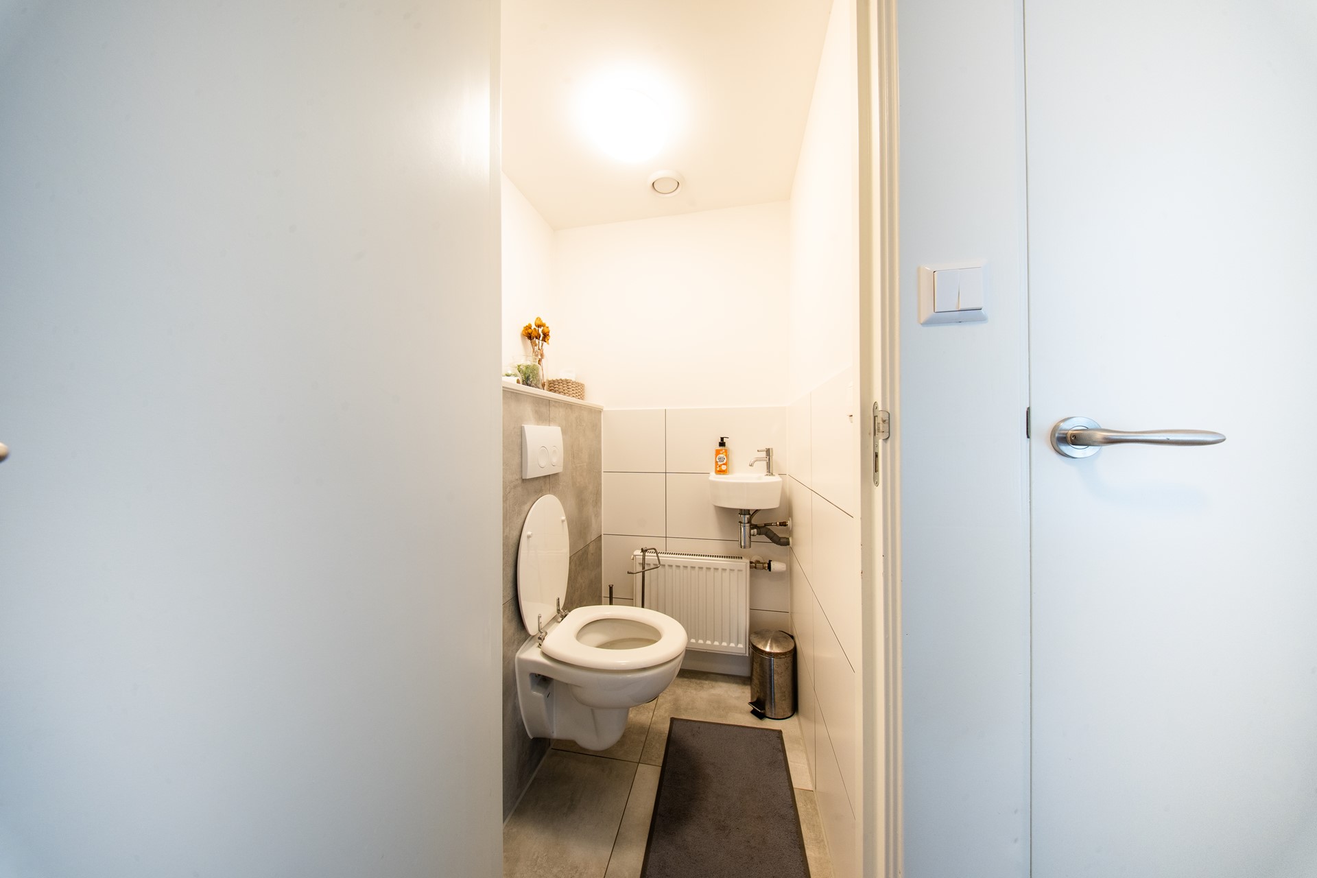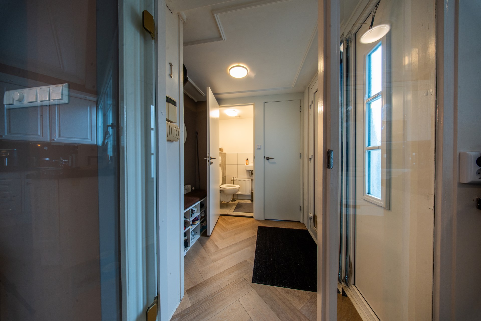 Je komt binnen in de hal, waar zich de toiletruimte en een praktisch kantoortje bevinden; ideaal voor thuiswerken of studie. Vanuit de hal stap je binnen in de ruime woonkamer met open keuken.