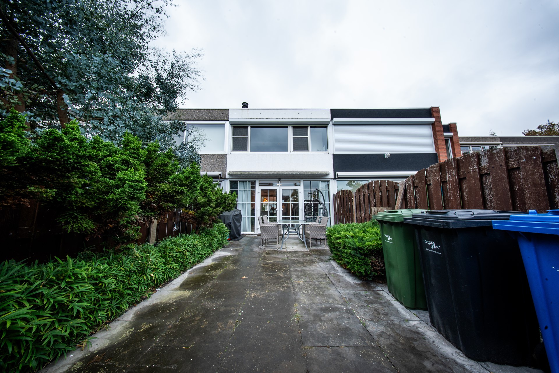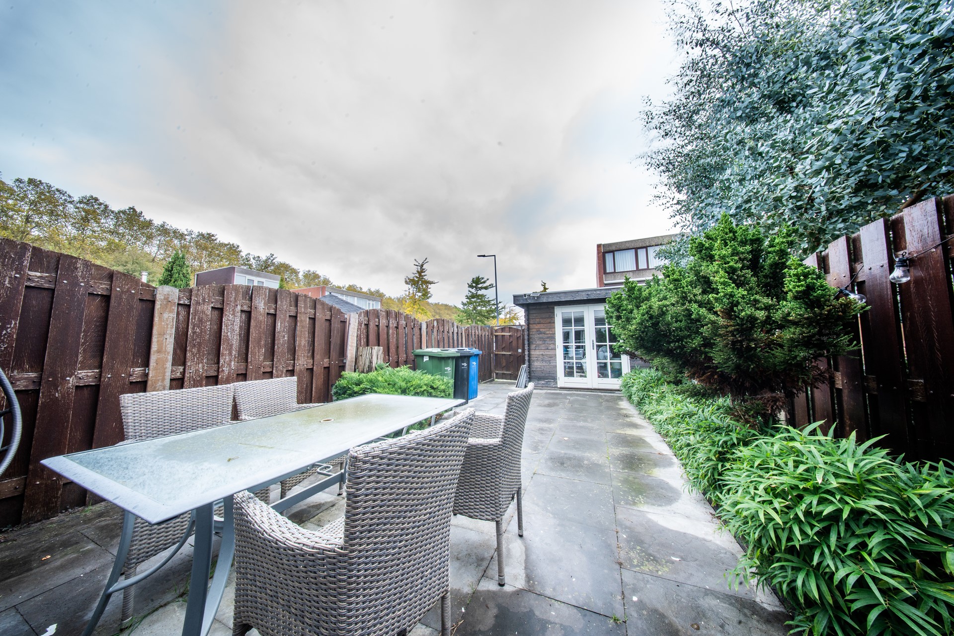 Via de woonkamer bereik je de fraai aangelegde achtertuin met een prachtige overkapping (4 jaar oud), waar je het hele jaar door comfortabel buiten kunt zitten.